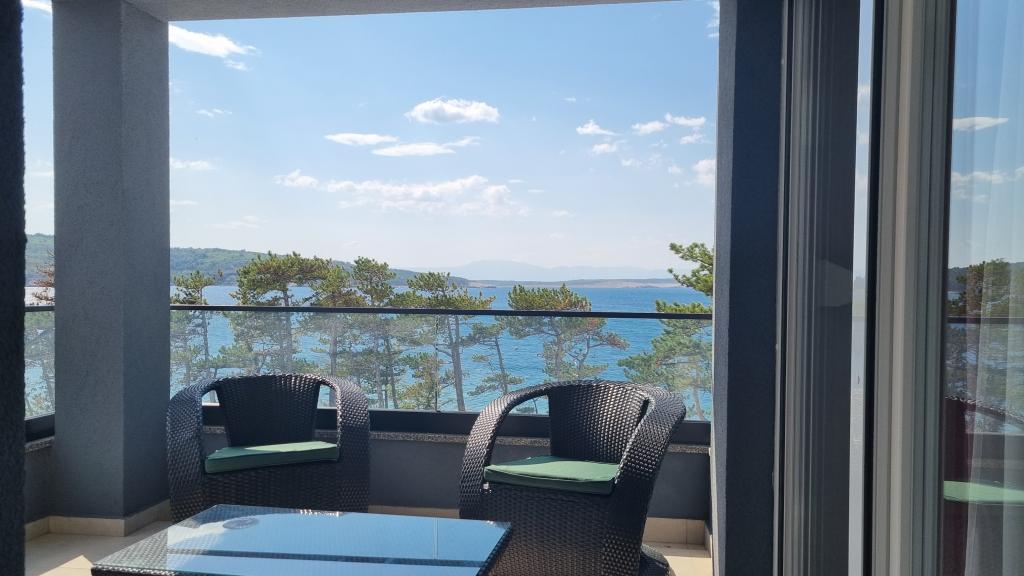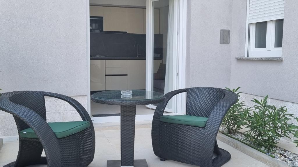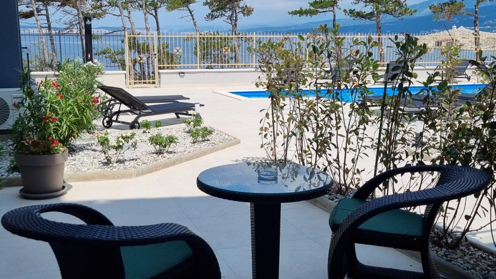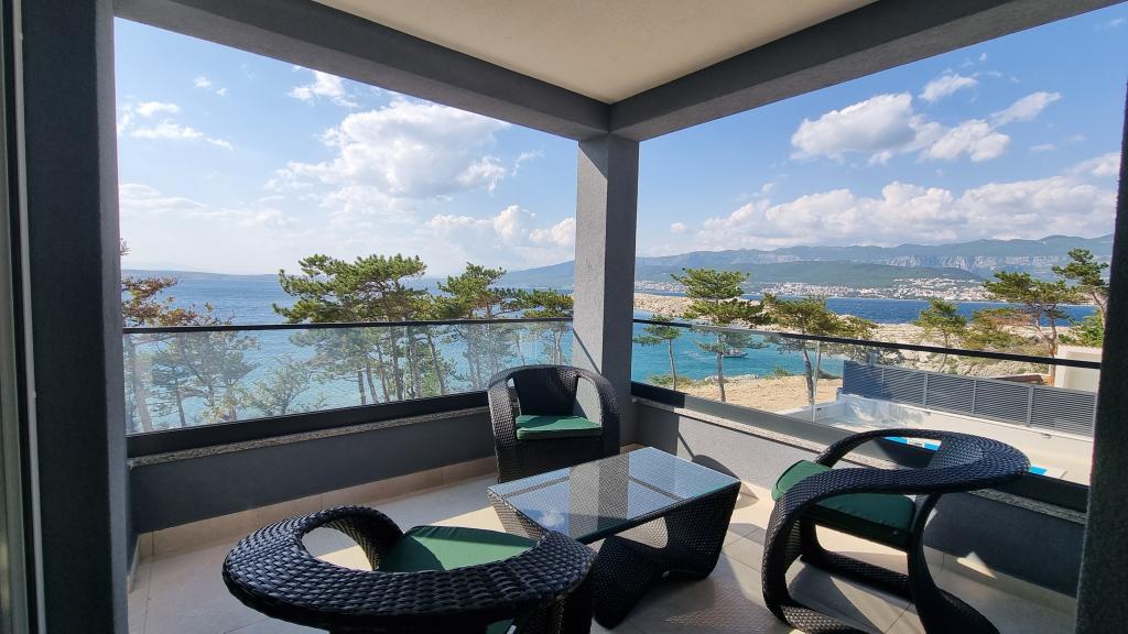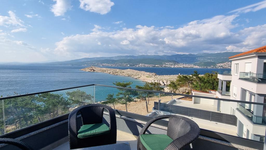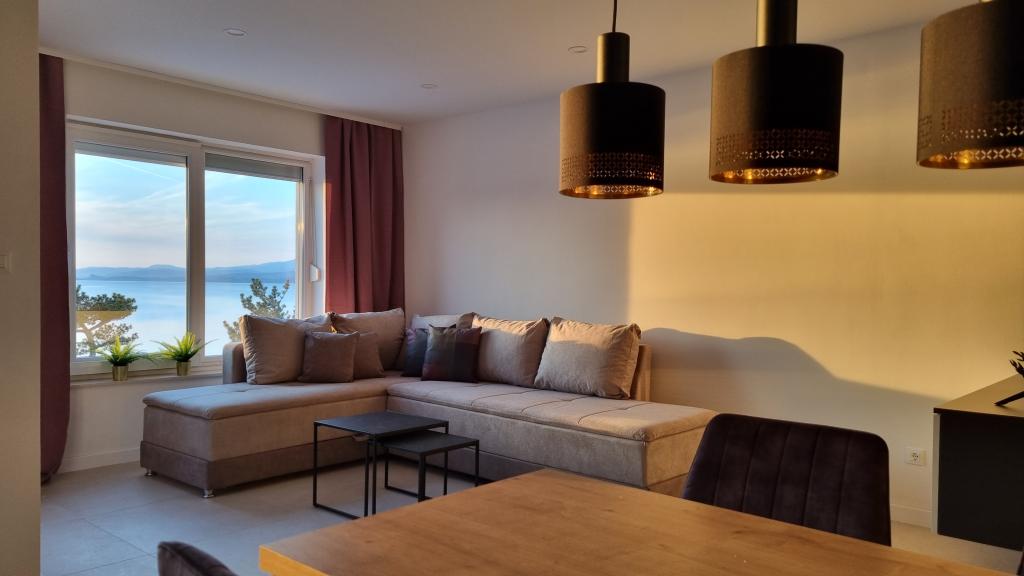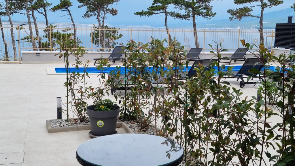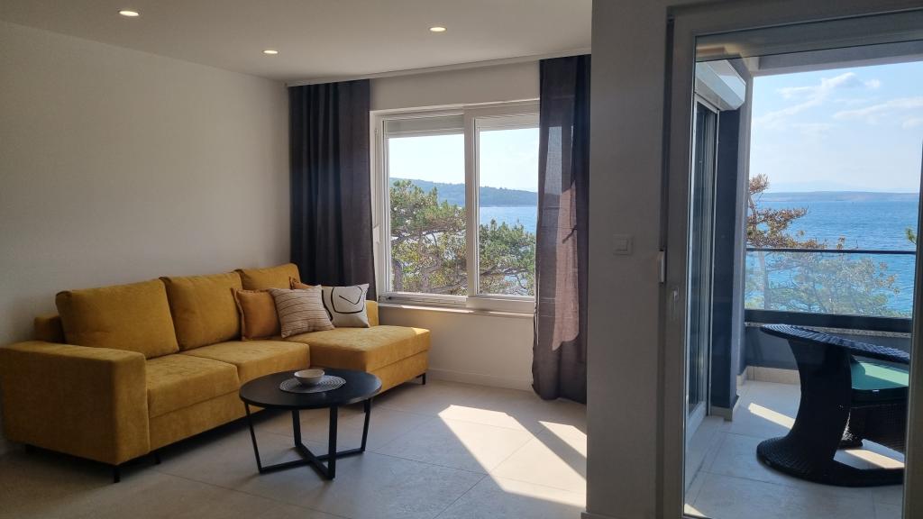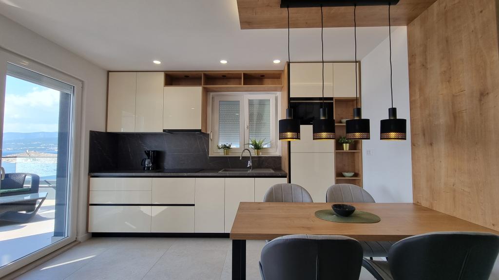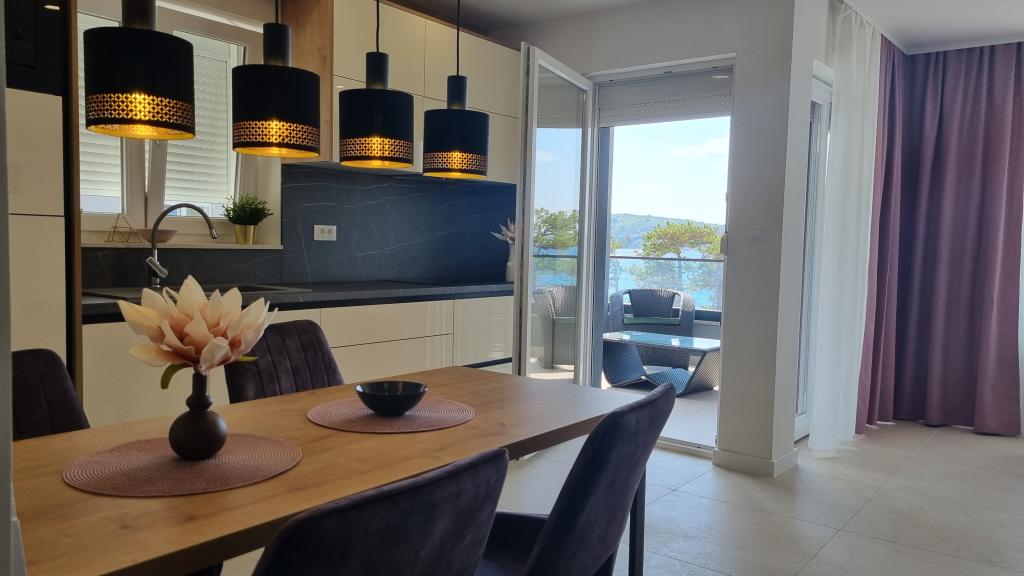Aceste apartamente de lux cu vedere la mare sunt situate într-un complex de clădiri într-o locație liniștită. Toate apartamentele sunt dotate modern cu două sau chiar trei aparate de aer condiționat și televizoare inteligente în sufragerie și dormitoare. Cladirea dispune de o piscina mare cu apa sarata (36 m2) de uz comun, si este deschisa din mai pana in octombrie, cu temperaturi care ajung de obicei la 20-26°C Cladirea are in total 12 apartamente. Imobilul dispune de parcare privată complet împrejmuită. În imediata apropiere se află o plajă mare cu pietriș, iar în clădirea alăturată se află un restaurant excelent care oferă și o selecție de specialități locale. Toate apartamentele sunt dotate cu plită cu inducție, frigider cu congelator, ceainic, filtru de cafea, prăjitor de pâine, mașină de spălat vase și cuptor cu microunde. Zona de lângă piscină este dotată cu șezlonguri, umbrele și duș în aer liber. Wi-Fi este disponibil gratuit în întreaga clădire.
