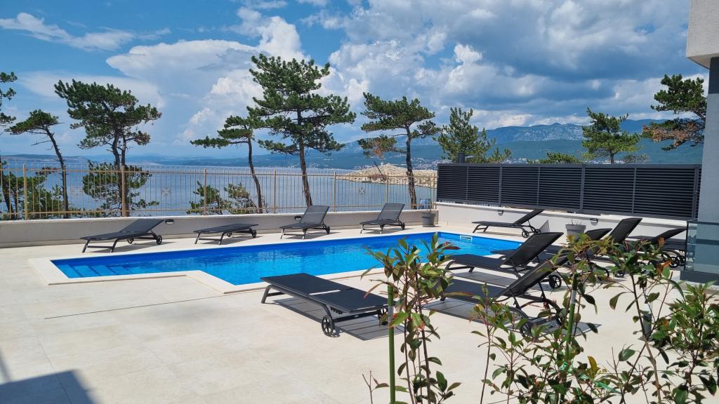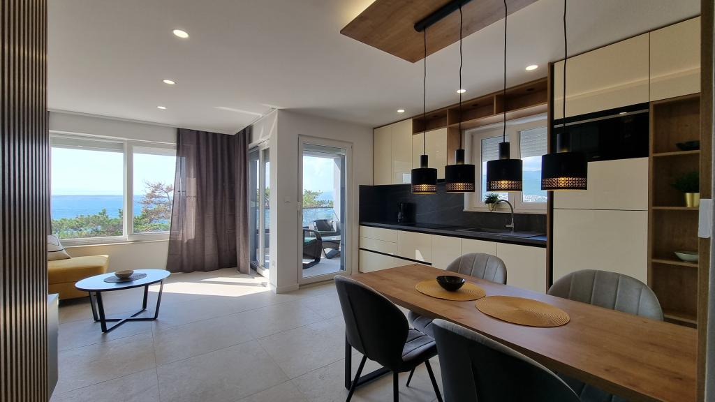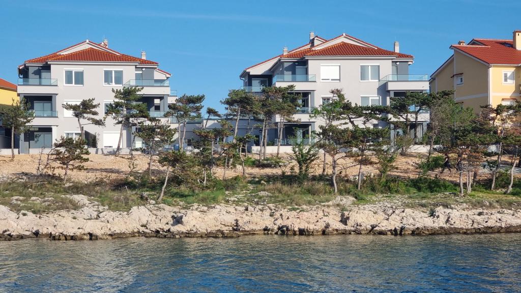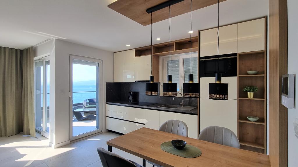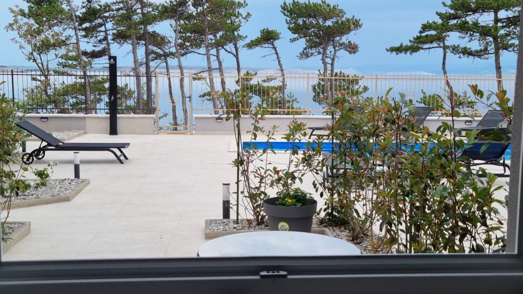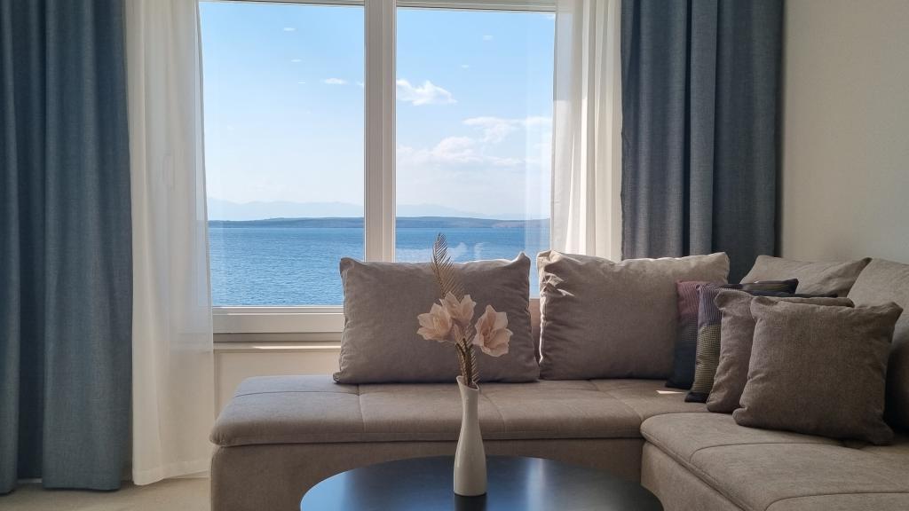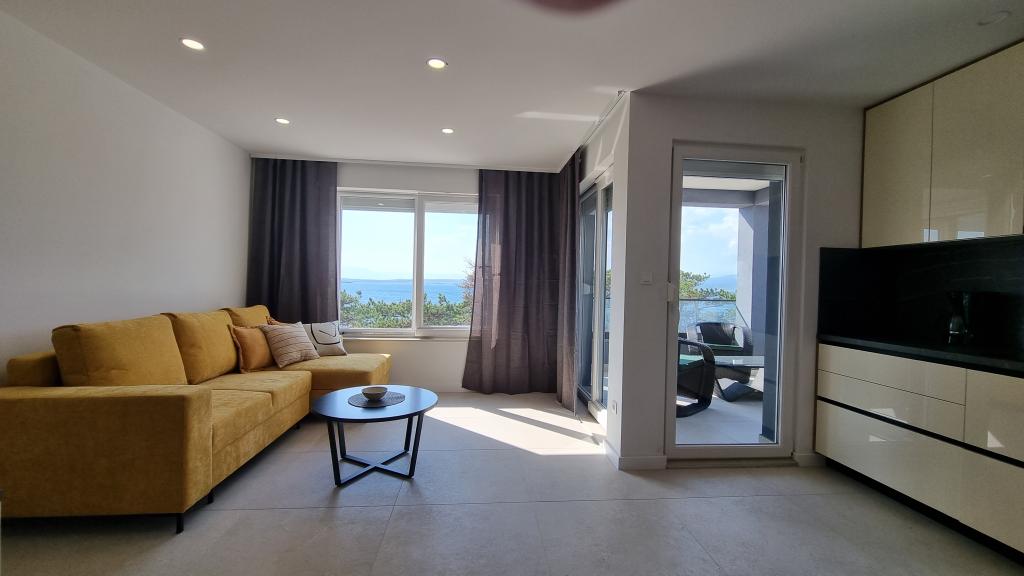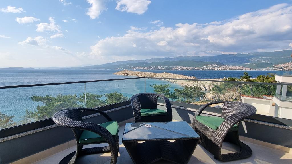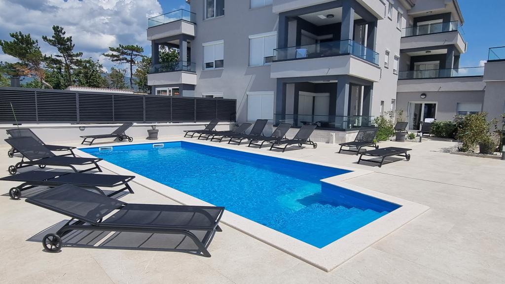Aceste apartamente de lux cu vedere la mare sunt situate într-un complex de clădiri într-o locație liniștită. Toate apartamentele sunt dotate modern cu două sau chiar trei aparate de aer condiționat și televizoare inteligente în sufragerie și dormitoare. Cladirea dispune de o piscina mare cu apa sarata (36 m2) de uz comun, si este deschisa din mai pana in octombrie, cu temperaturi care ajung de obicei la 20-26°C Cladirea are in total 12 apartamente. Imobilul dispune de parcare privată complet împrejmuită. În imediata apropiere se află o plajă mare cu pietriș, iar în clădirea alăturată se află un restaurant excelent care oferă și o selecție de specialități locale. Toate apartamentele sunt dotate cu plită cu inducție, frigider cu congelator, ceainic, filtru de cafea, prăjitor de pâine, mașină de spălat vase și cuptor cu microunde. Zona de lângă piscină este dotată cu șezlonguri, umbrele și duș în aer liber. Wi-Fi este disponibil gratuit în întreaga clădire.