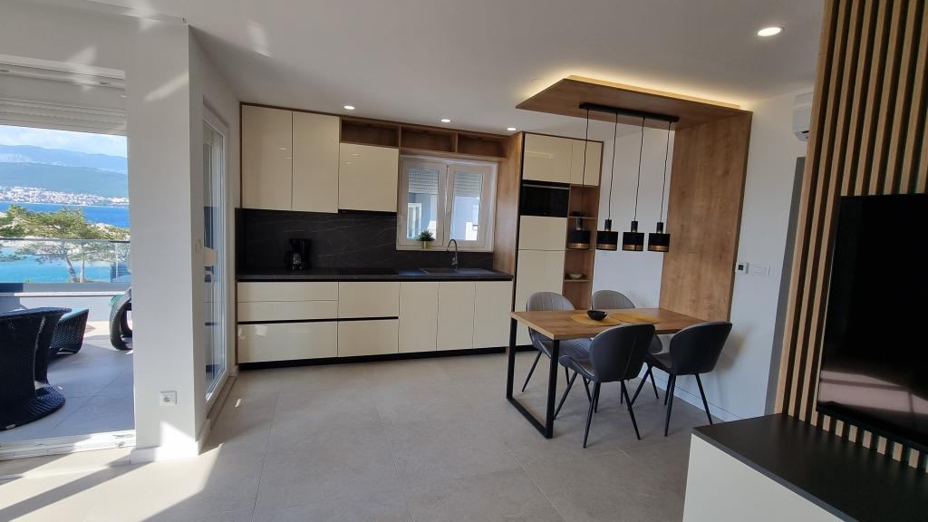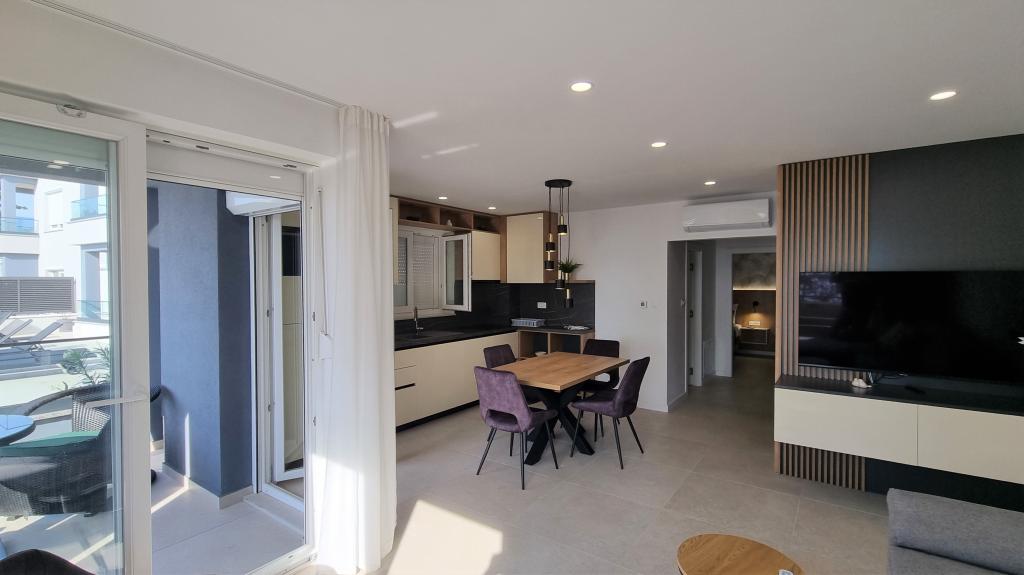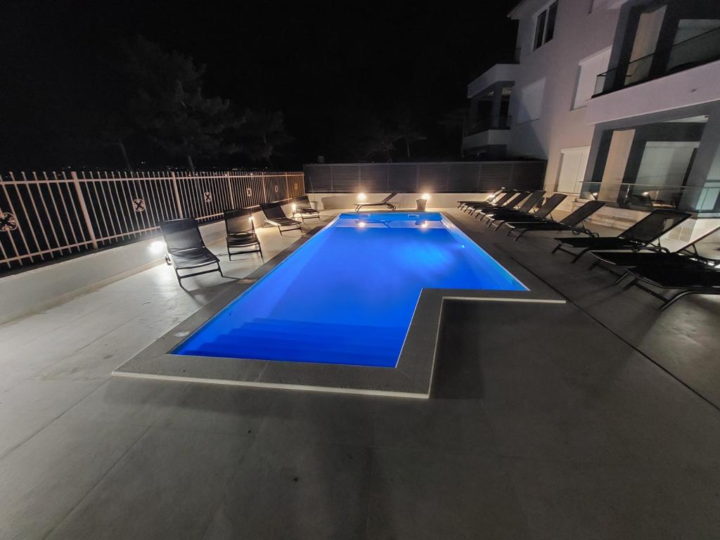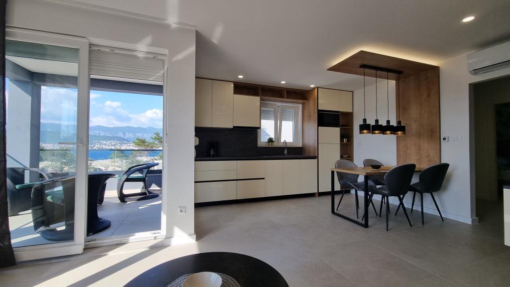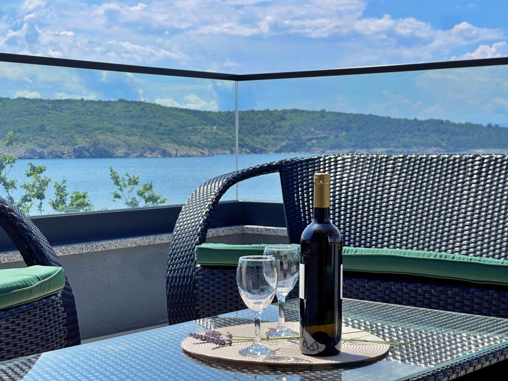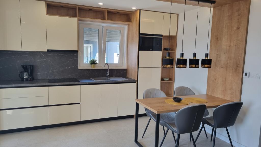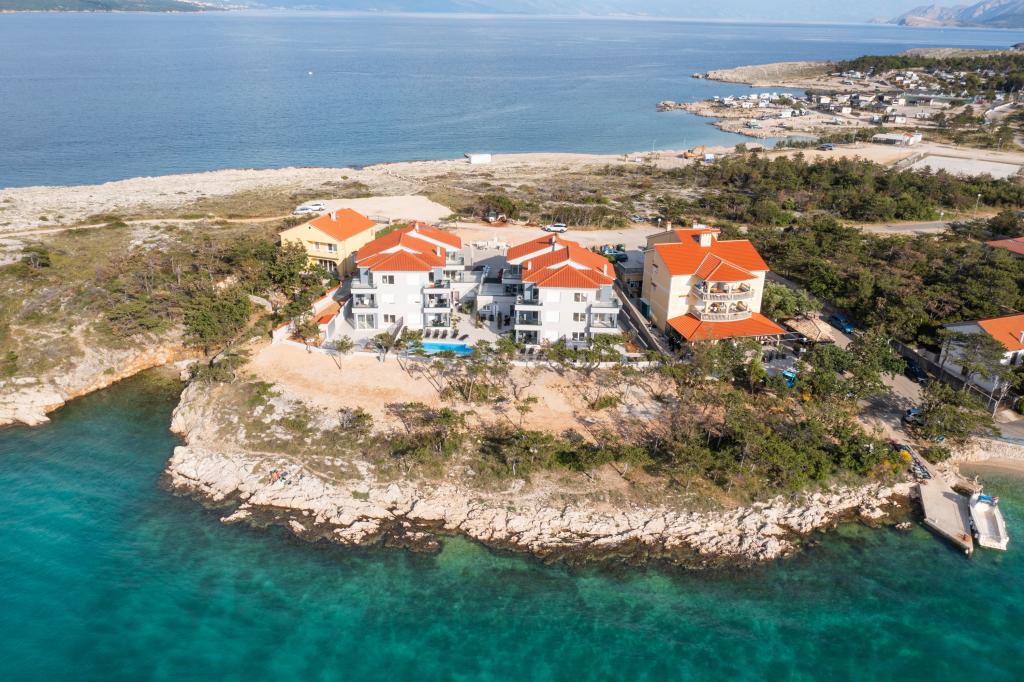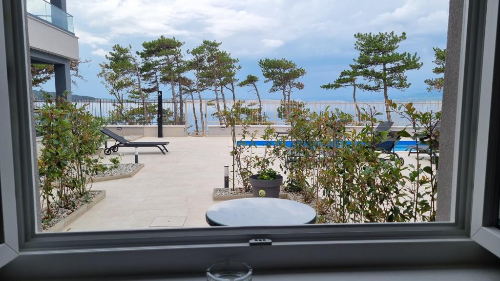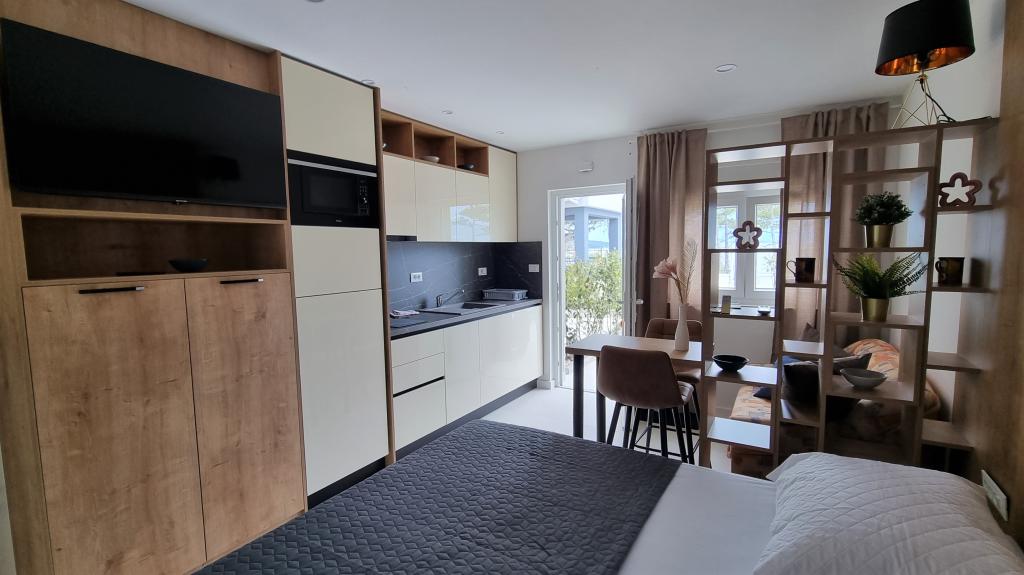 Aceste apartamente de lux cu vedere la mare sunt situate într-un complex de clădiri într-o locație liniștită. Toate apartamentele sunt dotate modern cu două sau chiar trei aparate de aer condiționat și televizoare inteligente în sufragerie și dormitoare. Cladirea dispune de o piscina mare cu apa sarata (36 m2) de uz comun, si este deschisa din mai pana in octombrie, cu temperaturi care ajung de obicei la 20-26°C Cladirea are in total 12 apartamente. Imobilul dispune de parcare privată complet împrejmuită. În imediata apropiere se află o plajă mare cu pietriș, iar în clădirea alăturată se află un restaurant excelent care oferă și o selecție de specialități locale. Toate apartamentele sunt dotate cu plită cu inducție, frigider cu congelator, ceainic, filtru de cafea, prăjitor de pâine, mașină de spălat vase și cuptor cu microunde. Zona de lângă piscină este dotată cu șezlonguri, umbrele și duș în aer liber. Wi-Fi este disponibil gratuit în întreaga clădire.