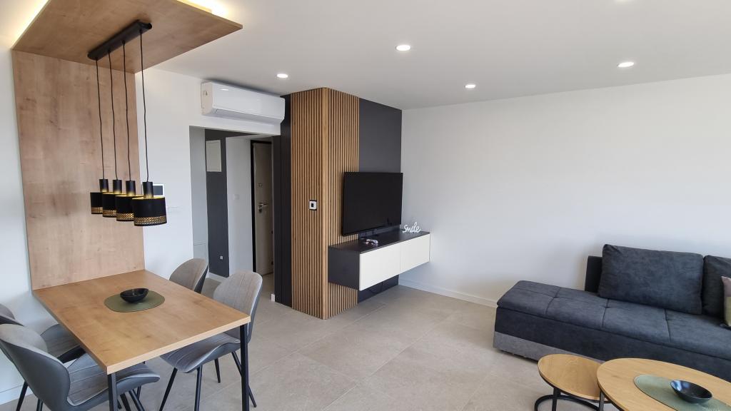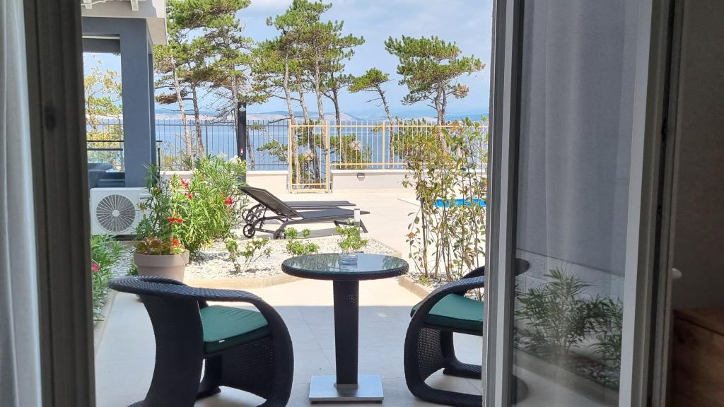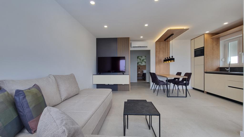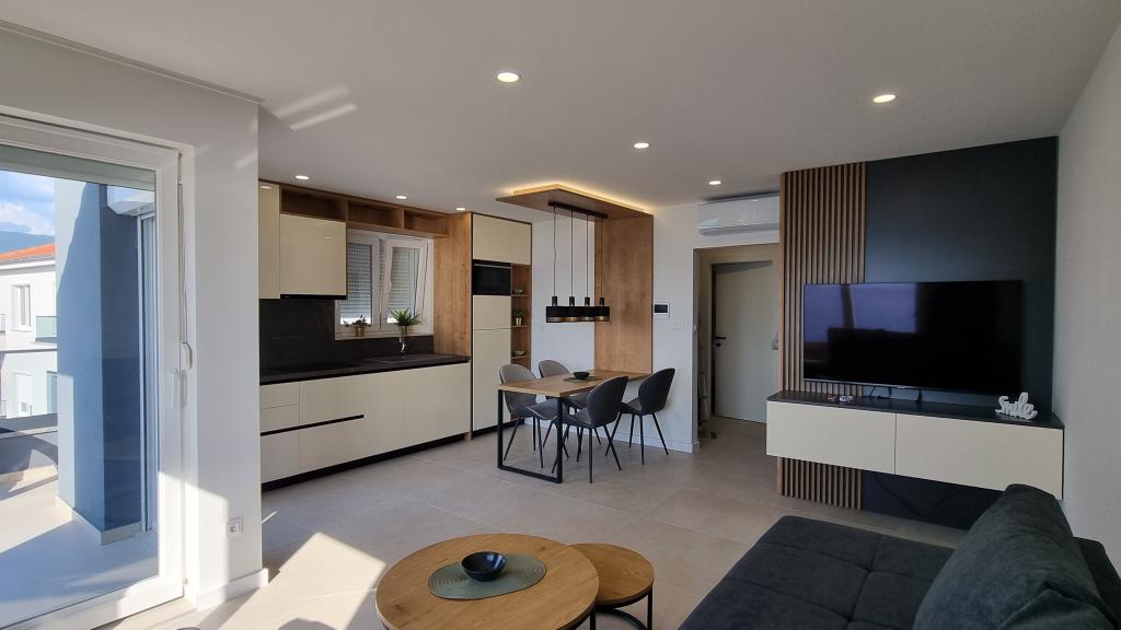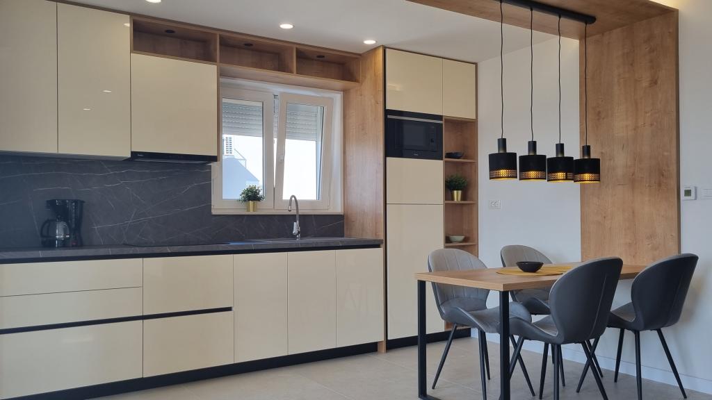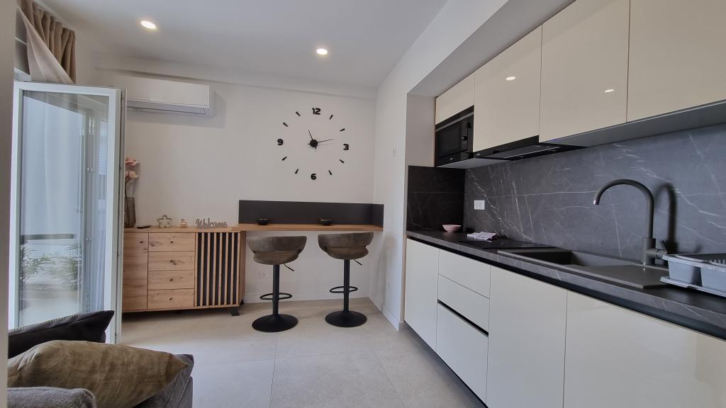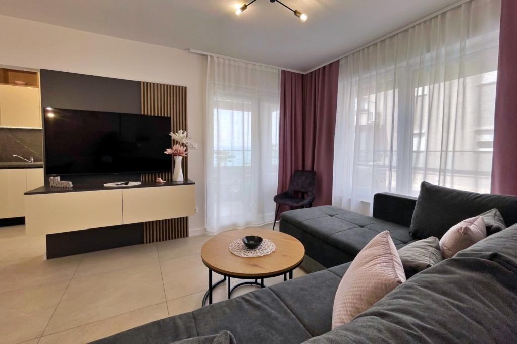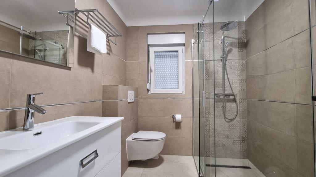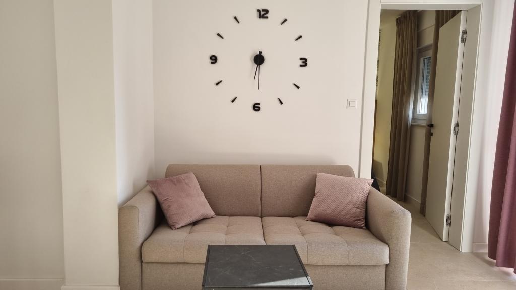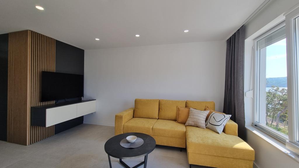 Aceste apartamente de lux cu vedere la mare sunt situate într-un complex de clădiri într-o locație liniștită. Toate apartamentele sunt dotate modern cu două sau chiar trei aparate de aer condiționat și televizoare inteligente în sufragerie și dormitoare. Cladirea dispune de o piscina mare cu apa sarata (36 m2) de uz comun, si este deschisa din mai pana in octombrie, cu temperaturi care ajung de obicei la 20-26°C Cladirea are in total 12 apartamente. Imobilul dispune de parcare privată complet împrejmuită. În imediata apropiere se află o plajă mare cu pietriș, iar în clădirea alăturată se află un restaurant excelent care oferă și o selecție de specialități locale. Toate apartamentele sunt dotate cu plită cu inducție, frigider cu congelator, ceainic, filtru de cafea, prăjitor de pâine, mașină de spălat vase și cuptor cu microunde. Zona de lângă piscină este dotată cu șezlonguri, umbrele și duș în aer liber. Wi-Fi este disponibil gratuit în întreaga clădire.