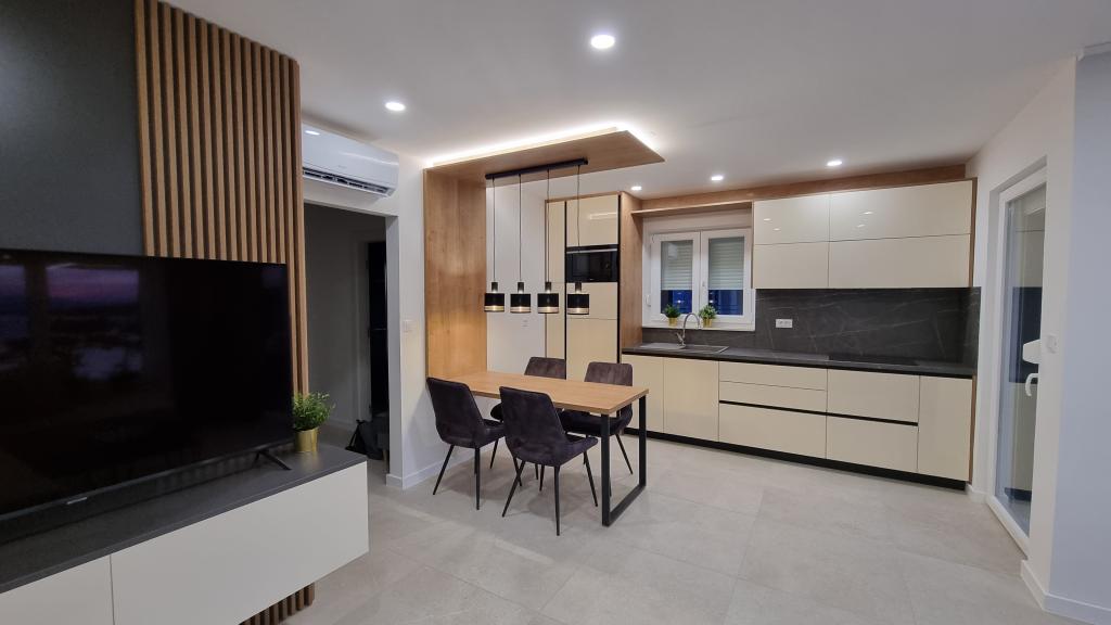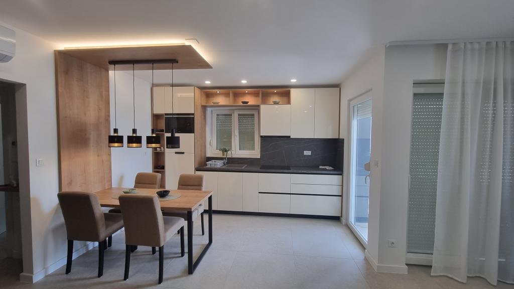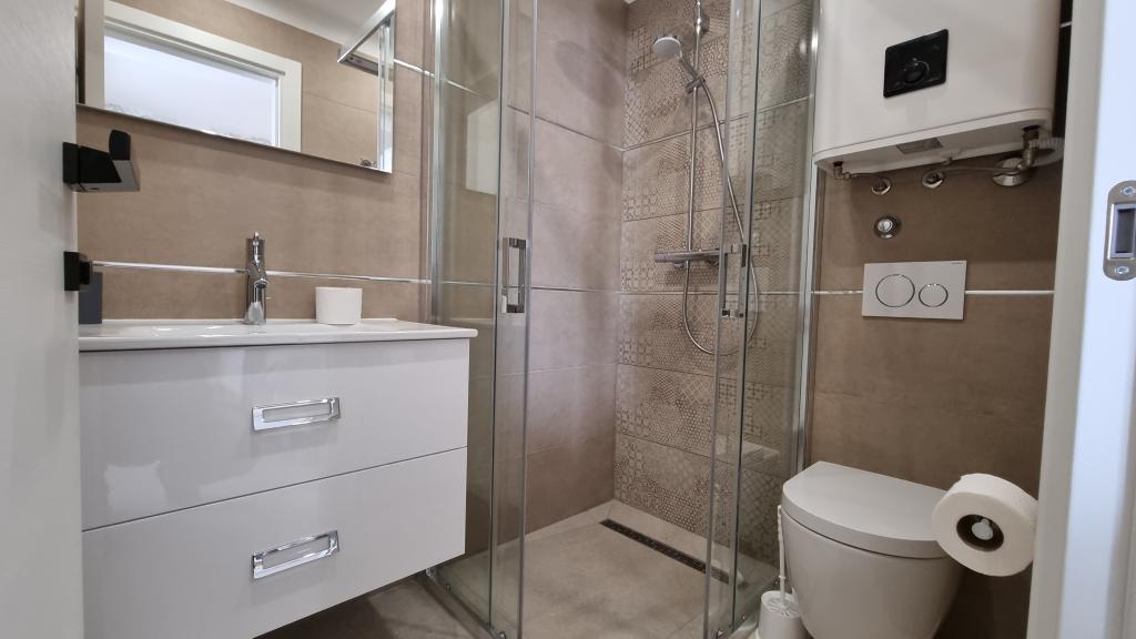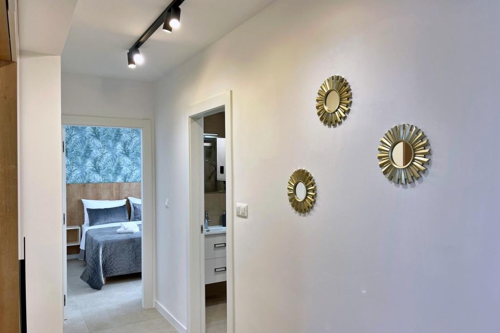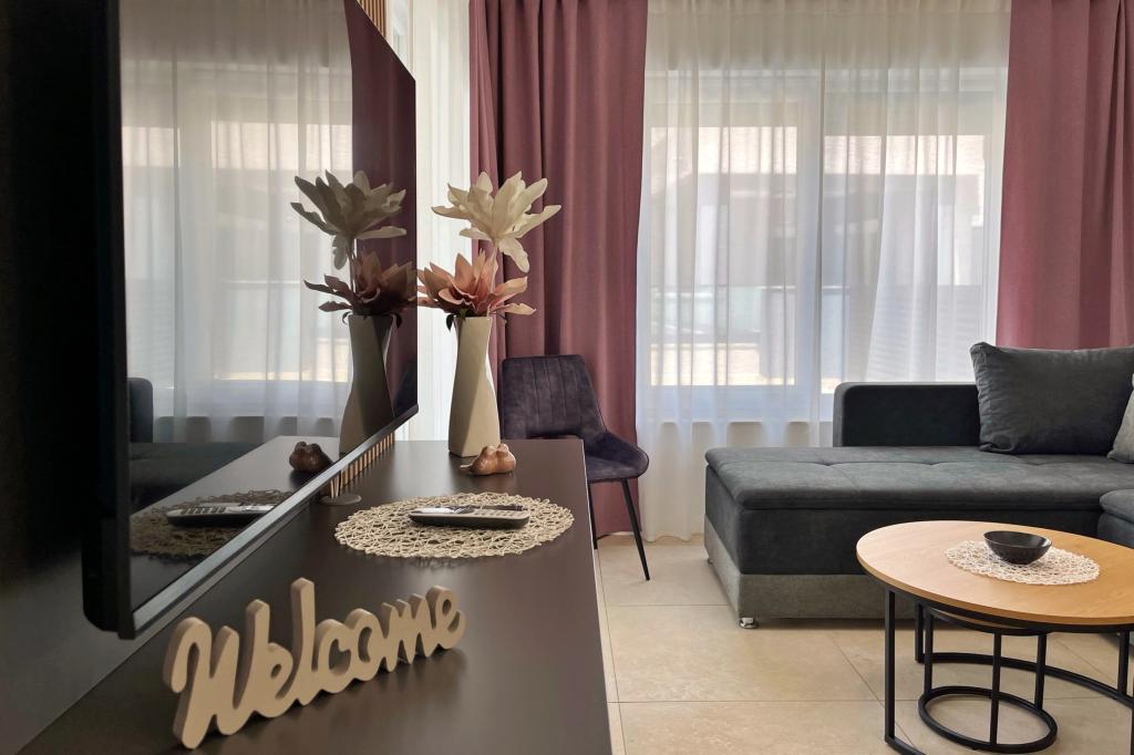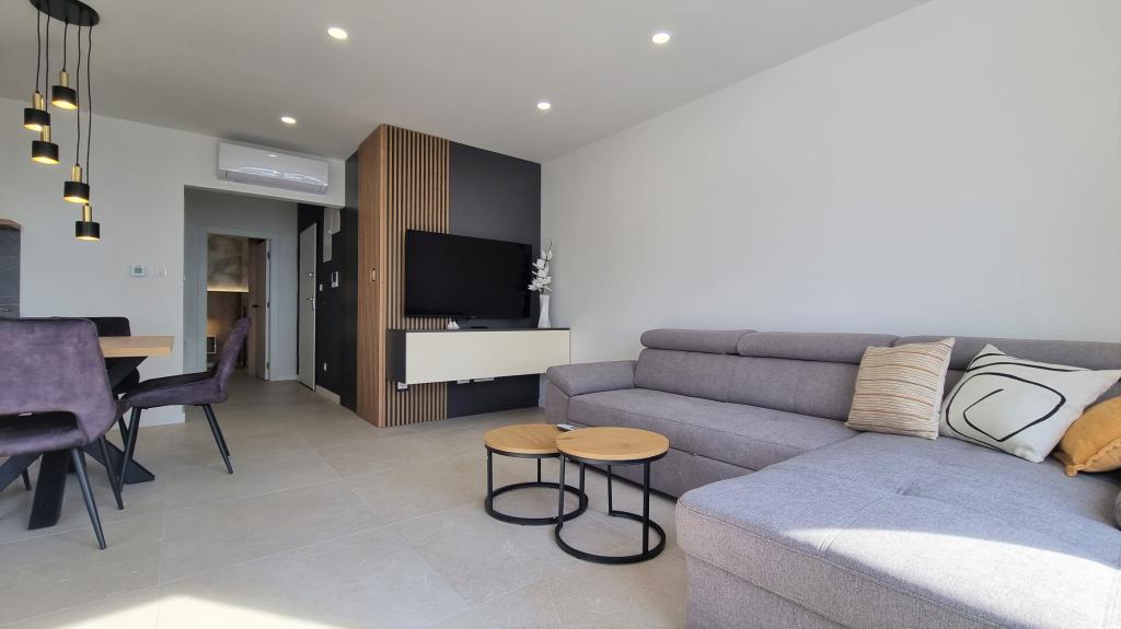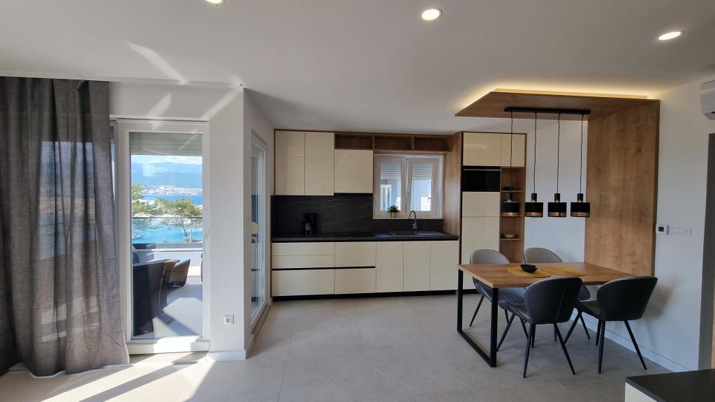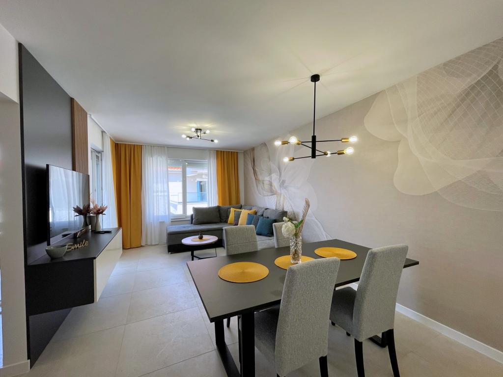 Aceste apartamente de lux cu vedere la mare sunt situate într-un complex de clădiri într-o locație liniștită. Toate apartamentele sunt dotate modern cu două sau chiar trei aparate de aer condiționat și televizoare inteligente în sufragerie și dormitoare. Cladirea dispune de o piscina mare cu apa sarata (36 m2) de uz comun, si este deschisa din mai pana in octombrie, cu temperaturi care ajung de obicei la 20-26°C Cladirea are in total 12 apartamente. Imobilul dispune de parcare privată complet împrejmuită. În imediata apropiere se află o plajă mare cu pietriș, iar în clădirea alăturată se află un restaurant excelent care oferă și o selecție de specialități locale. Toate apartamentele sunt dotate cu plită cu inducție, frigider cu congelator, ceainic, filtru de cafea, prăjitor de pâine, mașină de spălat vase și cuptor cu microunde. Zona de lângă piscină este dotată cu șezlonguri, umbrele și duș în aer liber. Wi-Fi este disponibil gratuit în întreaga clădire.