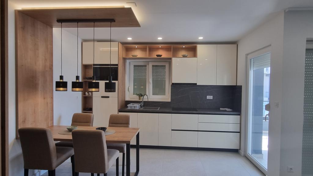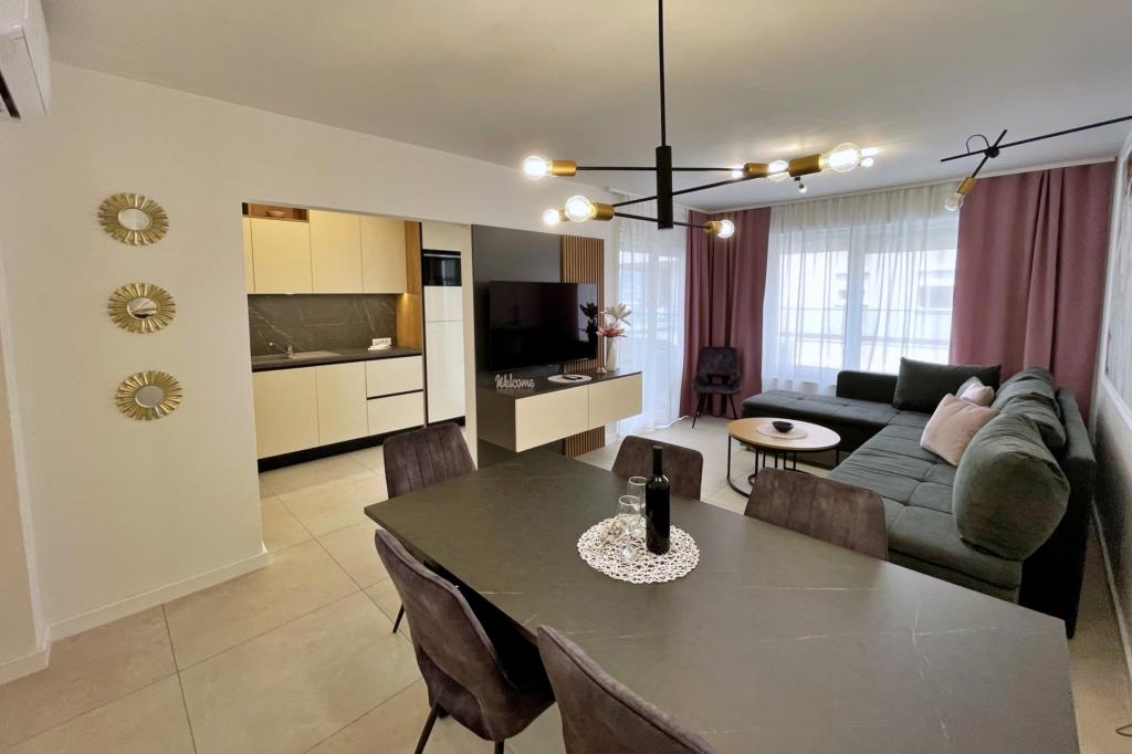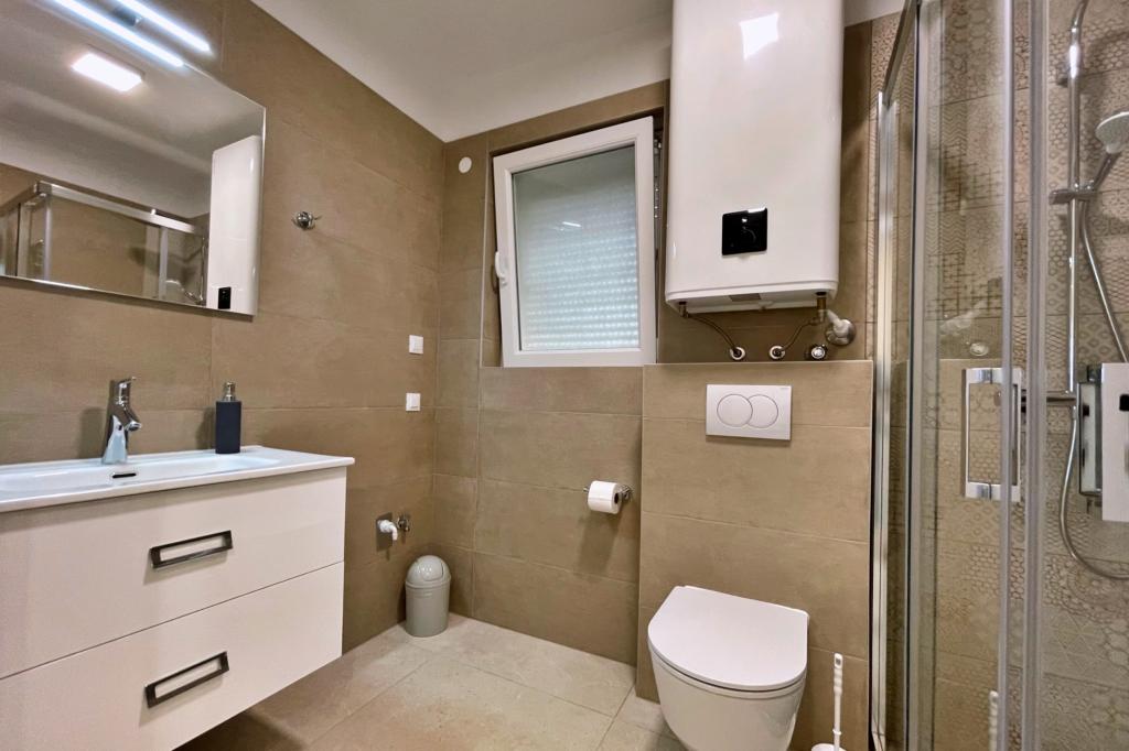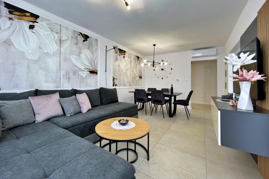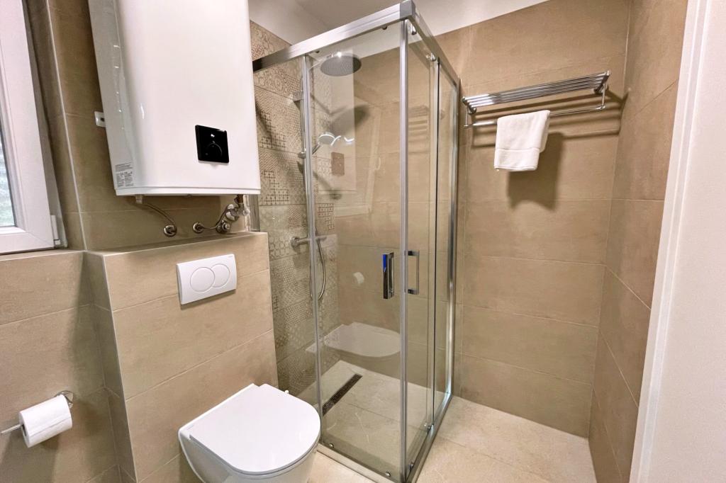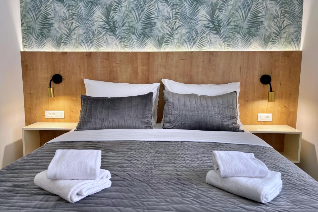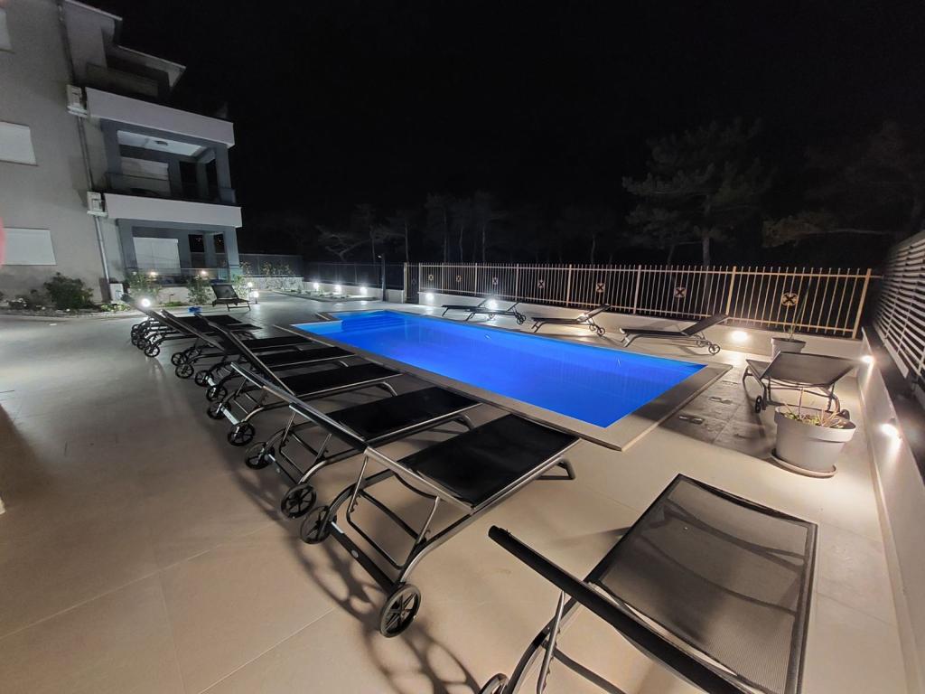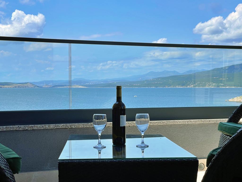 Aceste apartamente de lux cu vedere la mare sunt situate într-un complex de clădiri într-o locație liniștită. Toate apartamentele sunt dotate modern cu două sau chiar trei aparate de aer condiționat și televizoare inteligente în sufragerie și dormitoare. Cladirea dispune de o piscina mare cu apa sarata (36 m2) de uz comun, si este deschisa din mai pana in octombrie, cu temperaturi care ajung de obicei la 20-26°C Cladirea are in total 12 apartamente. Imobilul dispune de parcare privată complet împrejmuită. În imediata apropiere se află o plajă mare cu pietriș, iar în clădirea alăturată se află un restaurant excelent care oferă și o selecție de specialități locale. Toate apartamentele sunt dotate cu plită cu inducție, frigider cu congelator, ceainic, filtru de cafea, prăjitor de pâine, mașină de spălat vase și cuptor cu microunde. Zona de lângă piscină este dotată cu șezlonguri, umbrele și duș în aer liber. Wi-Fi este disponibil gratuit în întreaga clădire.