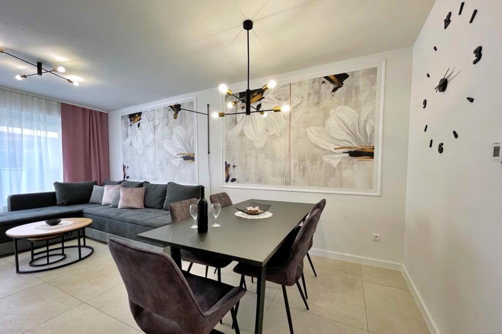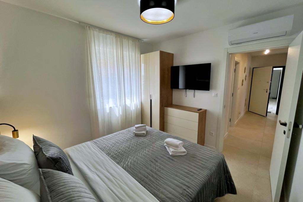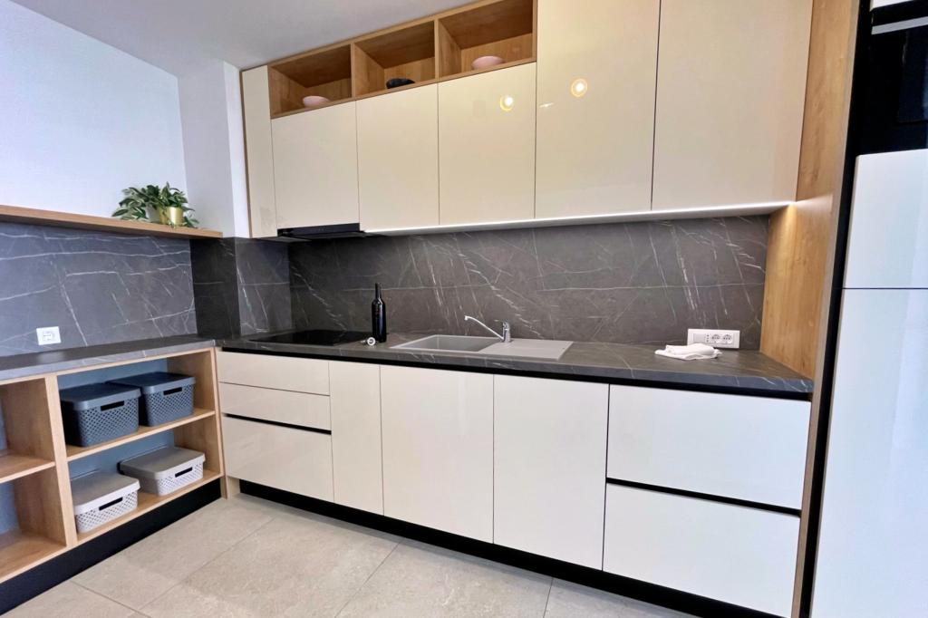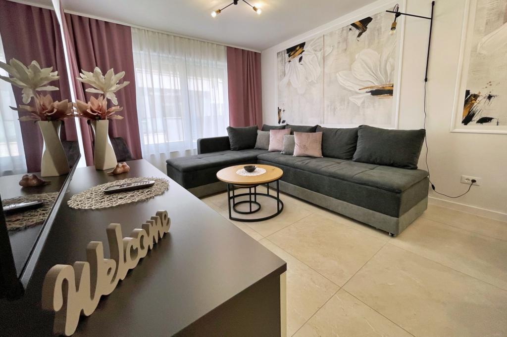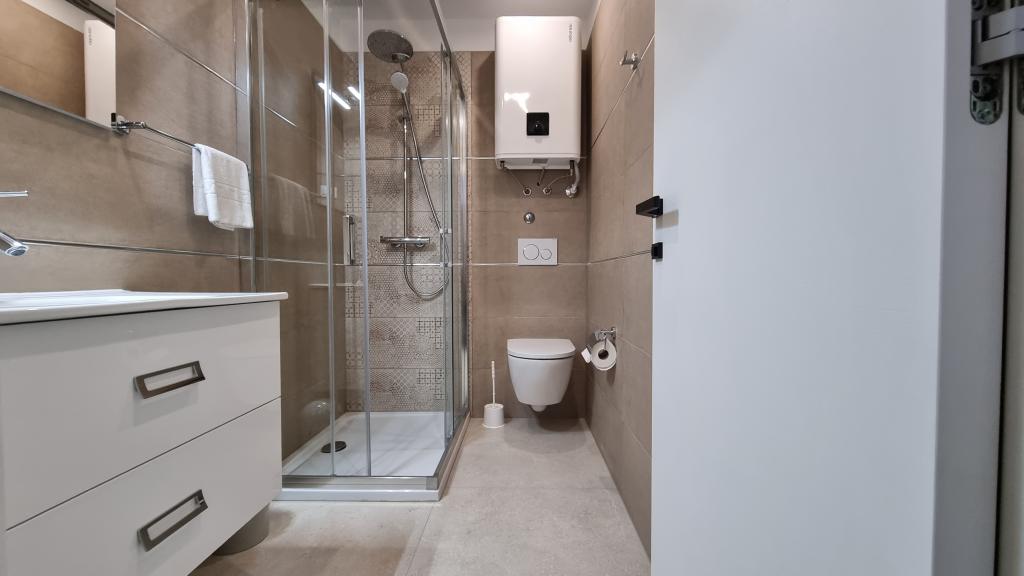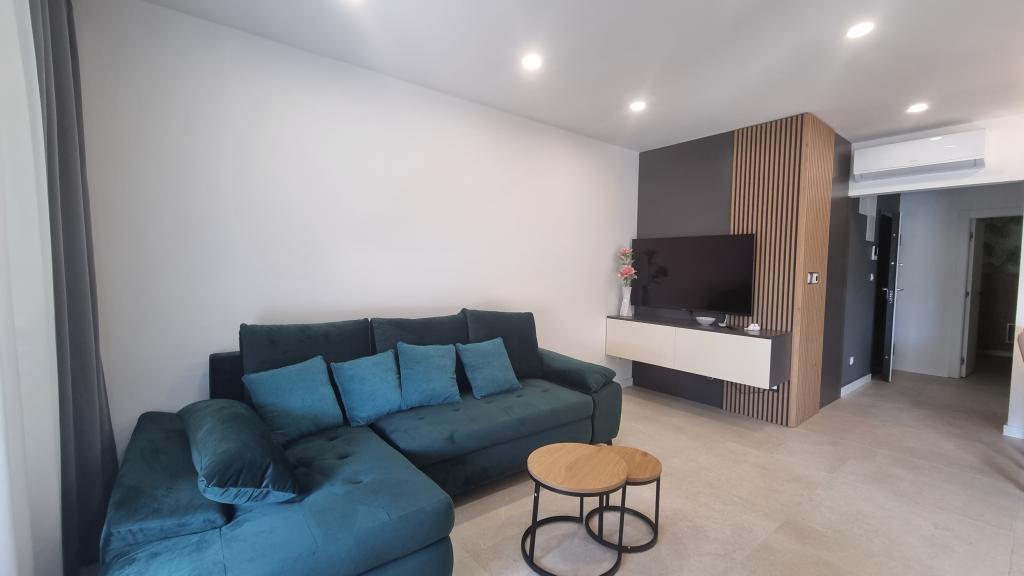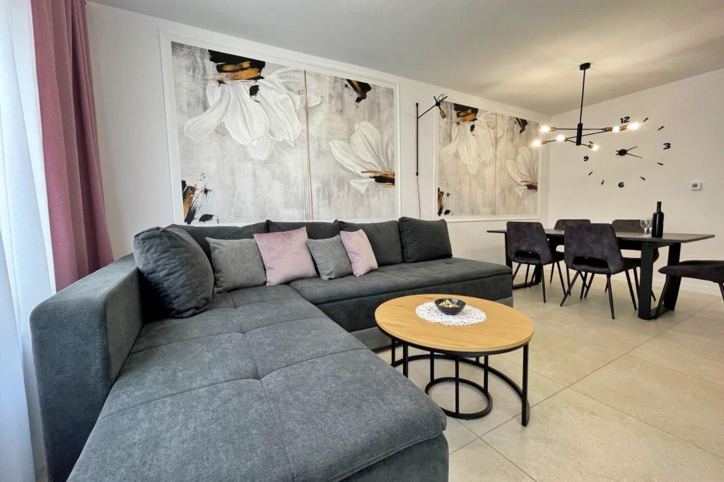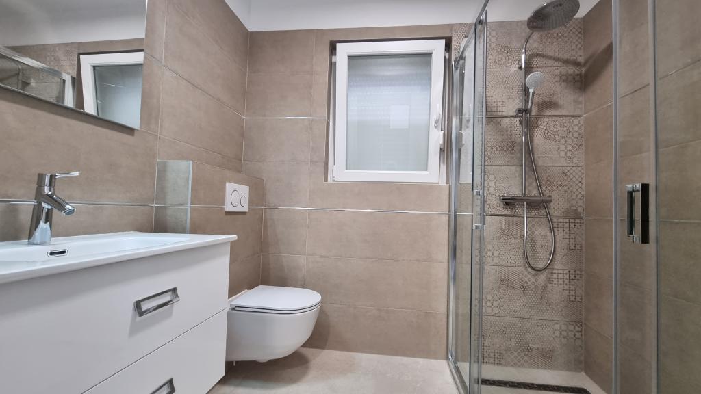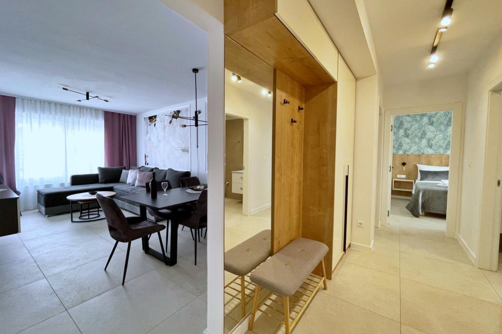 Aceste apartamente de lux cu vedere la mare sunt situate într-un complex de clădiri într-o locație liniștită. Toate apartamentele sunt dotate modern cu două sau chiar trei aparate de aer condiționat și televizoare inteligente în sufragerie și dormitoare. Cladirea dispune de o piscina mare cu apa sarata (36 m2) de uz comun, si este deschisa din mai pana in octombrie, cu temperaturi care ajung de obicei la 20-26°C Cladirea are in total 12 apartamente. Imobilul dispune de parcare privată complet împrejmuită. În imediata apropiere se află o plajă mare cu pietriș, iar în clădirea alăturată se află un restaurant excelent care oferă și o selecție de specialități locale. Toate apartamentele sunt dotate cu plită cu inducție, frigider cu congelator, ceainic, filtru de cafea, prăjitor de pâine, mașină de spălat vase și cuptor cu microunde. Zona de lângă piscină este dotată cu șezlonguri, umbrele și duș în aer liber. Wi-Fi este disponibil gratuit în întreaga clădire.