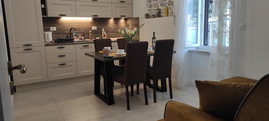 Insula Šolta, STOMORSKA - Simțiți spiritul unui oraș vechi dalmat în apartamentele situate într-o casă privată situată în mijlocul malului pitoresc (primul rând până la mare). De pe terasa se vede o priveliste superba a locului, a marii, a golfului. Cafenele, restaurante, magazine, plaje... totul este aproape de apartament, la doar cateva minute de mers pe jos. Apartamentul mai mare are două dormitoare, două băi și un living cu bucătărie și terasă. Apartamentul mai mic are o bucătărie cu living, un dormitor separat cu o baie. În fața apartamentului există o zonă de relaxare. Apartamentele sunt proiectate și echipate pentru a satisface toate nevoile dumneavoastră, doar veniți și bucurați-vă. Casa are o curte verde decorată în stil dalmat, un șemineu și un duș în aer liber. Gazdele sunt la dispoziția oaspeților, precum și locuri de parcare