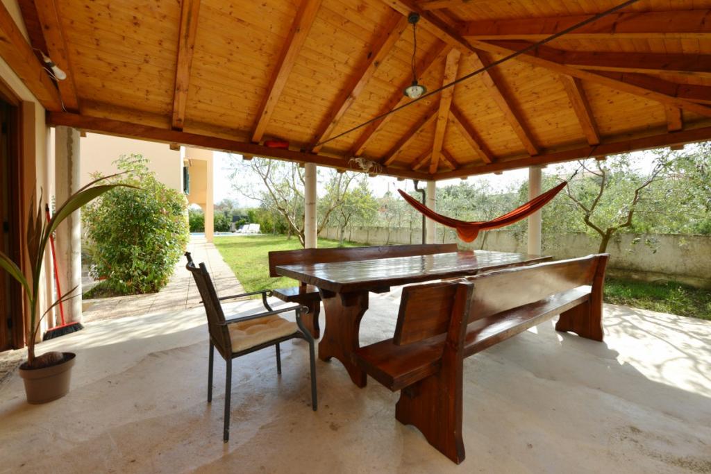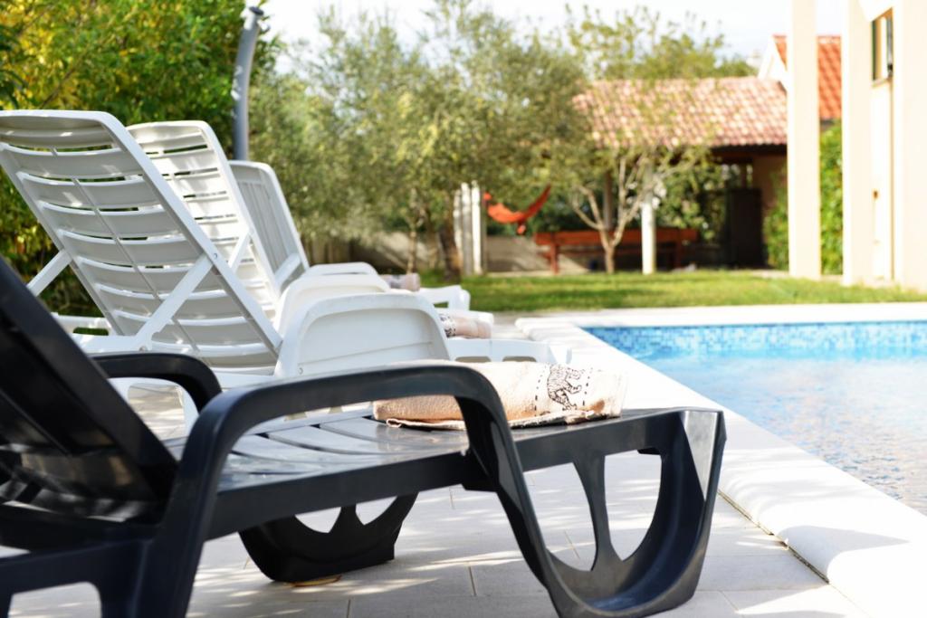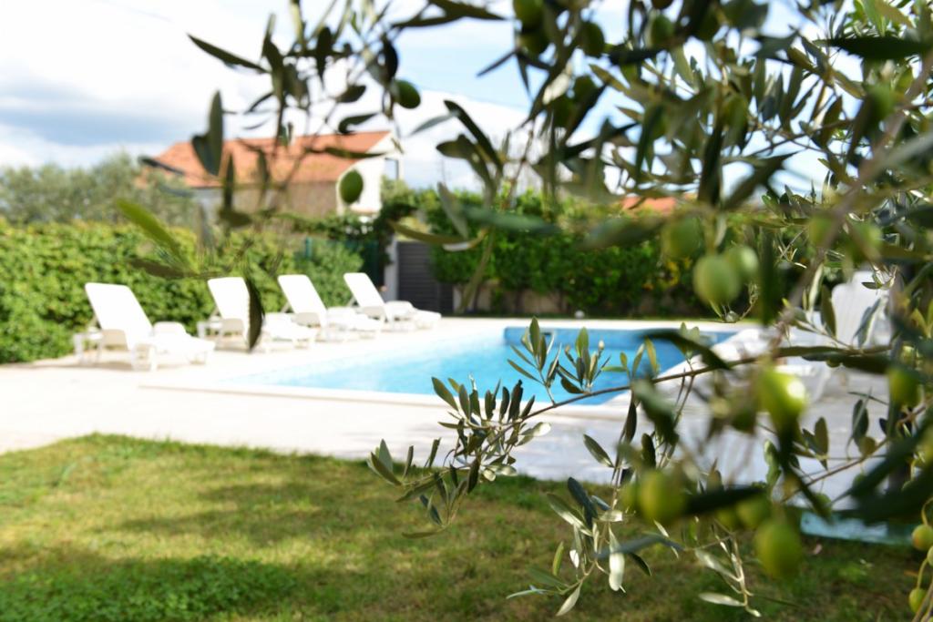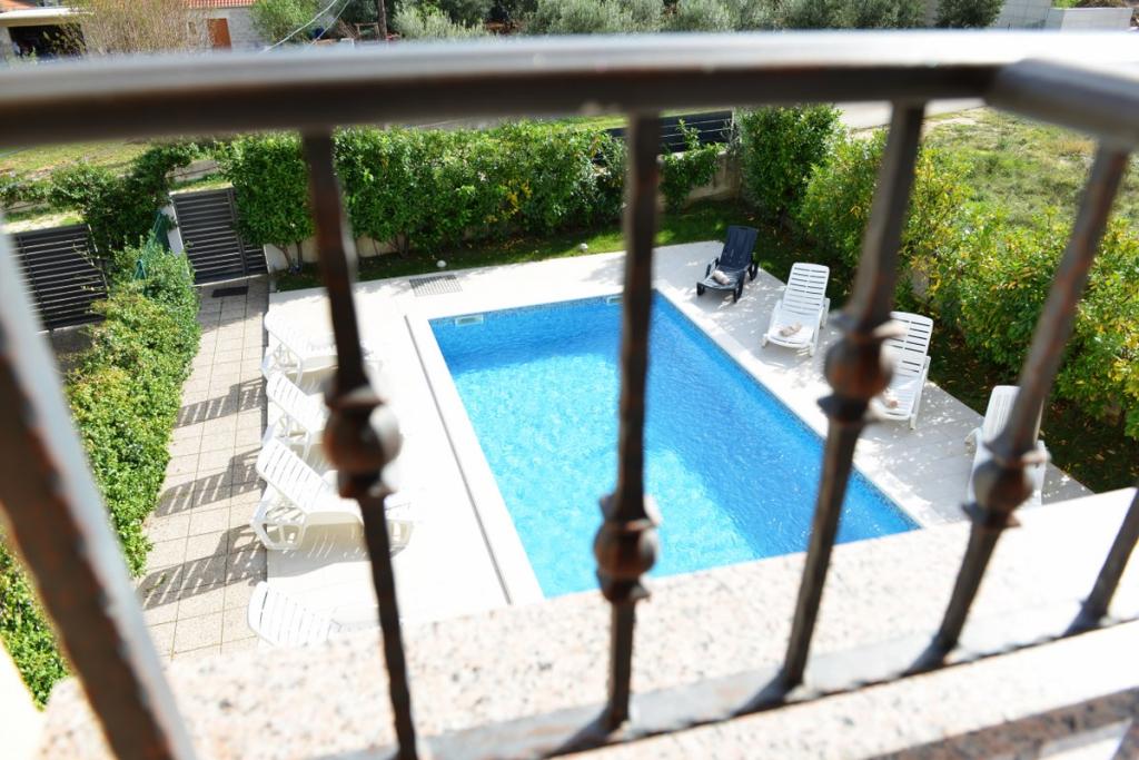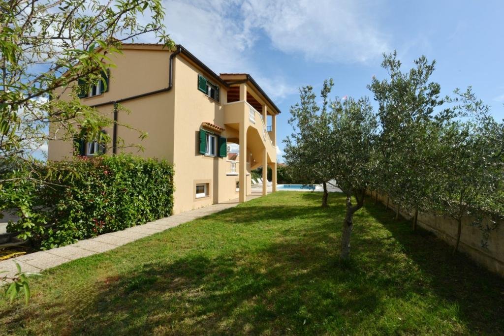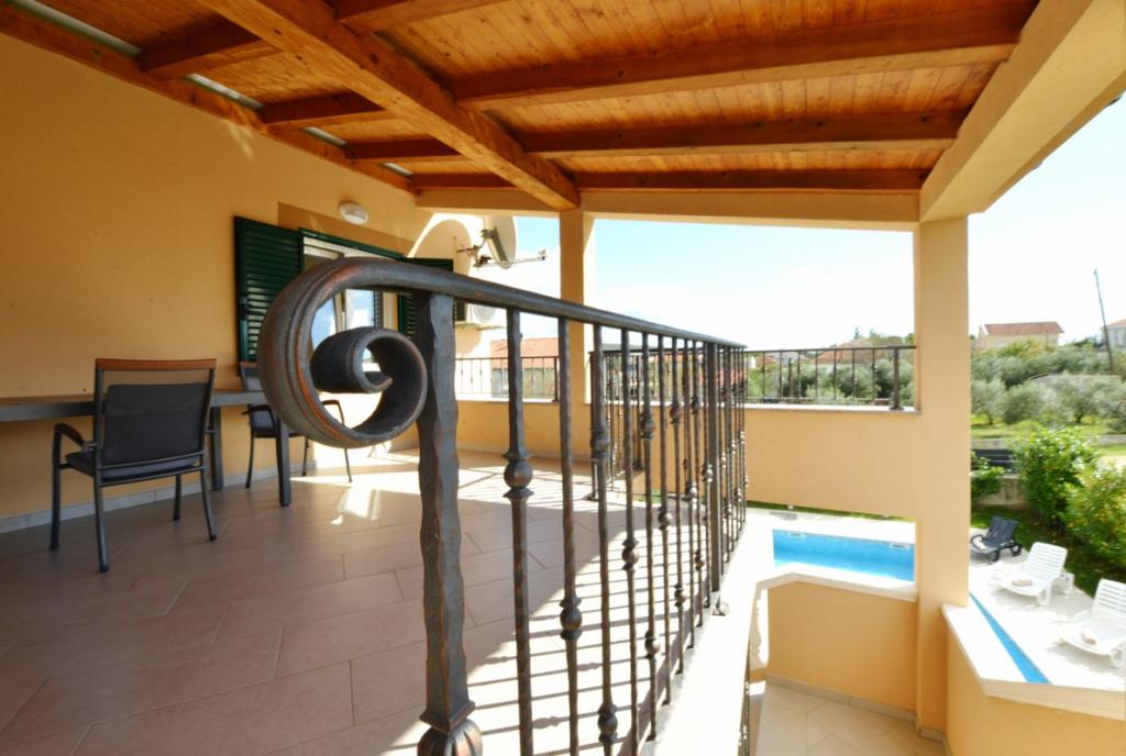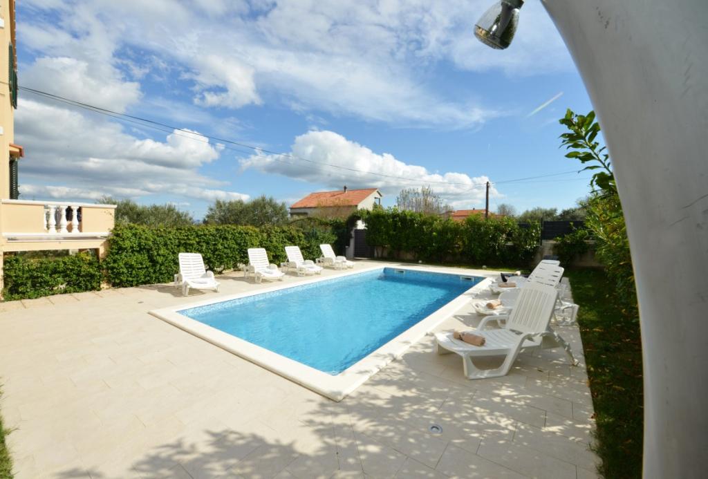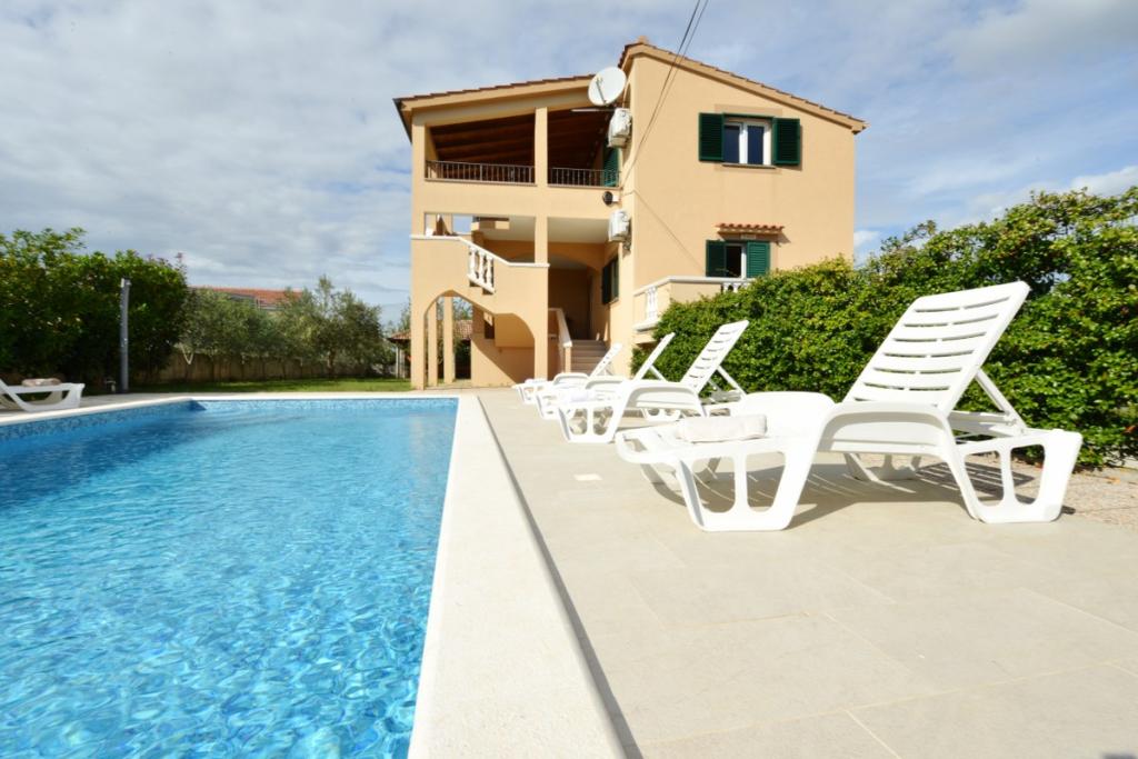 Vilă complet utilată și modernă pentru o vacanță în familie, cu o piscină de 8 x 4 metri în interiorul insulei Sukošan. Casa este situată într-un loc foarte retras și liniștit, la 4 km de plajă și la 15 km de Zadar, cu care este conectată printr-o autostradă (10 minute). Proprietatea este o casă cu două etaje, formată dintr-un dormitor triplu și trei dormitoare duble, două băi, două camere de zi și două bucătării, două balcoane și o casă separată pentru grătar, precum și un baldachin în față. Proprietatea oferă o priveliște frumoasă asupra Velebitului și a regiunii Ravna Kotar, iar la doar 4 minute de mers pe jos se află o poziție (100 m deasupra nivelului mării) cu o vedere panoramică asupra Sukošanului, a insulelor arhipelagului Zadar și a unui apus de soare minunat. Casa dispune de internet wireless nelimitat și gratuit, locuri de parcare gratuite, legume cultivate organic, disponibile oaspeților. Prin aranjament, posibilitatea de a prepara specialități tradiționale dalmate.