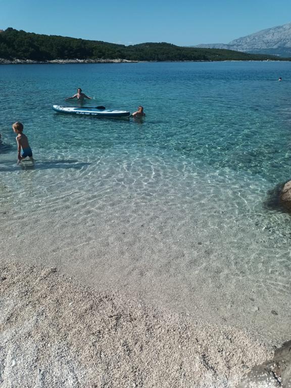 Casa de vacanță este situată la 200 de metri de trei plaje diferite. O plajă liniștită numită Jezero, înconjurată de păduri de pini și cu vedere spre Biokovo, este recomandată familiilor cu copii mici, deoarece are o parte puțin adâncă și nisipoasă. O plajă cu nisip numită Baywatch se află, de asemenea, în apropierea casei, la aproximativ 150 m distanță, pentru toți cei care iubesc distracția pe plajă. În centrul orașului există o plajă, lângă care există restaurante și cafenele. Casa de vacanță este complet utilată cu toate facilitățile necesare pentru o vacanță plăcută. În curtea privată și împrejmuită există o piscină, grătar și mobilier de relaxare. La ultimul etaj există o terasă spațioasă cu vedere la mare, insule și Muntele Biokovo. O altă casă cu două apartamente separate se află lângă aceasta. Are vedere la mare și o terasă folosită de apartamente. Fiecare apartament este o unitate separată. De asemenea, au la dispoziție un grătar comun și o zonă de relaxare în grădină.