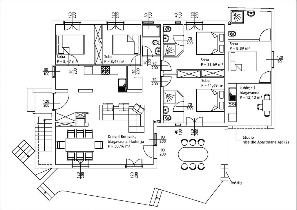 Bine ați venit la Apartamentele Pavlović – oaza voastră de liniște în inima orașului Supetar! Situate într-una dintre cele mai atractive și, în același timp, liniștite zone ale orașului Supetar, pe insula Brač, Apartamentele Pavlović sunt alegerea ideală pentru o vacanță perfectă și relaxantă. Bucurați-vă de apropierea mării, a diverselor plaje și a promenadei orașului – totul este la îndemâna dumneavoastră! Casa noastră este situată în primul rând de case familiale, chiar în spatele complexelor hoteliere, ceea ce asigură liniște și intimitate, dar și imediata apropiere a tuturor facilităților importante. Cea mai apropiată plajă este la doar 250 de metri distanță, magazinul este la 50 de metri distanță, iar la promenada pitorească puteți ajunge într-o plimbare ușoară de cinci minute. Facilitatea dispune de un total de opt unități de cazare modern echipate, cu diferite capacități: 4 apartamente studio pentru două persoane, 3 apartamente pentru patru persoane, 1 apartament mare la parter, care poate găzdui până la zece persoane – ideal pentru familii mai mari sau grupuri de prieteni. Toate apartamentele sunt climatizate și complet utilate – inclusiv bucătărie, sufragerie, baie, terasă privată,