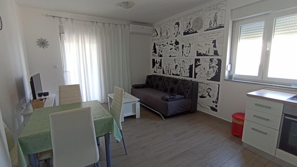 Eram într-un apartament cu vedere la mare pe o parte și o livadă de măslini pe de altă parte - idilă pură. Apartamentul este mobilat modern (Alan Ford pe perete ne-a cucerit imediat), curat si situat in apropierea centrului orasului si a plajei de nisip unde ne-am cazat. Gazdele plăcute au pus capăt vacanței perfecte.