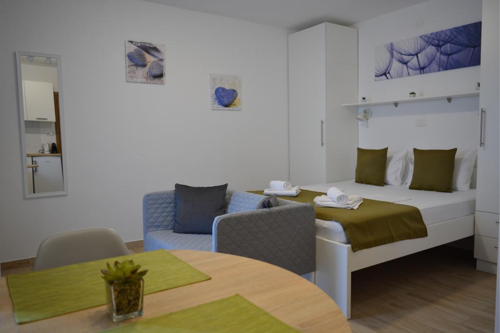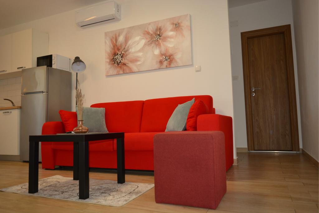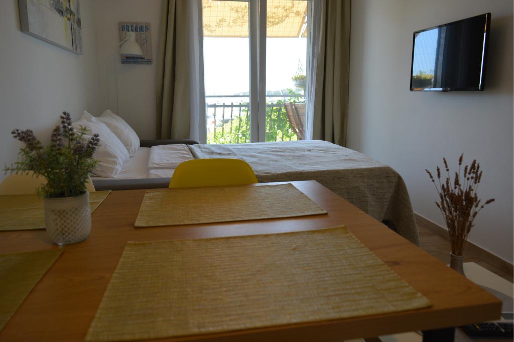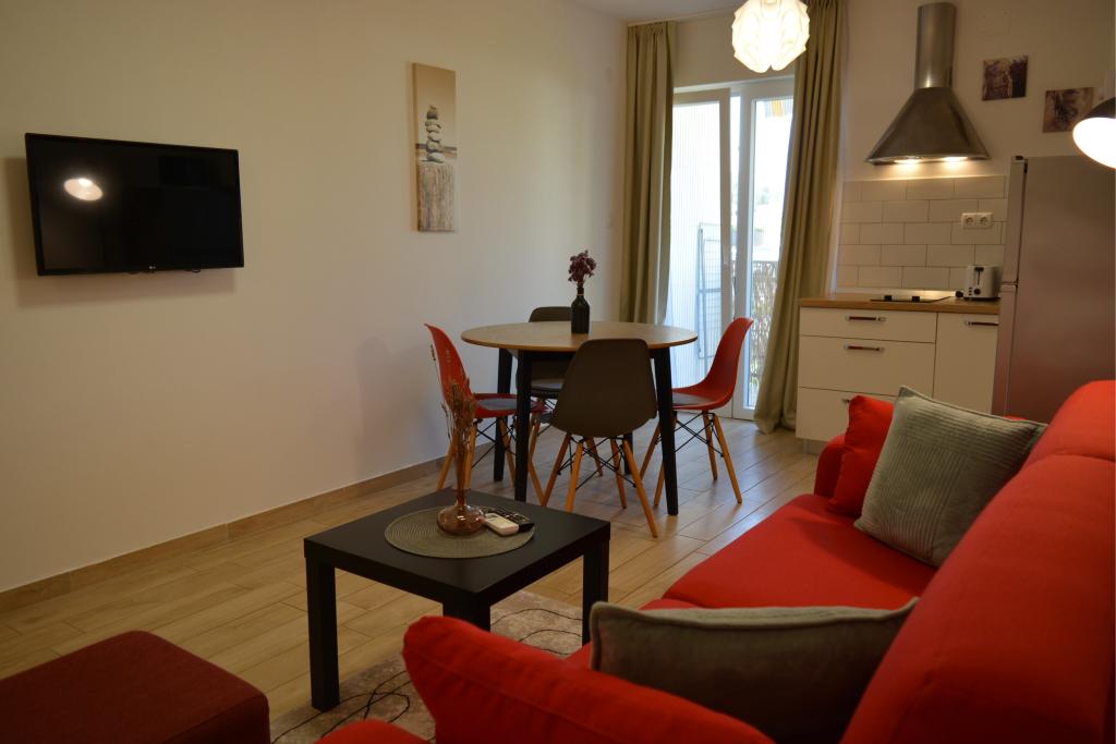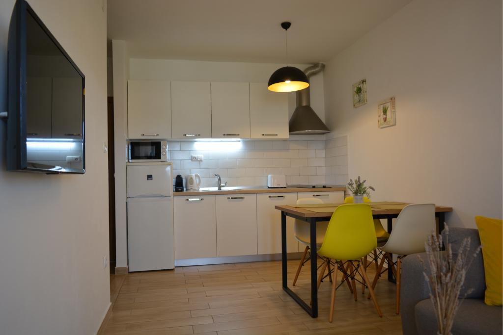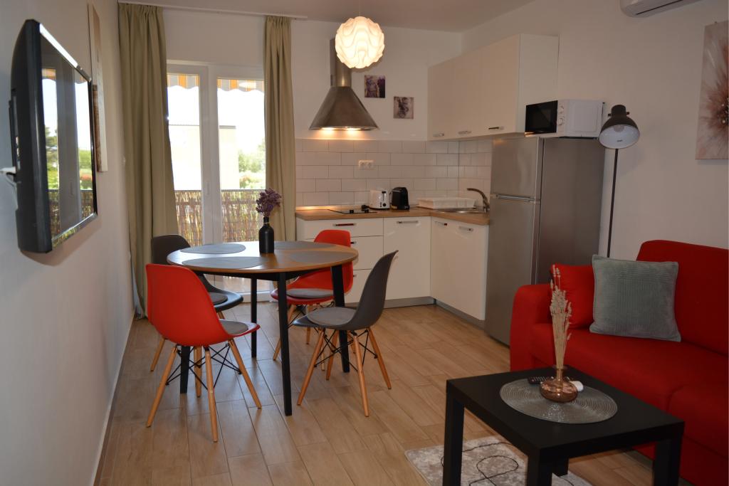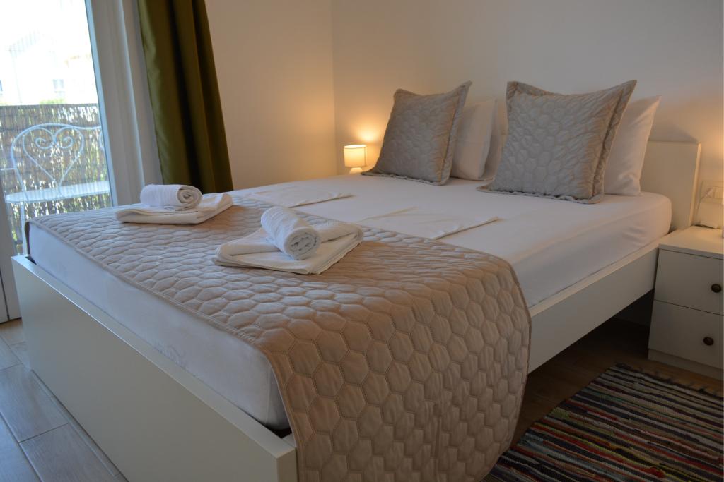 4 apartamente complet recent renovate de închiriat în Tribunj, la 5 km de Vodice și la 12 km de Šibenik. Apartamentele sunt situate într-o locație atractivă la doar 150 m de plaja principală a orașului. In imediata apropiere a apartamentului se afla restaurante, cafenele, magazine si o farmacie. 3 apartamente (2+2) constau dintr-un dormitor cu un pat dublu mare, o bucatarie, un living cu o canapea extensibila (canapea de calitate cu saltea), o baie si un balcon cu vedere la mare. Garsoniera este destinata pentru doua persoane. Are o bucătărie, un pat dublu, o baie și un balcon cu vedere la mare. Toate apartamentele sunt dotate cu aer condiționat, uscător de păr, smart TV și Wi-Fi gratuit. Parcare securizata in fata apartamentului.