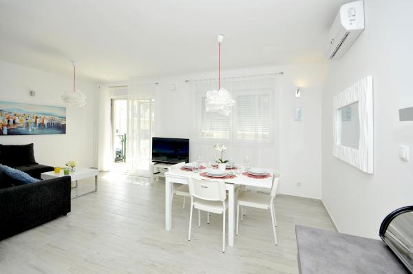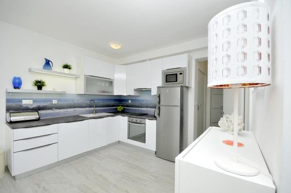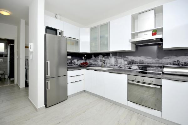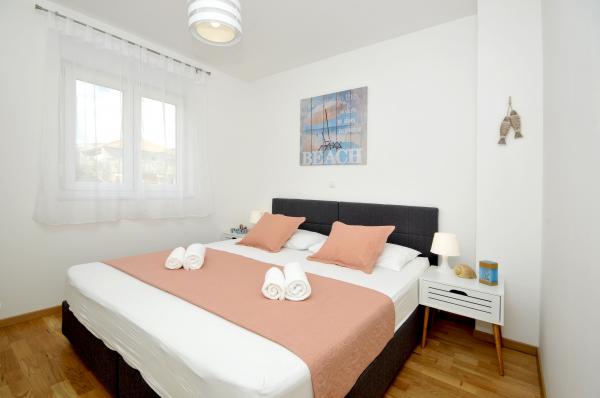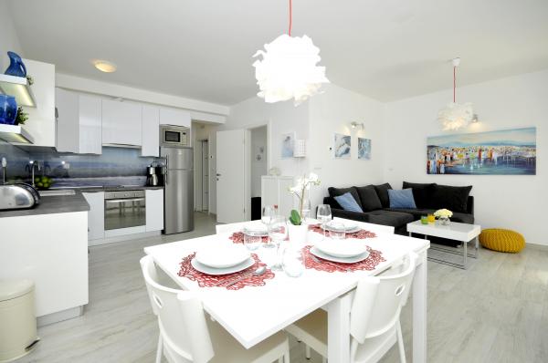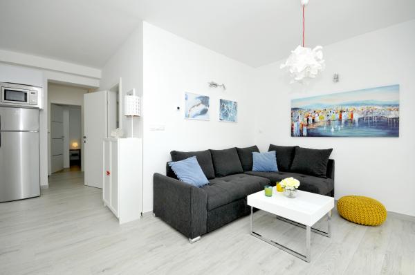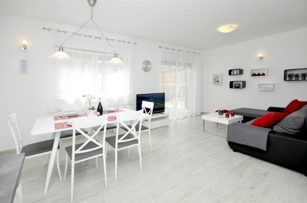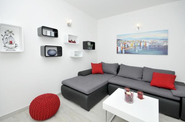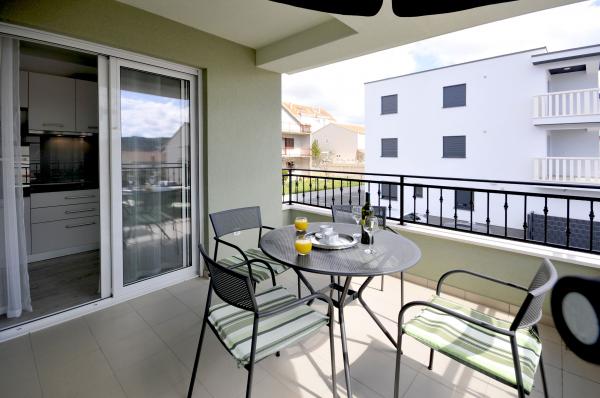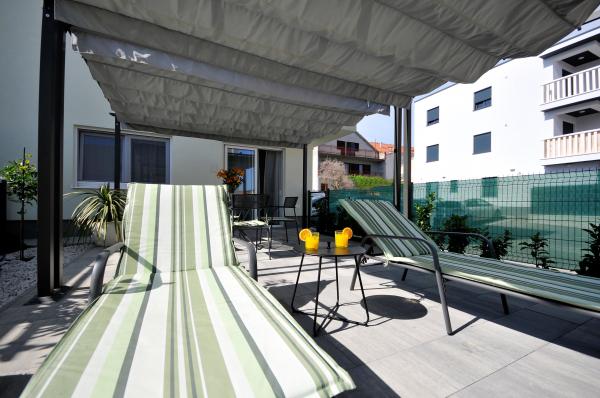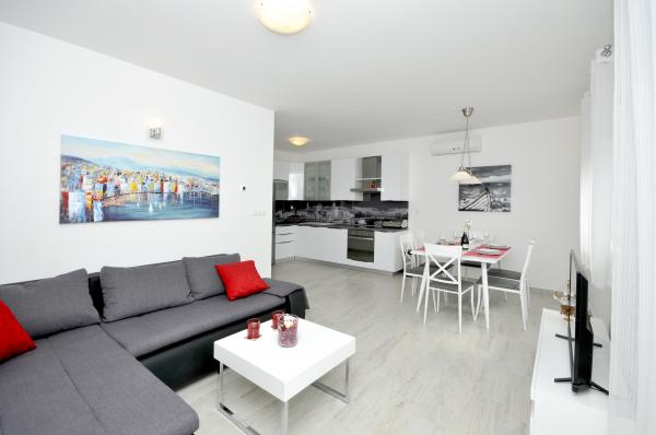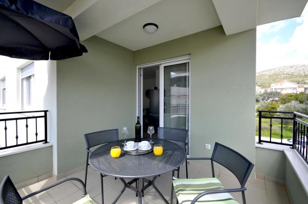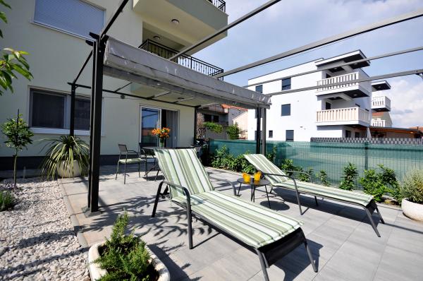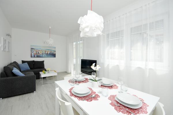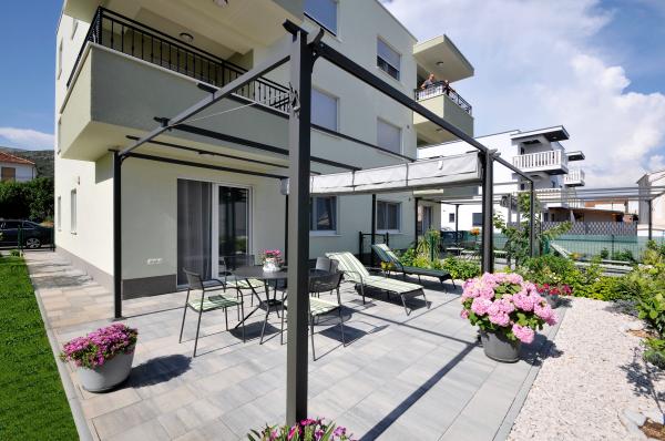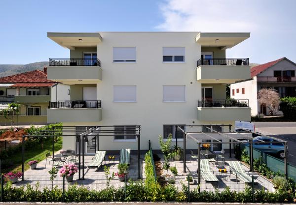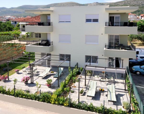 Apartamentele Town Trogir sunt situate pe continentul orașului Trogir, într-o locație excelentă, la doar 400 m de centrul vechi al orașului și la 900 m de plaja nouă a orașului. Plaja poate fi accesată printr-o promenadă de-a lungul mării. Toate facilitățile principale se află la câțiva pași, în 5-10 minute de mers pe jos. Apartamentele Town Trogir sunt noi și sunt situate într-o mică clădire rezidențială cu 6 apartamente. Apartamentele au o suprafață de 50-60 m2. Apartamentele sunt situate la parter. Apartamentele sunt decorate modern și complet utilate. Apartamentele au 2 dormitoare, un living cu sufragerie, o bucătărie complet utilată, o baie și o terasă mare cu mobilier de grădină la parter. Parcarea gratuită este asigurată în fața clădirii. Lenjeria de pat și prosoapele sunt incluse. WiFi este gratuit. Taxa de turist este inclusă în preț.
