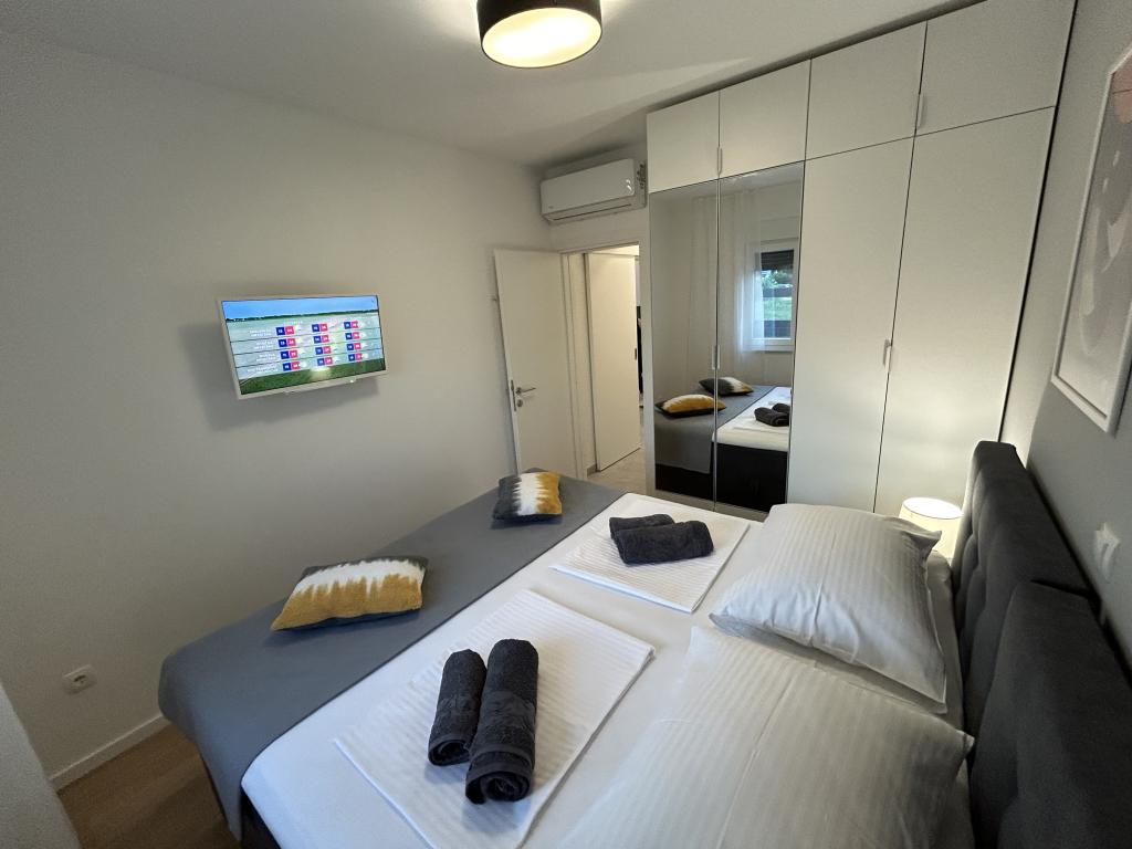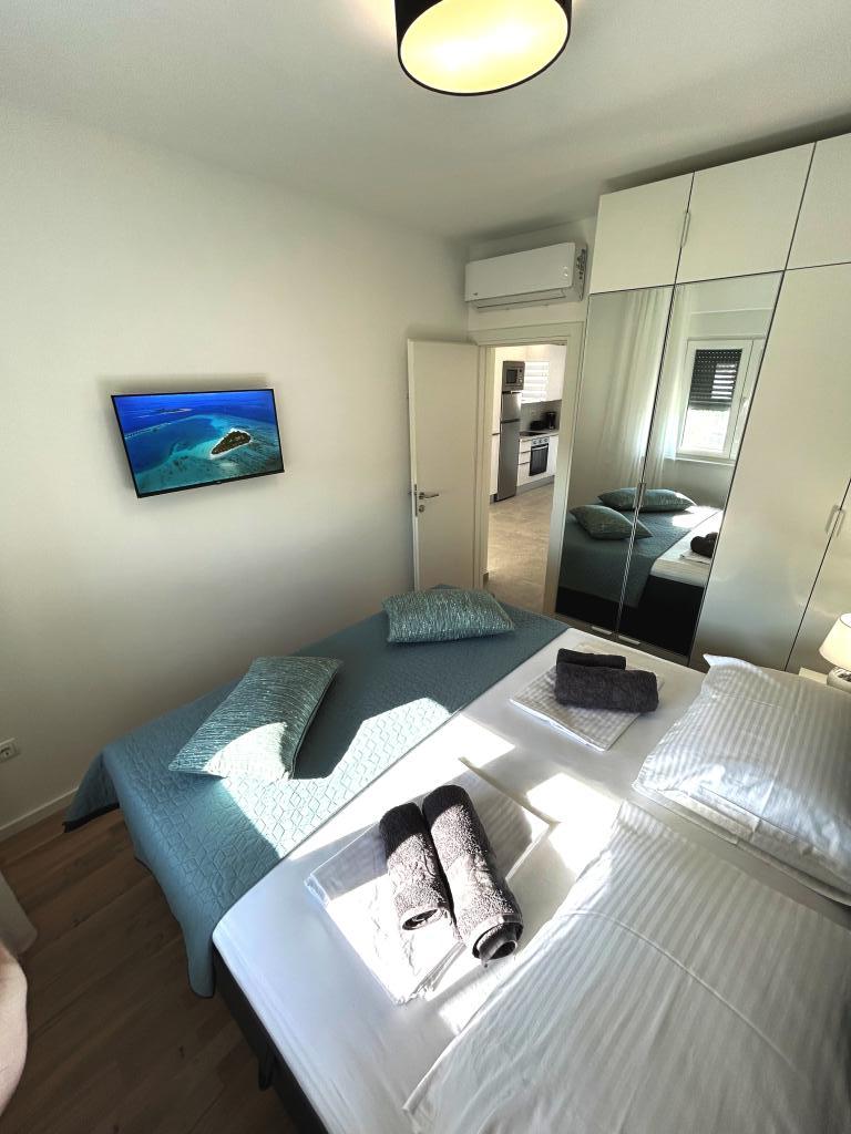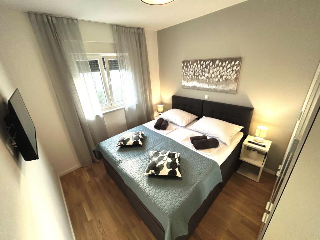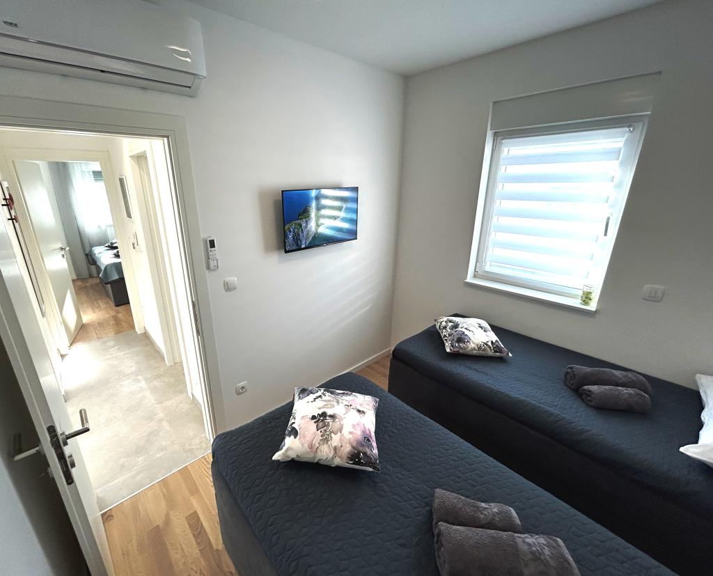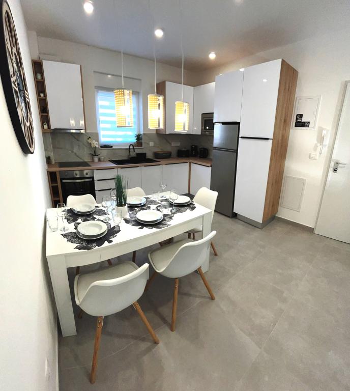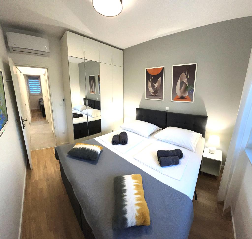 Apartamentele Town Trogir sunt situate pe continentul orașului Trogir, într-o locație excelentă, la doar 400 m de centrul vechi al orașului și la 1000 m de plaja nouă a orașului. Plaja poate fi accesată printr-o promenadă de-a lungul mării. Toate facilitățile principale se află la câțiva pași, o plimbare de 5 până la 10 minute. Apartamentele Town Trogir sunt noi și sunt situate într-o mică clădire rezidențială cu 6 apartamente. Apartamentele au o suprafață de aproximativ 60 m2. Apartamentele sunt situate la parter, etajul 1 și etajul 2. Apartamentele sunt decorate modern și complet utilate. Apartamentele au 2 dormitoare, un living cu sufragerie, o bucătărie complet utilată, o baie și terase mari cu mobilier de grădină la parter. Livingul și dormitoarele au unități de răcire separate. Parcarea gratuită este asigurată în fața clădirii. Lenjeria de pat și prosoapele sunt incluse. WiFi este gratuit. Taxa de turist este inclusă în preț.