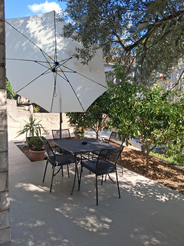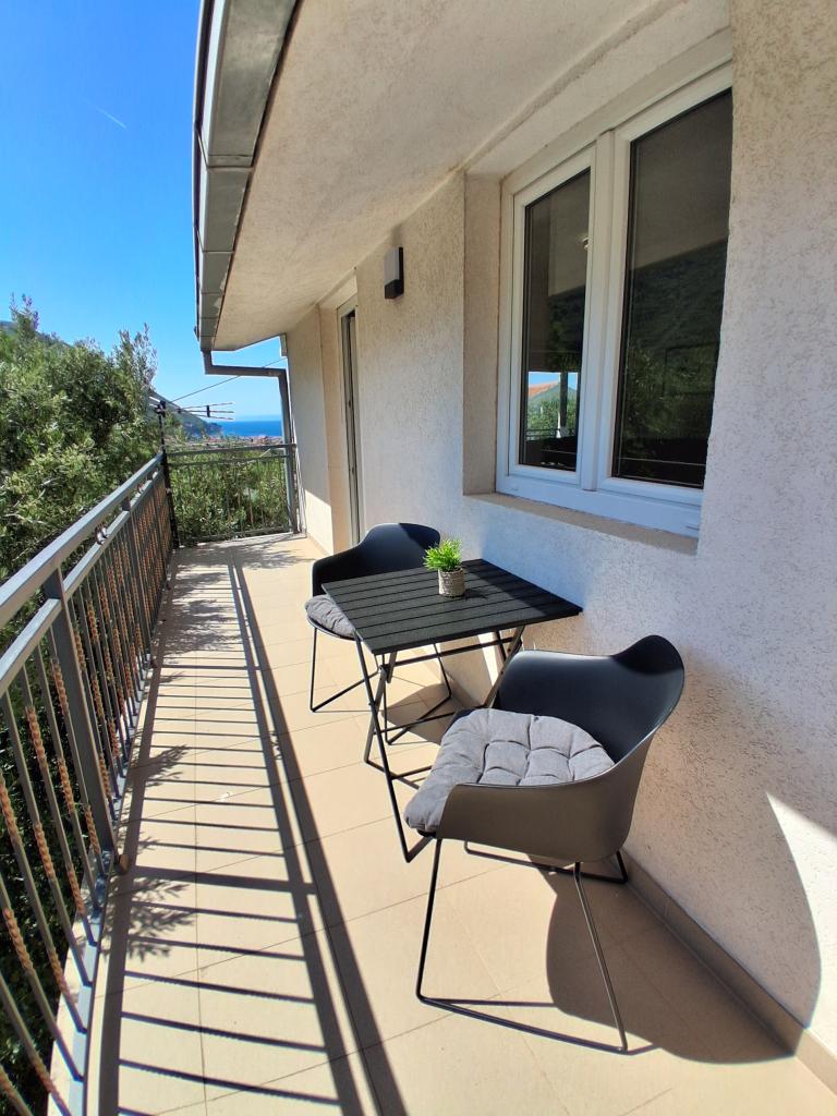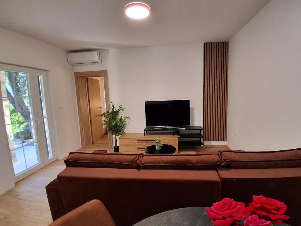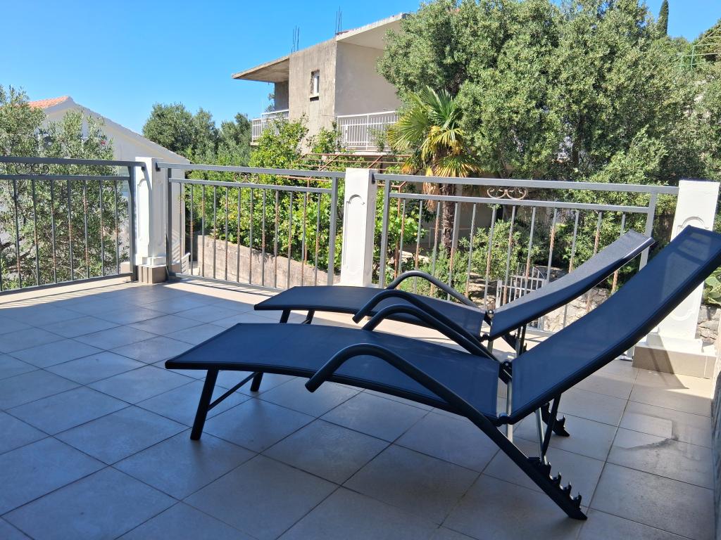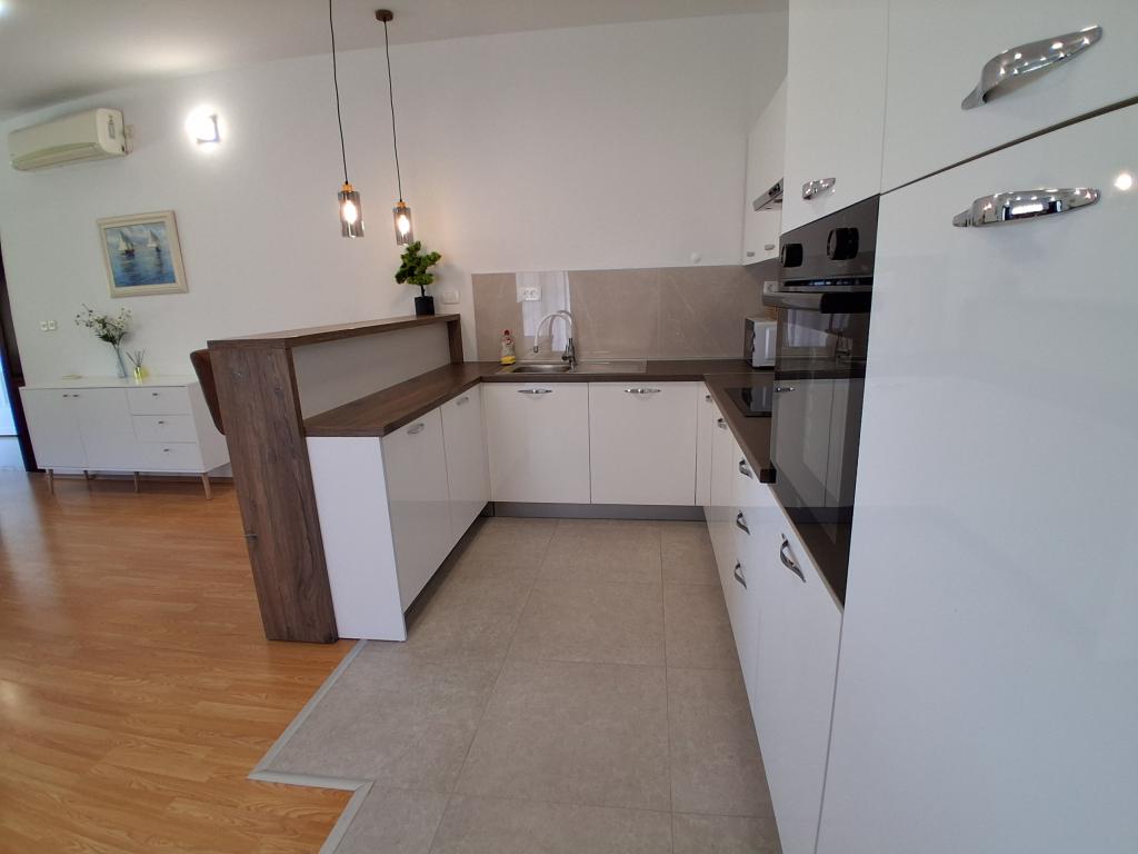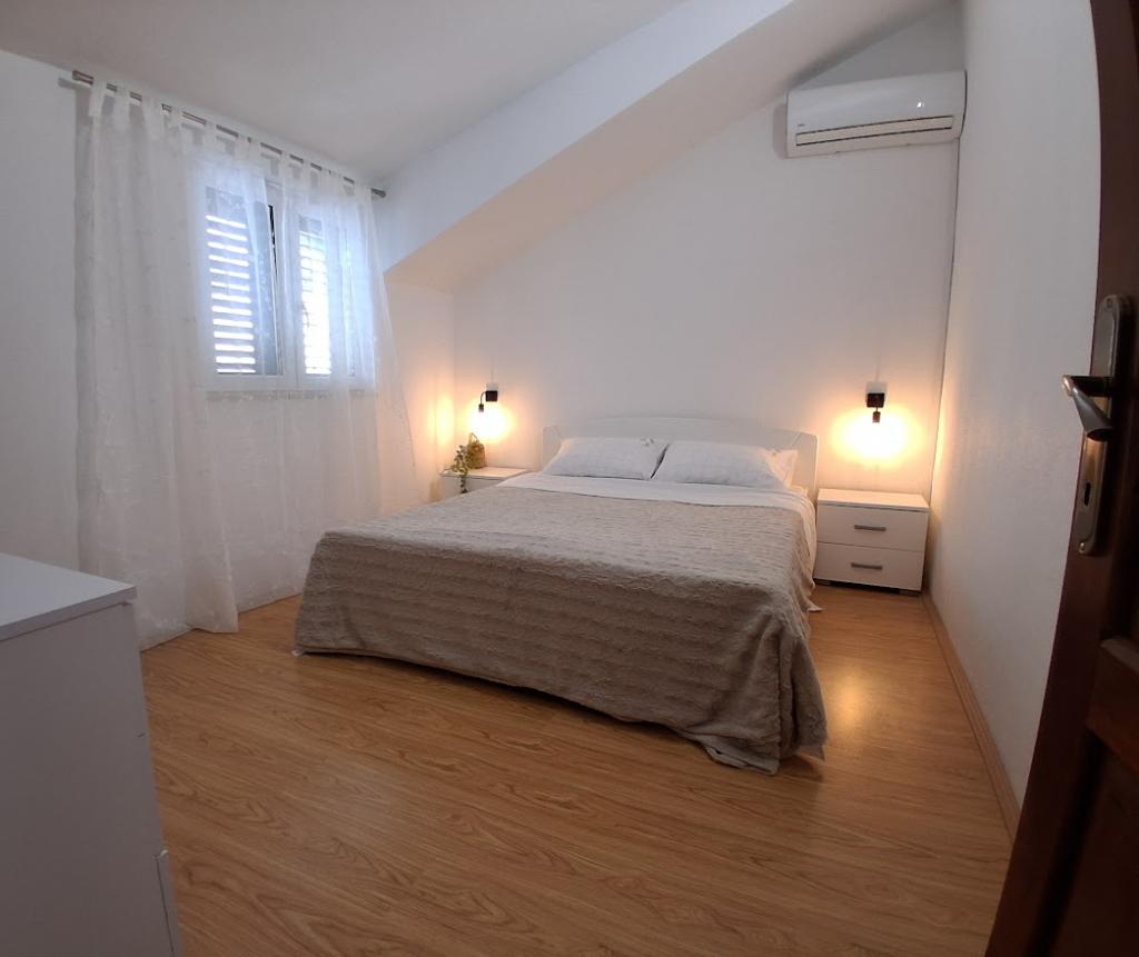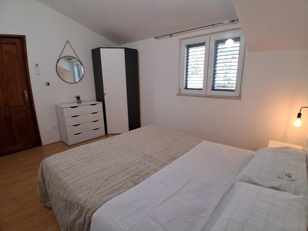 Apartament mare cu două dormitoare, complet și modern echipat, cu vedere la mare și terasă mare acoperită - întregul etaj și apartament cu un dormitor la parter, cu o terasă minunată. APARTAMENT CU DOUĂ DORMITOARE este format din două dormitoare cu paturi duble, o baie, bucătărie spațioasă și living cu canapea care se transformă în pat, dacă este necesar. APARTAMENT CU UN DORMITOR este format dintr-o cameră cu pat dublu plus pat suplimentar pentru o a treia persoană. Există, de asemenea, posibilitatea unei canapele extensibile în living. La 5-7 minute de plaja frumoasă și de barul de pe plajă; Distanța până la centru este de aproximativ 10 minute de mers pe jos. Prețul include parcare, WI-FI, aer condiționat în fiecare cameră, prosoape, mașină de spălat și mașină de spălat vase, toaletă, fierbător electric, aparat de cafea (apartament cu două dormitoare), uscător de păr, fier de călcat și masă de călcat (apartament cu două dormitoare).