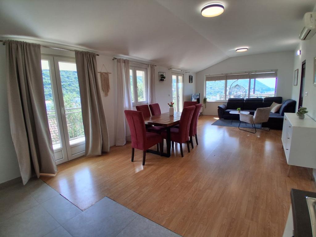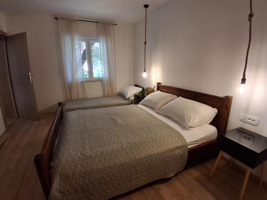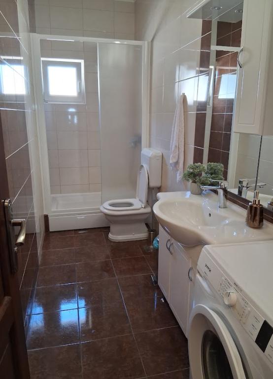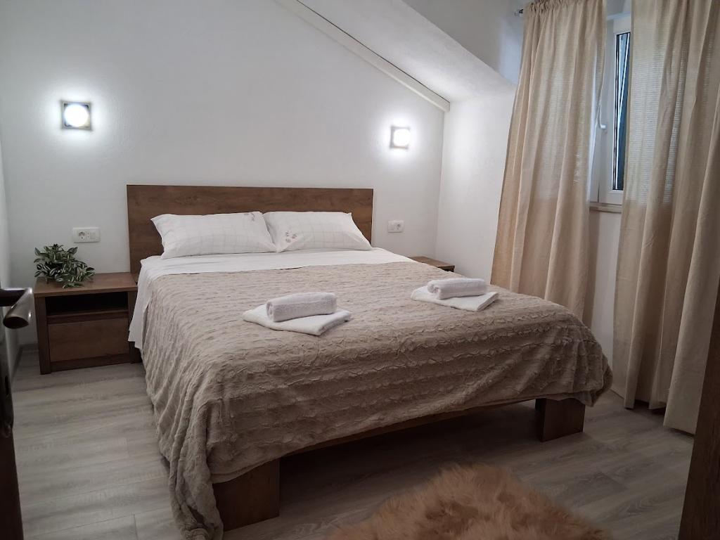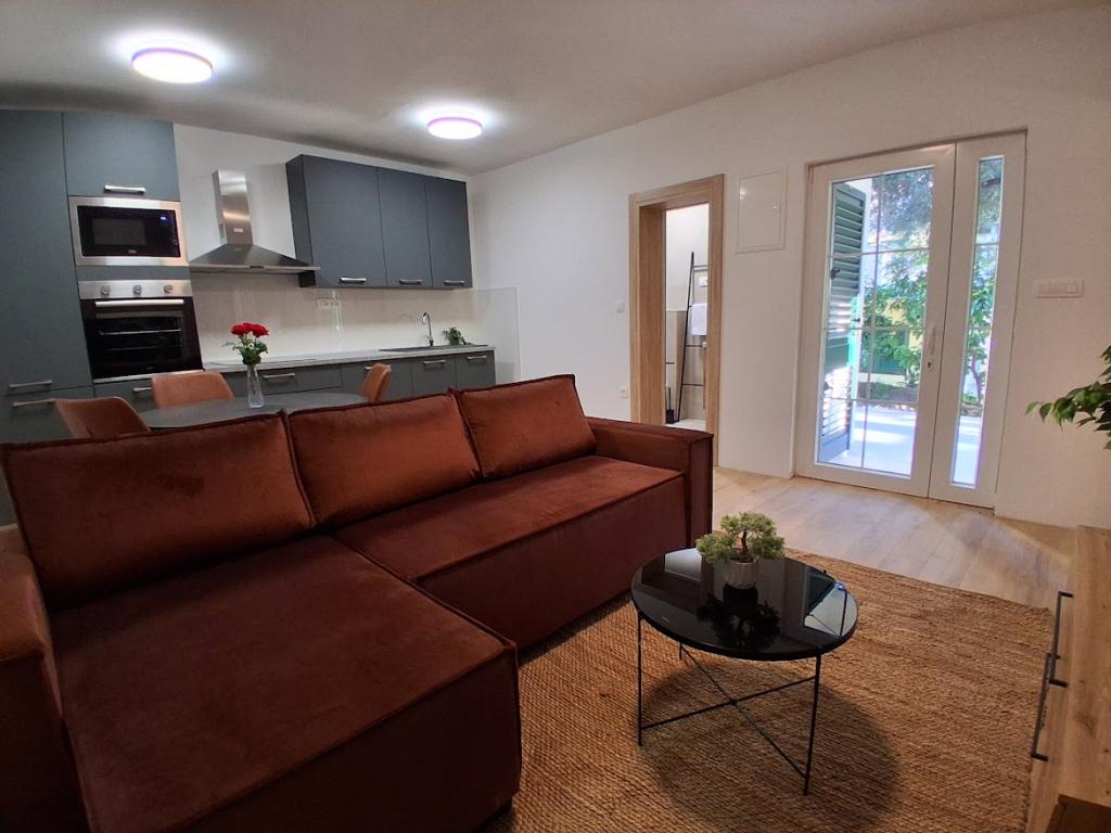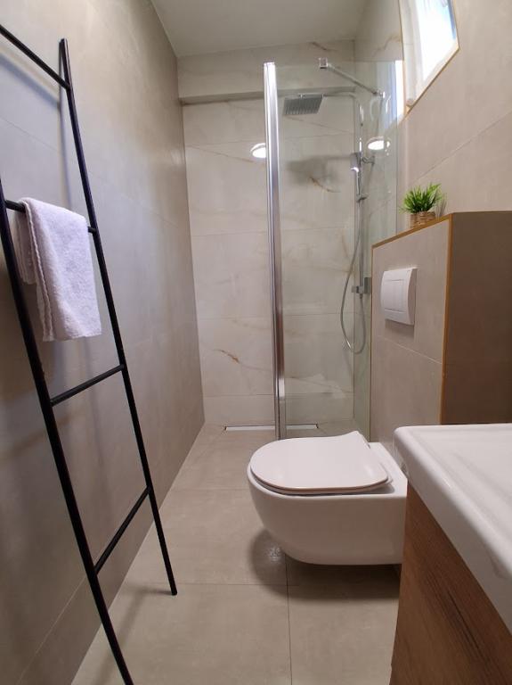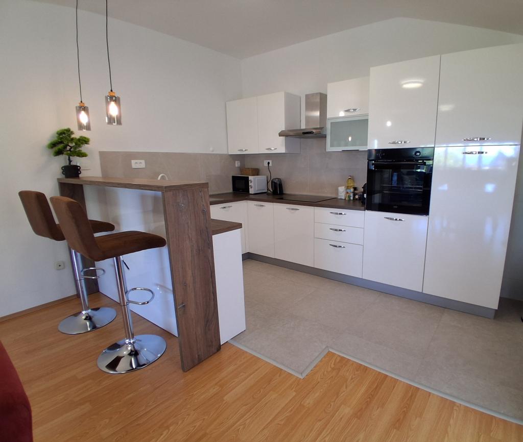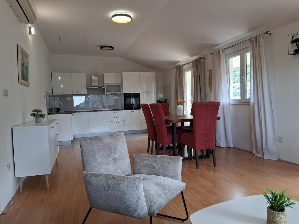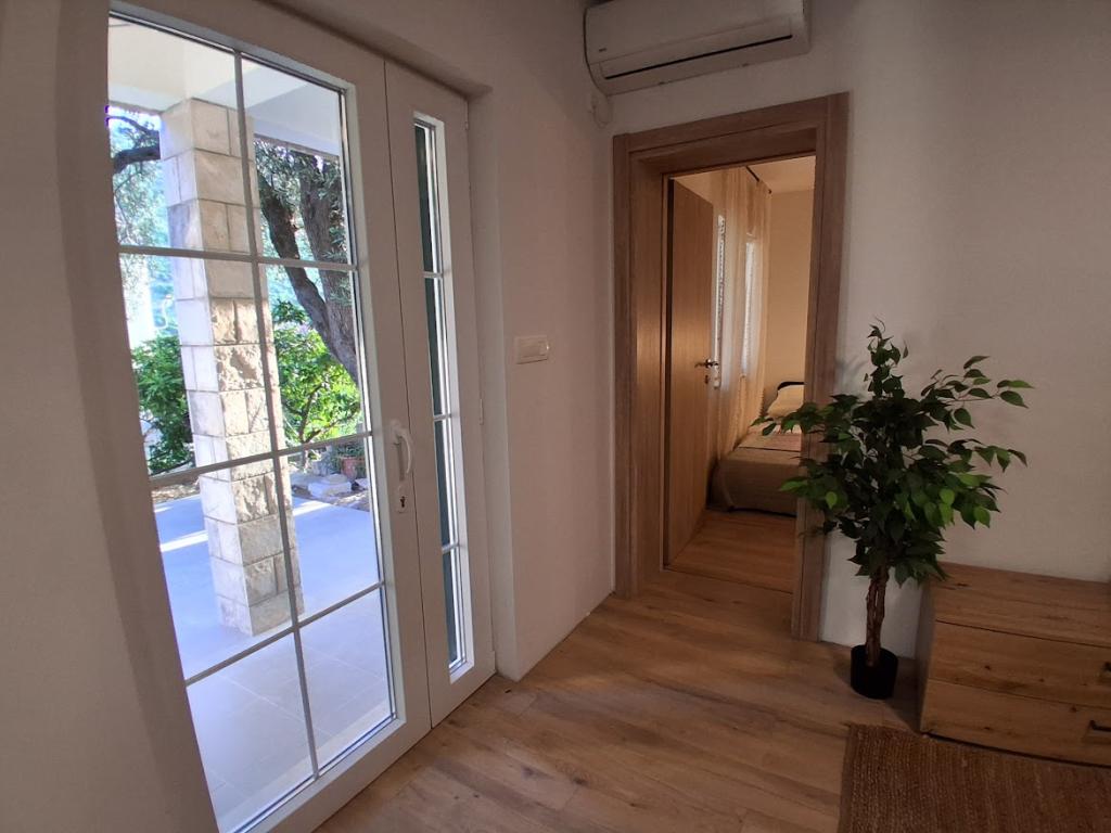 Apartament mare cu două dormitoare, complet și modern echipat, cu vedere la mare și terasă mare acoperită - întregul etaj și apartament cu un dormitor la parter, cu o terasă minunată. APARTAMENT CU DOUĂ DORMITOARE este format din două dormitoare cu paturi duble, o baie, bucătărie spațioasă și living cu canapea care se transformă în pat, dacă este necesar. APARTAMENT CU UN DORMITOR este format dintr-o cameră cu pat dublu plus pat suplimentar pentru o a treia persoană. Există, de asemenea, posibilitatea unei canapele extensibile în living. La 5-7 minute de plaja frumoasă și de barul de pe plajă; Distanța până la centru este de aproximativ 10 minute de mers pe jos. Prețul include parcare, WI-FI, aer condiționat în fiecare cameră, prosoape, mașină de spălat și mașină de spălat vase, toaletă, fierbător electric, aparat de cafea (apartament cu două dormitoare), uscător de păr, fier de călcat și masă de călcat (apartament cu două dormitoare).
