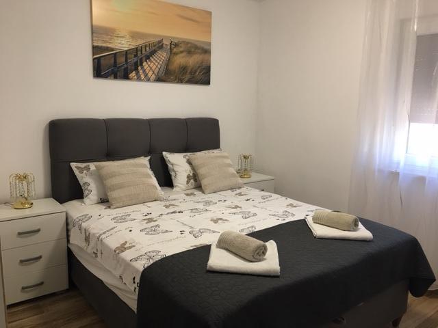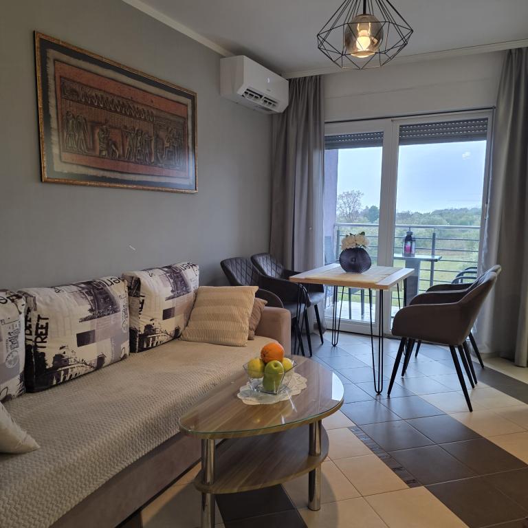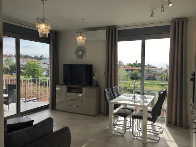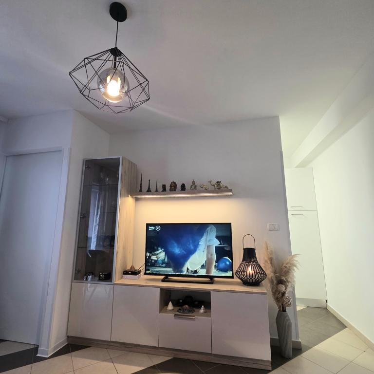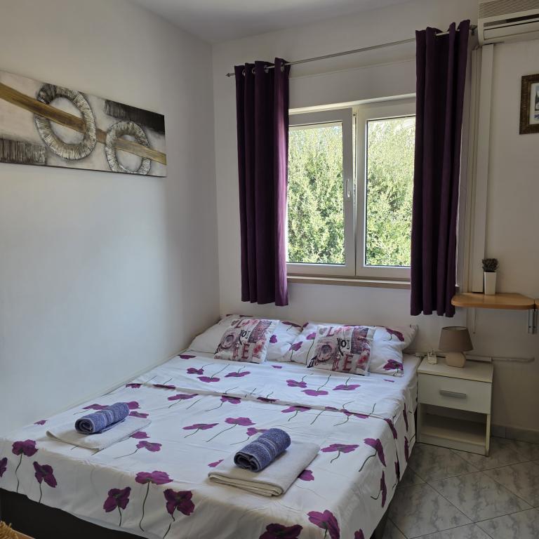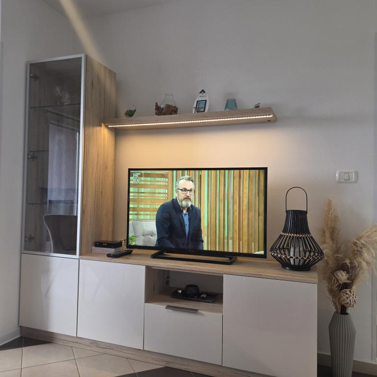 Apartamentele Mirella 4 sunt situate în rezidența recent construită Lavandă cu vedere la mare și o priveliște frumoasă a apusului. Spre mare și frumoasa plajă cu nisip este de doar 150m. Magazine, brutărie și restaurante la 200m. Spre centrul Umagului 3km. De-a lungul mării există o promenadă până la centrul orașului Umag, iar posibilitatea de a fi transportată cu trenul turistic. Apartamentele sunt dotate cu aer condiționat și complet echipate. Baie cu duș de masaj, mașină de spălat, uscător de păr, fier de călcat. Bucătărie cu mașină de spălat vase, cuptor cu microunde, filtru de cafea, ceainic frigider mare cu congelator și orice altceva pentru a face oaspeții să se simtă ca acasă. Sunt disponibile internet gratuit și parcare securizată. Prețul include utilizarea piscinei, șezlonguri, duș, două locuri, masă și scaune în partea acoperită a terasei de lângă piscină. Vă mulțumim că ați ales Apartamente Mirella, sper că, în schimb, vă vom satisface dorințele în timpul șederii dvs. în apartamentele noastre. Scopul nostru este satisfacția și recomandarea dvs. Stimați oaspeți, bun venit la Apartamente Mirella!