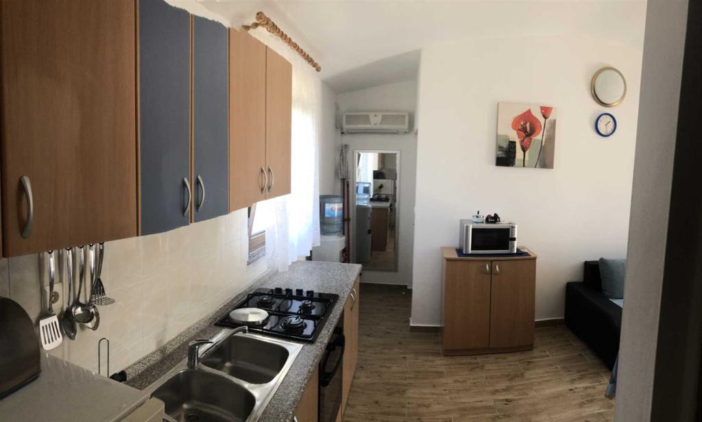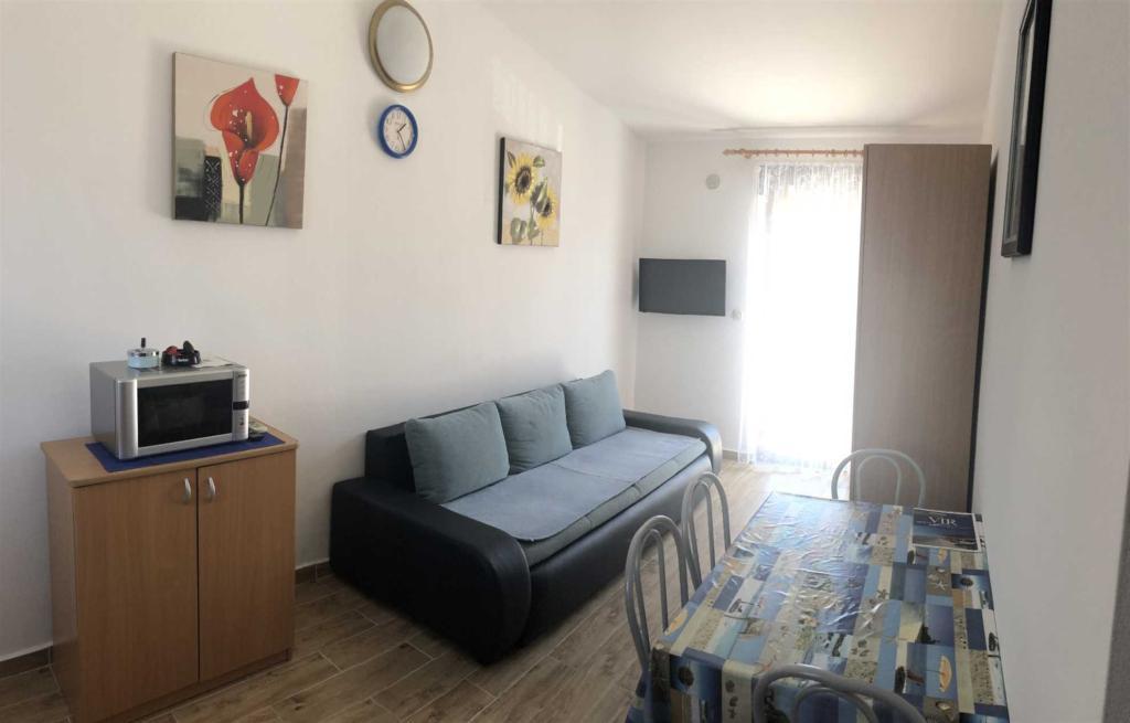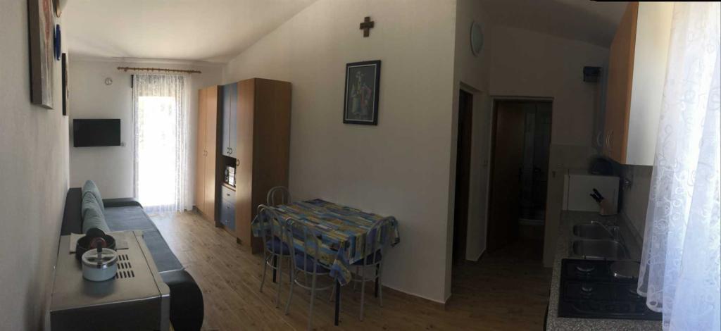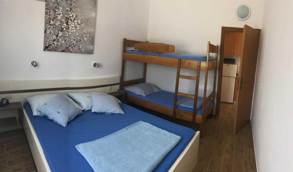 Apartament (***) pentru 4 persoane, la 70m de plaja Žitna uvala, este situat la primul etaj. Apartamentul este dotat cu televizor LED (TV+SAT), radio, Wi-Fi, loc de parcare pentru un vehicul în curtea împrejmuită, aer condiționat (utilizarea este inclusă în preț). În bucătărie veți găsi toate echipamentele și electrocasnicele necesare (cum ar fi frigider cu congelator mare, cuptor cu microunde, încălzitor de apă etc.), dormitorul conține un pat dublu și un pat suprapus, un pat suplimentar se află în sufragerie (cu un pat suplimentar apartamentul poate găzdui 5 persoane), un balcon spațios acoperit de 20 m2 cu vedere la mare (insula Pag și Velebit) cu masă, scaune și șezlonguri.