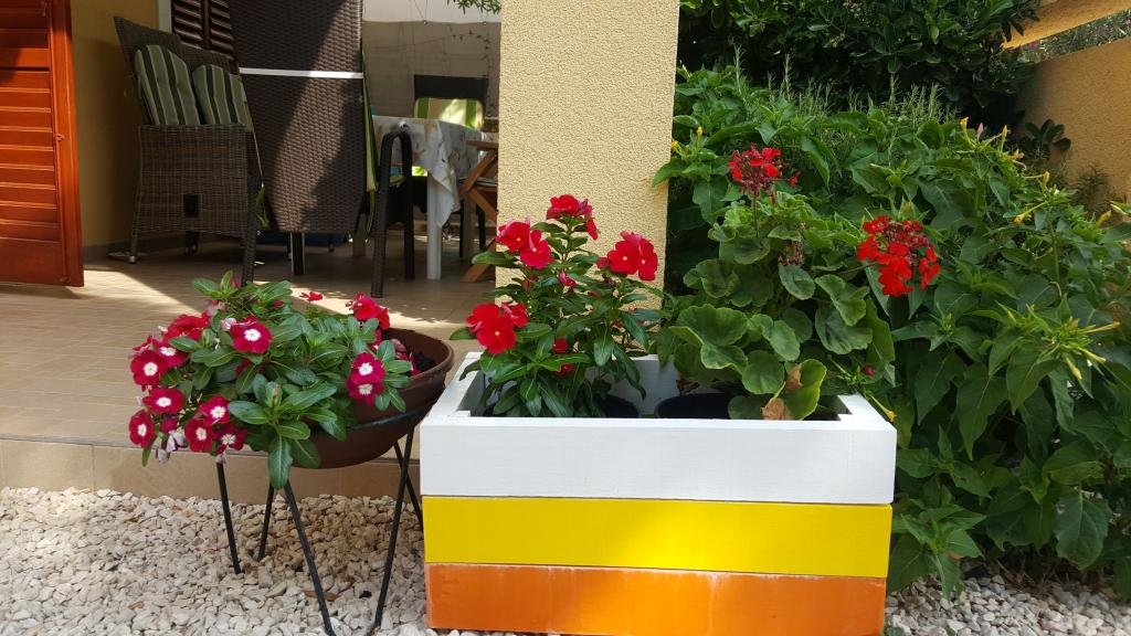 Dragi oaspeți, vă așteaptă două apartamente frumos decorate într-o zonă liniștită din Vir, cu multă verdeață, nu departe de centrul orașului. Apartamentele sunt situate la primul etaj al casei familiale cu intrări separate. Fiecare apartament are o terasă mare dotată cu masă, scaune și umbrelă de soare unde vă puteți bea cafeaua de dimineață în timp ce vă bucurați de mirosurile ierburilor mediteraneene și de cântecul greierii este asigurată în curte, precum și posibilitatea de a folosi un grătar. Apartamentele se află la 5 minute de mers pe jos de prima plajă, Lučica, și la zece minute de centrul orașului, unde au loc concerte gratuite, și de plaja Jadro. În apropiere se află magazine bine aprovizionate, cafenele, restaurante, cluburi și taverne, un loc de joacă pentru copii, un parc acvatic și numeroase plaje, de la nisip până la pietriș și beton, cu facilități însoțitoare. Avantajul locației noastre este că puteți ajunge la plajă pe partea de nord și de sud și toate facilitățile necesare pe jos.
