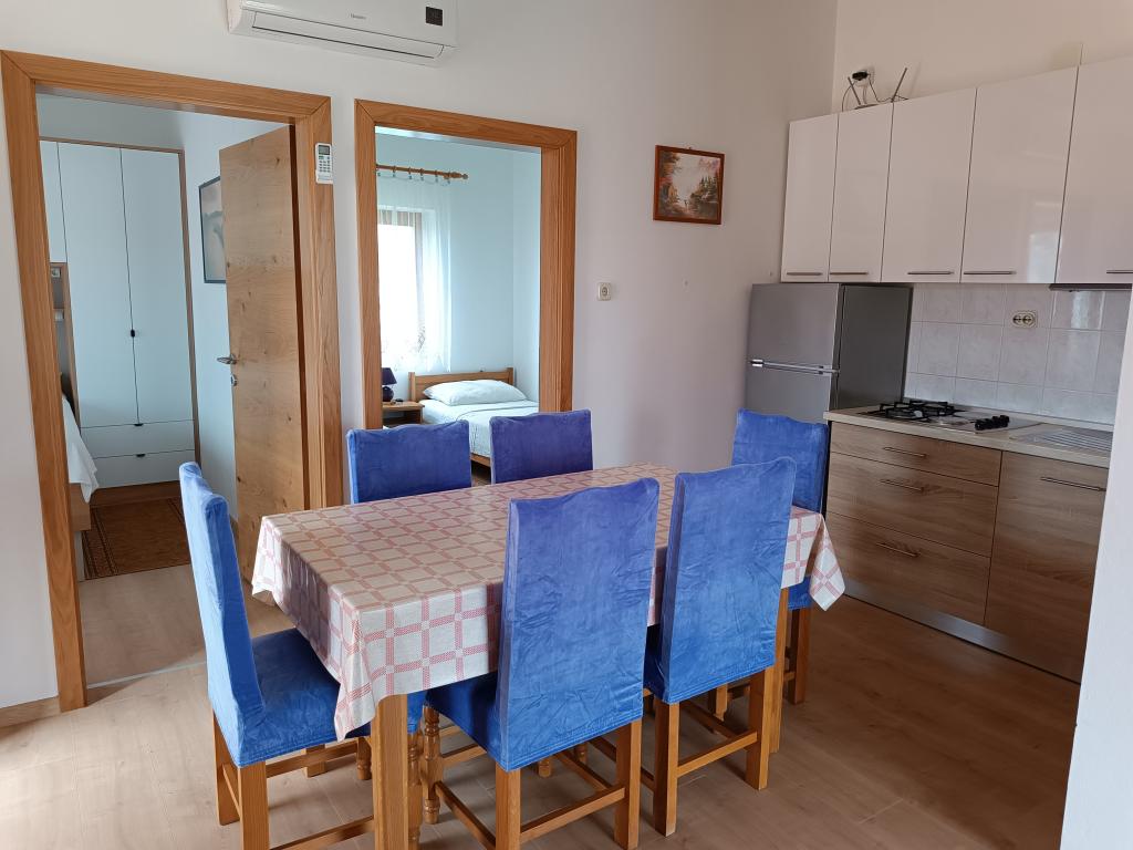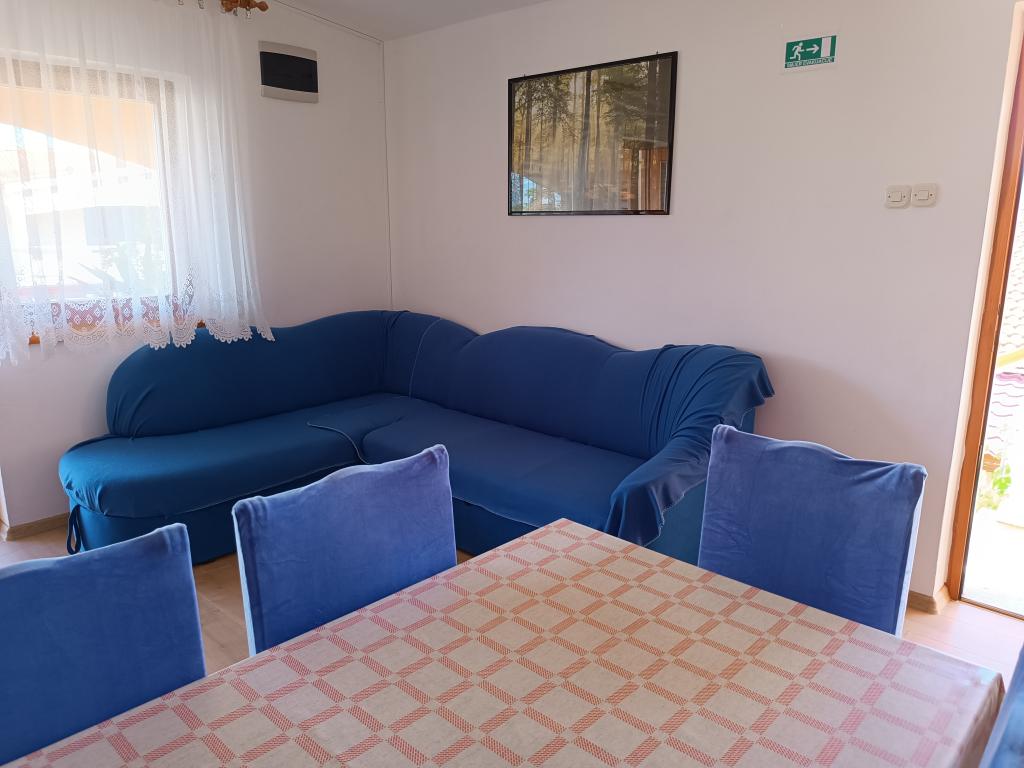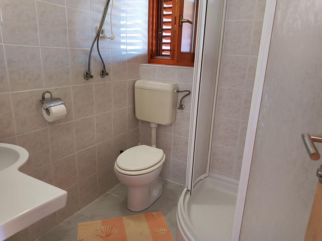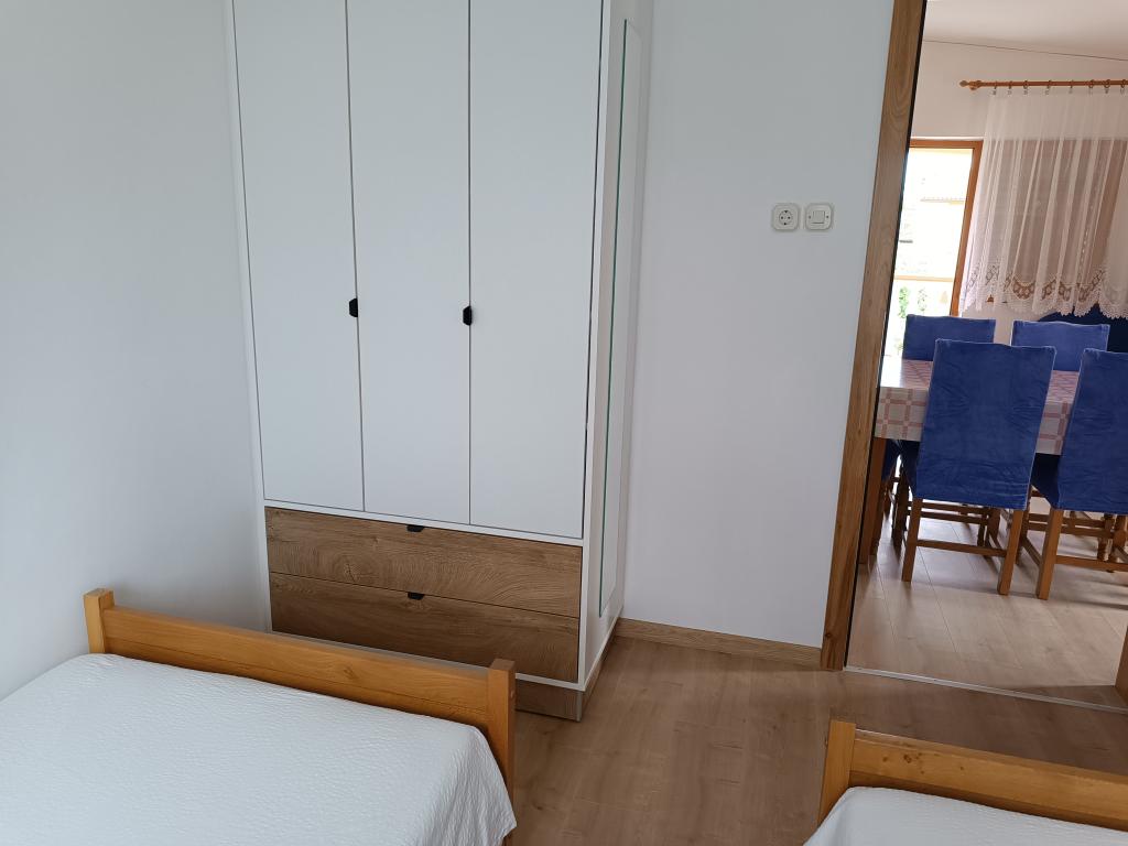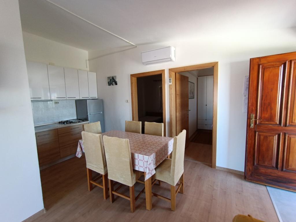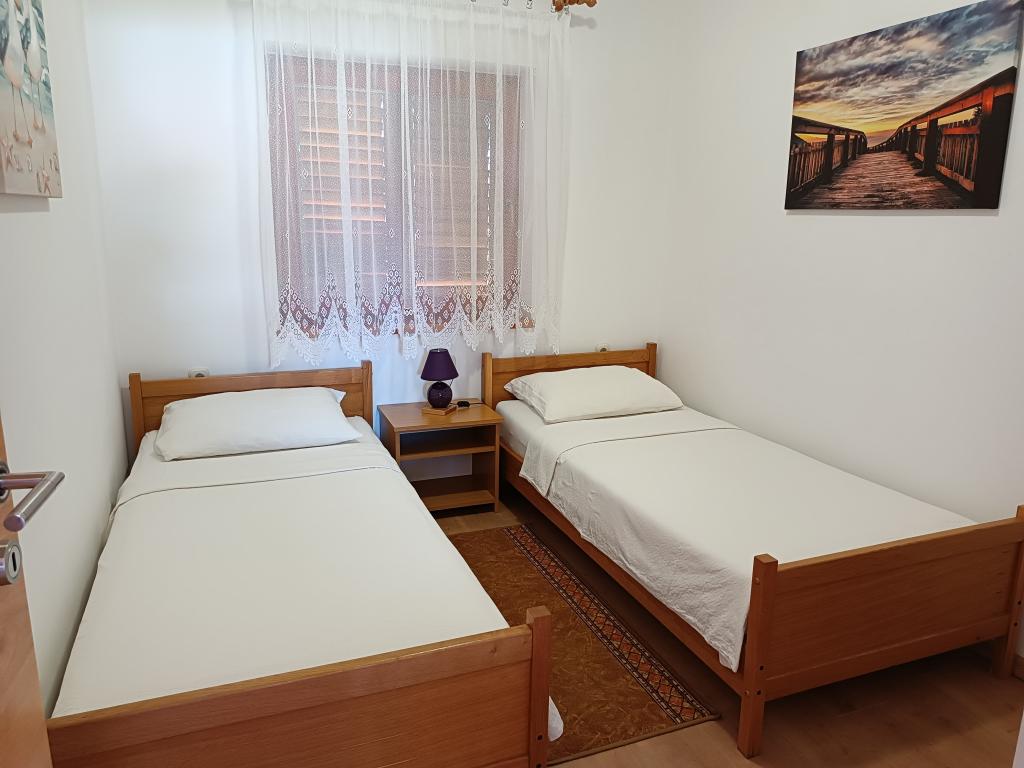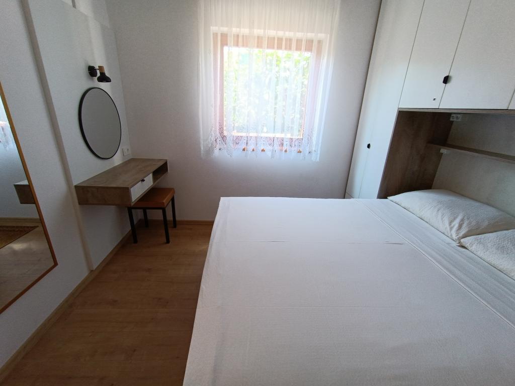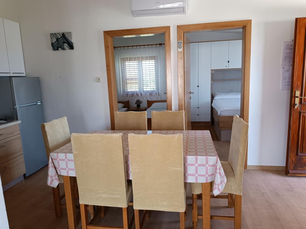 Închiriem trei apartamente identice, mai mari, cu aer condiționat pentru 4 persoane și un apartament mai mic pentru două persoane. Una mai mare este la parter în stânga și două la primul etaj. Cel mai mic este la parter în dreapta. Apartamentele mai mari au două dormitoare și o cameră de zi, în timp ce apartamentele mai mici au un dormitor și o cameră de zi. Fiecare apartament are o intrare separata si o terasa de 12 mp. În apartamente primești toată lenjeria de pat și vesela pentru gătit și servirea alimentelor și băuturii. Oaspeții sunt rugați să-și aducă propriile mijloace pentru spălarea și ștergerea vaselor, precum și prosoape pentru baie și totul pentru igiena personală. Cea mai apropiată plajă (Žitna uvala) este la 100 m. Afară pe plajă este pietriș, iar în apă este nisip. Este potrivit pentru copii. Există o promenadă lungă și o pistă de biciclete de-a lungul plajei. Pe plajă există mai multe restaurante și o înghețată. Pe o rază de 150-250 de metri se află o fructărie, o brutărie, mai multe magazine alimentare și magazine cu echipamente de plajă. Strada noastră nu este aglomerată. Este folosit doar de chiriașii și oaspeții săi. Este pavata si dispune de iluminat public.