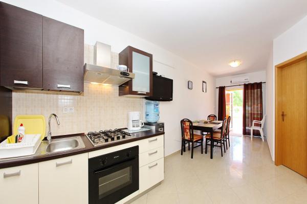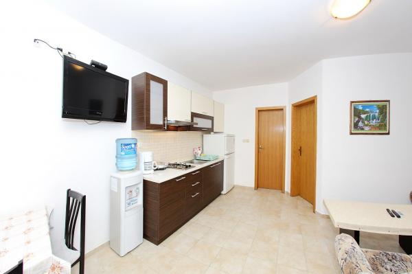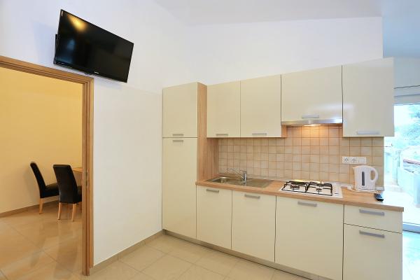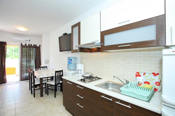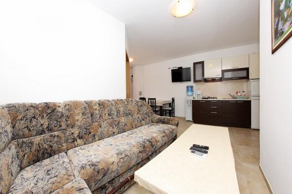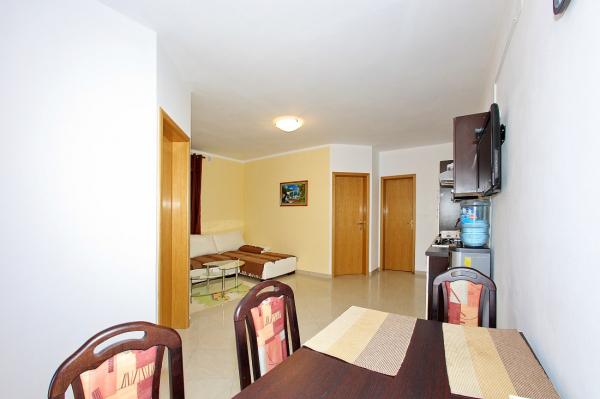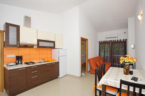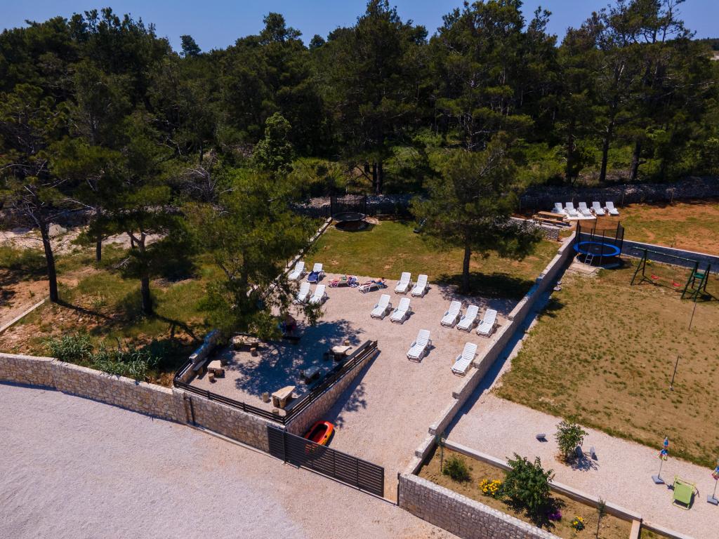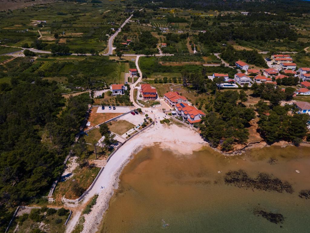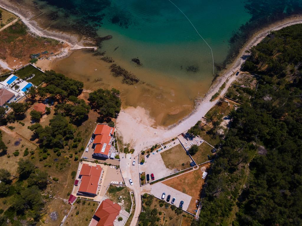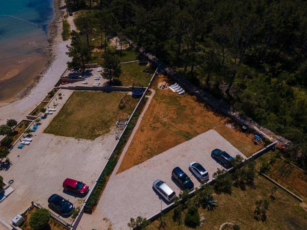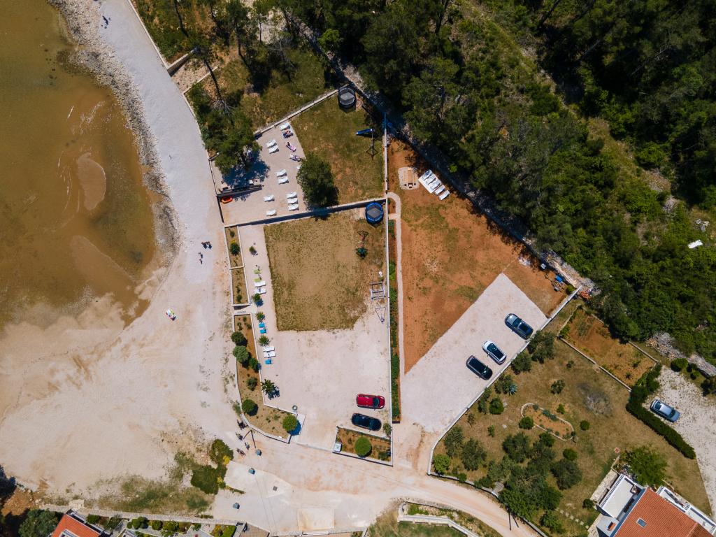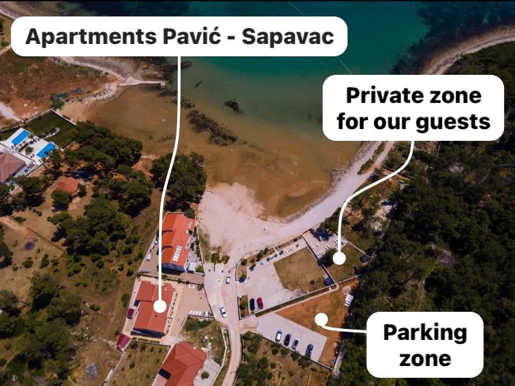 Apartamentele sunt situate în golful liniștit Sapavac, chiar lângă plajă, înconjurate de o pădure de pini. Ideal pentru o vacanta in familie, fara zgomot. Apartamentele sunt noi, decorate modern, cu toate electrocasnicele necesare si sunt dotate cu aer conditionat. Fiecare apartament are propria sa terasă cu vedere la mare. În curte există un grătar cu grătar și un spațiu de socializare, care este disponibil pentru oaspeți fără costuri suplimentare. Plaja este cu pietriș, iar marea are nisip foarte blând, ideal pentru copiii mici.