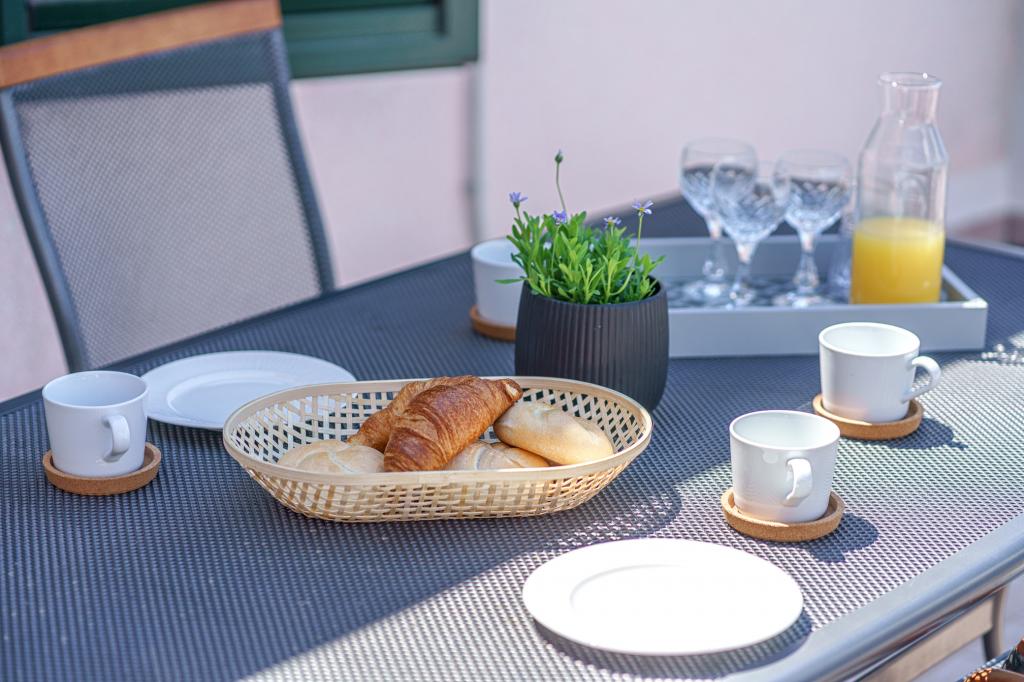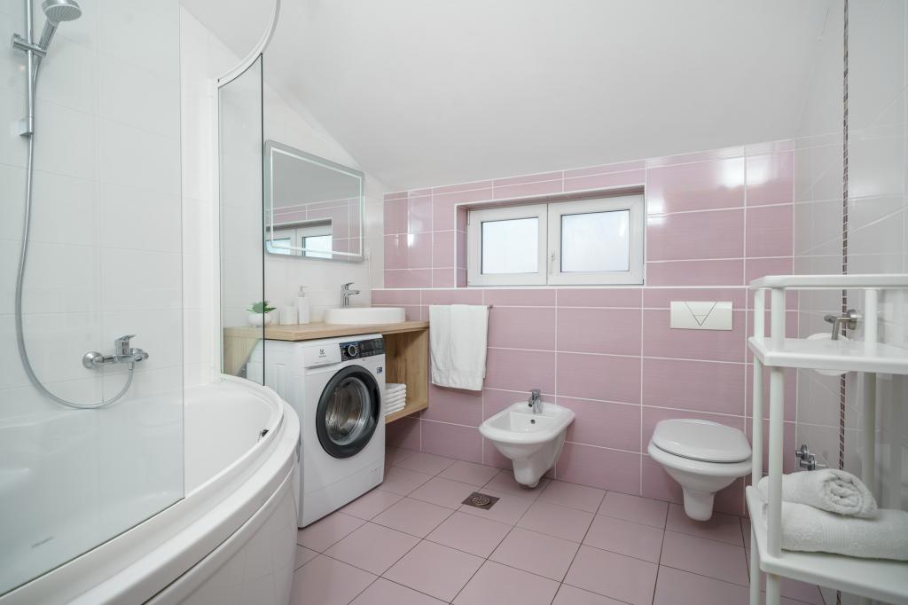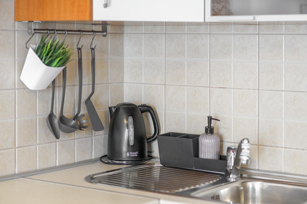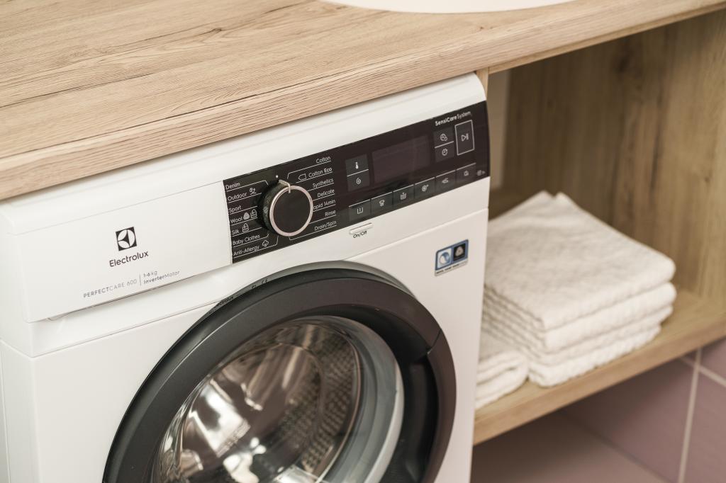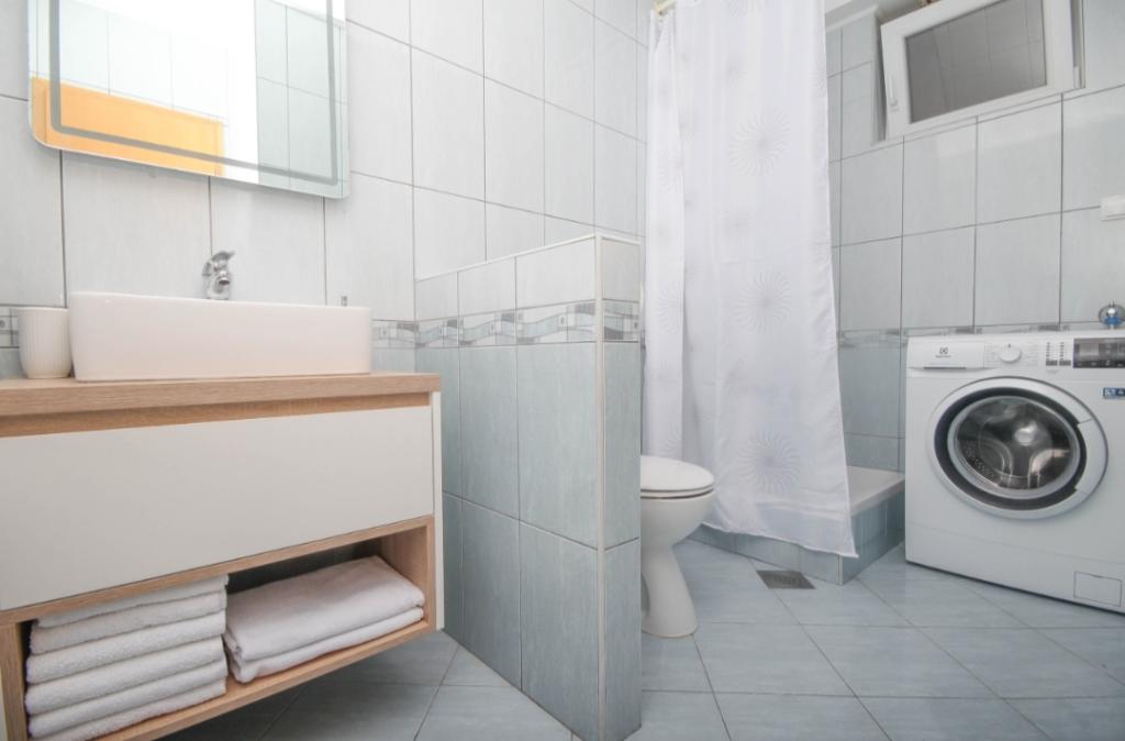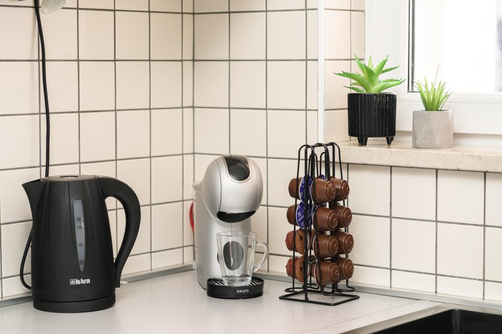 Pe lângă facilitățile de bază, cum ar fi condimente, ulei, oțet și detergent, apartamentul include și echipamente suplimentare pentru confortul dumneavoastră. Aparatul de cafea vine cu capsule, iar pentru curățarea hainelor și a vaselor sunt furnizate tablete și capsule, pe care le puteți găsi împreună cu aparatele corespunzătoare. De asemenea, sunt disponibile un fier de călcat și o masă de călcat, care permit călcarea ușoară ori de câte ori este nevoie. De asemenea, suntem aici pentru a vă ajuta cu orice întrebări sau sfaturi, fie că este vorba de recomandări pentru excursii, închirieri de bărci, biciclete sau orice alte servicii. Nu ezitați să ne contactați pentru orice lucru care vă poate îmbunătăți șederea!