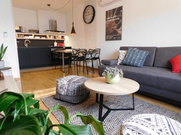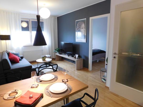 Apartament nou și modern situat la etajul 7 al unei clădiri noi, finalizate, la 300 de metri distanță de cea mai mare sală de sport din Croația, Arena Zagreb. Apartamentul este complet echipat. Spațiul de parcare este asigurat în parcarea de lângă clădire (securizată de o rampă). Apartamentul este dotat cu o încuietoare digitală și permite o sosire completă și o plecare completă, folosind un singur cod de intrare pentru clădire (introdus pe interfon) și un alt cod de intrare unic pentru apartamentul propriu-zis. După aceea, intri în apartament folosind o cartelă inteligentă. Se compune dintr-un hol, un living cu o bucătărie, un dormitor și o baie. Acesta este destinat pentru două persoane, și confortabil și confortabil poate găzdui până la trei persoane. În apartament veți fi întâmpinați cu instrucțiuni scurte, simple pentru încuietori și aparate inteligente (termostat, TV, iluminat cu LED în bucătărie, mașină de spălat vase). Pentru toate întrebările, ajutorul este disponibil timp de 24 de ore.