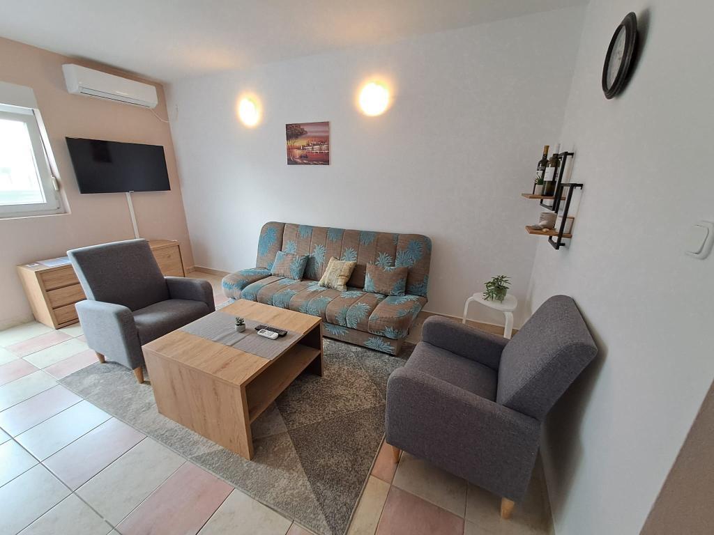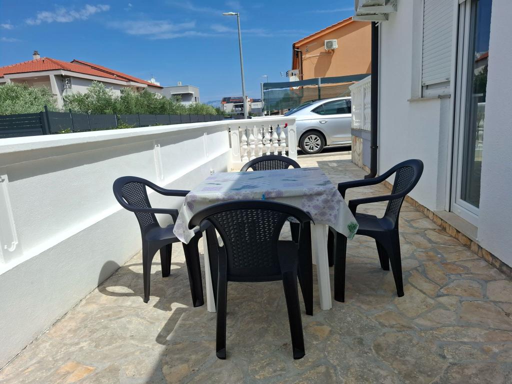 Este situat în orașul liniștit Zaton (Zadar). Distanța de la mare este de aproximativ 250 de metri, aceeași distanță până la prima plajă cu nisip. Apartamentul are o suprafata de 46 m2 si este complet utilat pentru o vacanta placuta in familie. Este compus din doua dormitoare, living, bucatarie si baie. Este disponibilă o cameră de depozitare separată. Apartamentul este la parter cu doua terase spatioase si un loc de parcare securizat pentru doua masini. Sunt disponibile internet Wi-Fi, Max TV, aer condiționat și grătar.