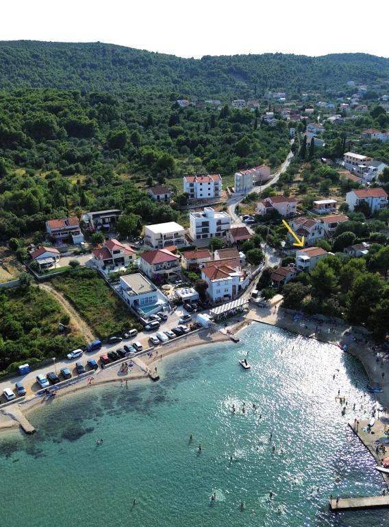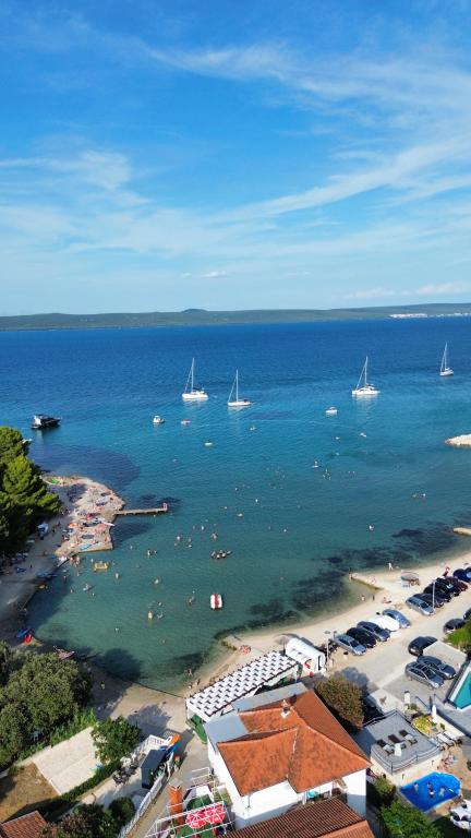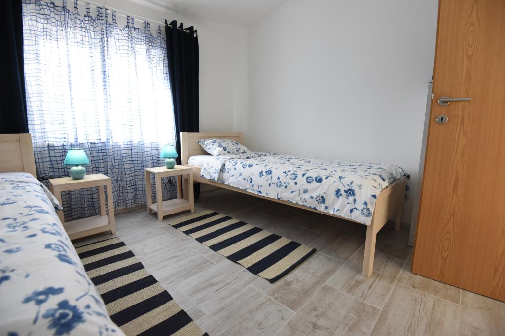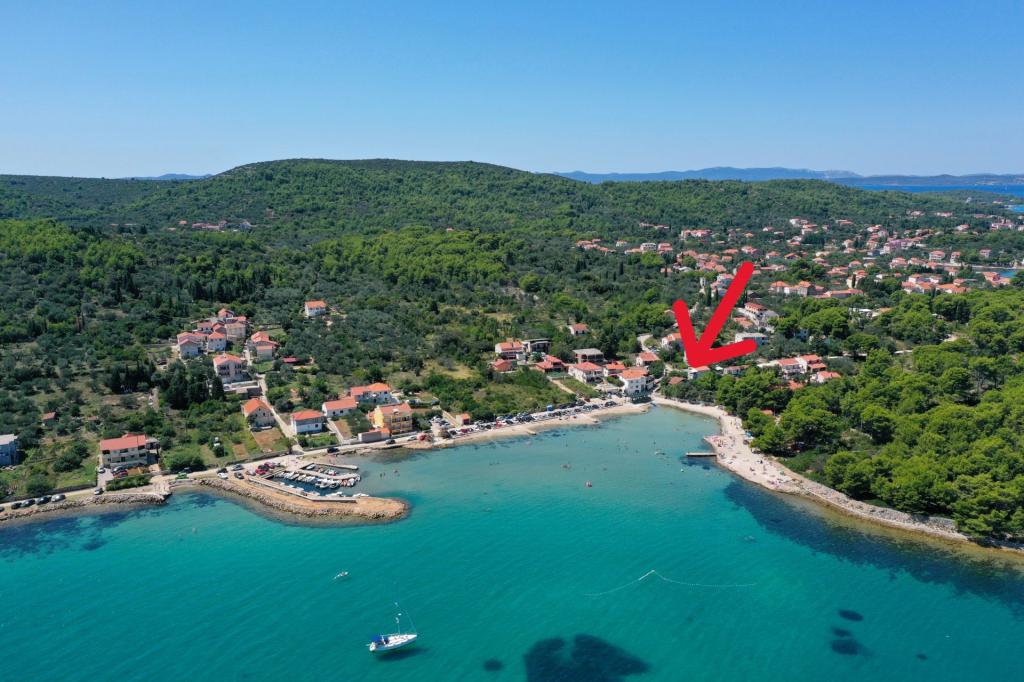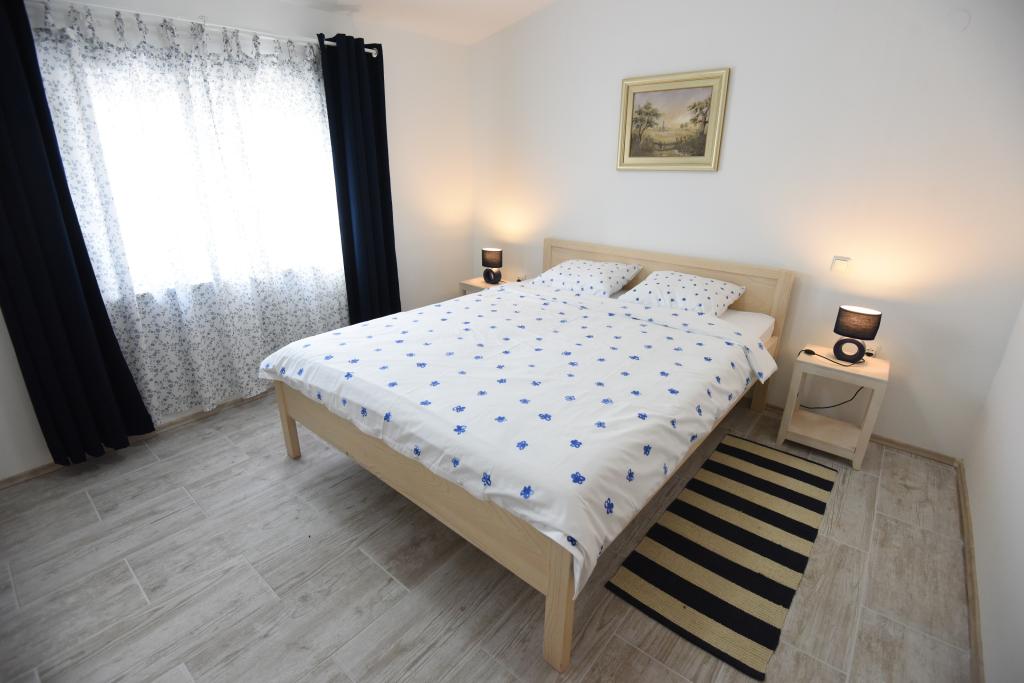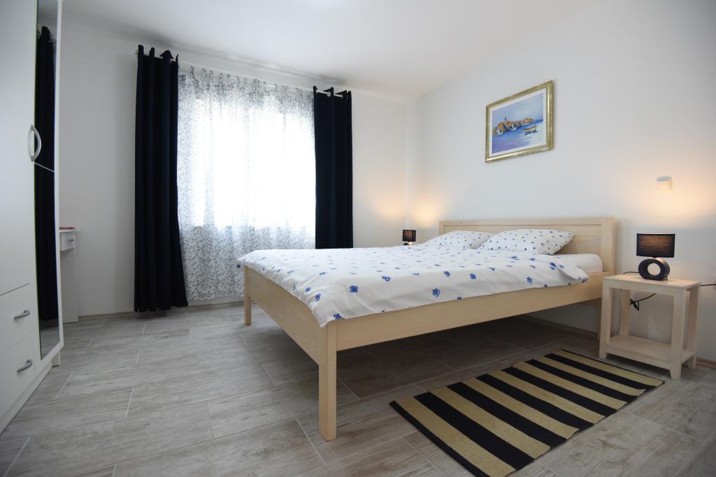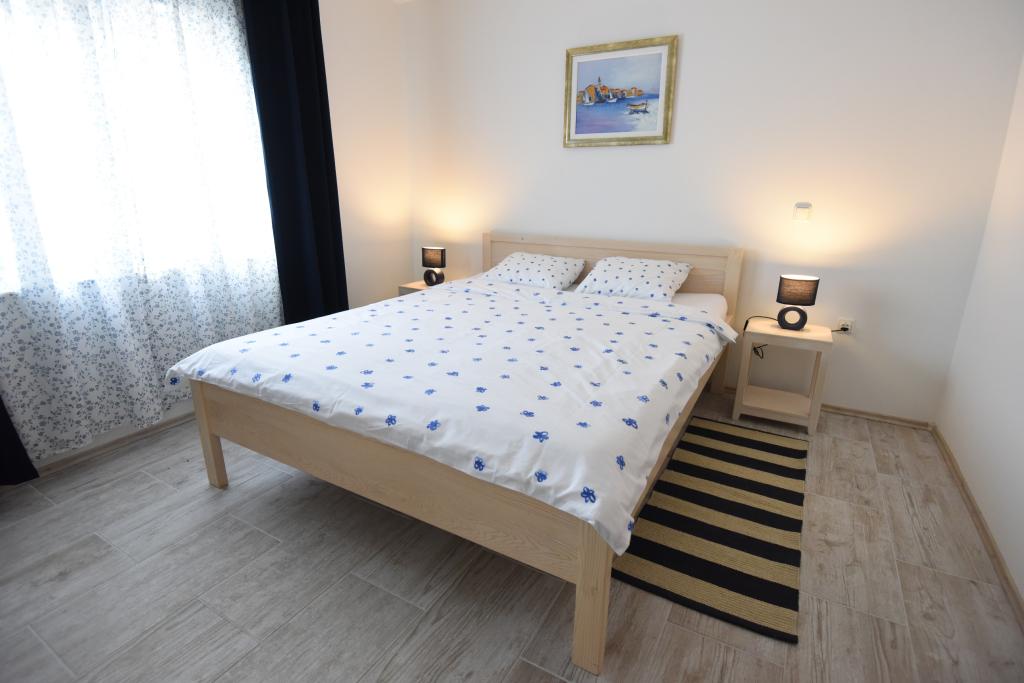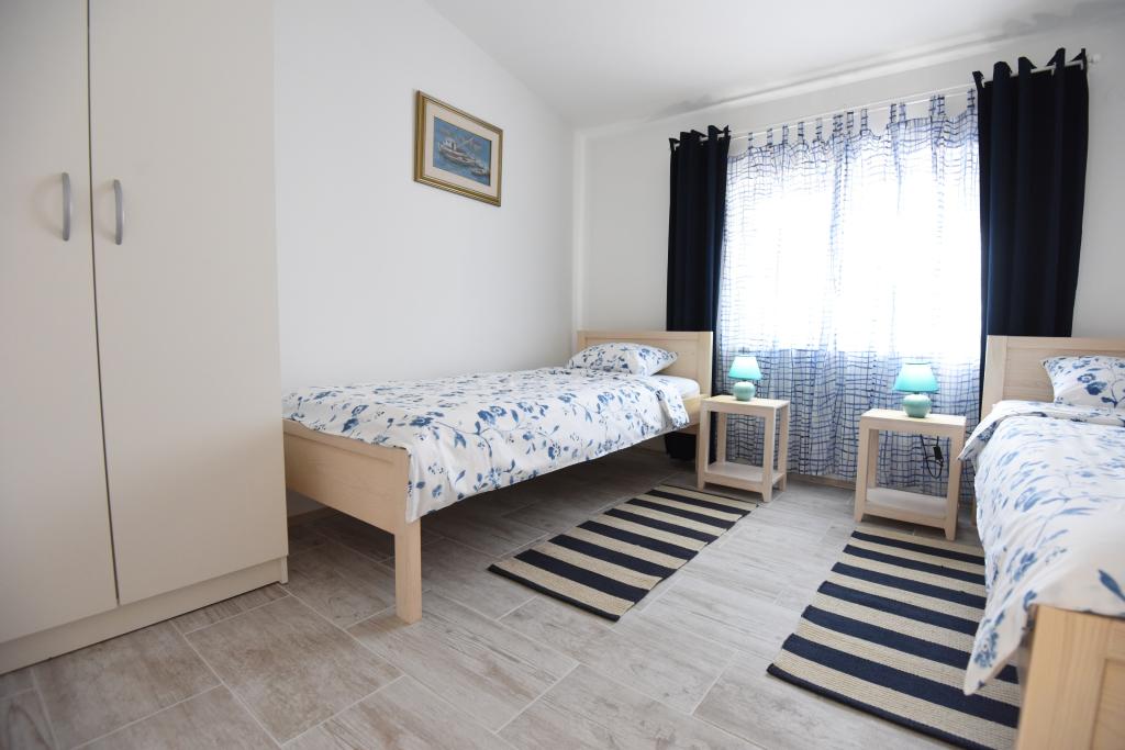 Apartamentele spațioase, mobilate modern, cu vedere la mare, chiar lângă plaja Matlovac, sunt un loc de cazare ideal pentru familiile cu copii. Clădirea cu alee proprie este formată din două unități, două apartamente de 75 m2 fiecare (parter și etaj) cu terase acoperite. Apartamentele sunt dotate cu toate facilitățile necesare pentru o vacanță plăcută, fiind disponibile pătuțuri și scaune înalte pentru copii. Parcarea este asigurată în curte, precum și utilizarea unui grătar și a unui duș exterior. Plaja este pavată/cu pietriș, cu fund nisipos, iar protecția solară este ușor de găsit în pădurea de pini. Există două cafenele cu fast-food lângă plajă, cu facilități suplimentare: o trambulină pentru copii și un teren de volei pe plajă.