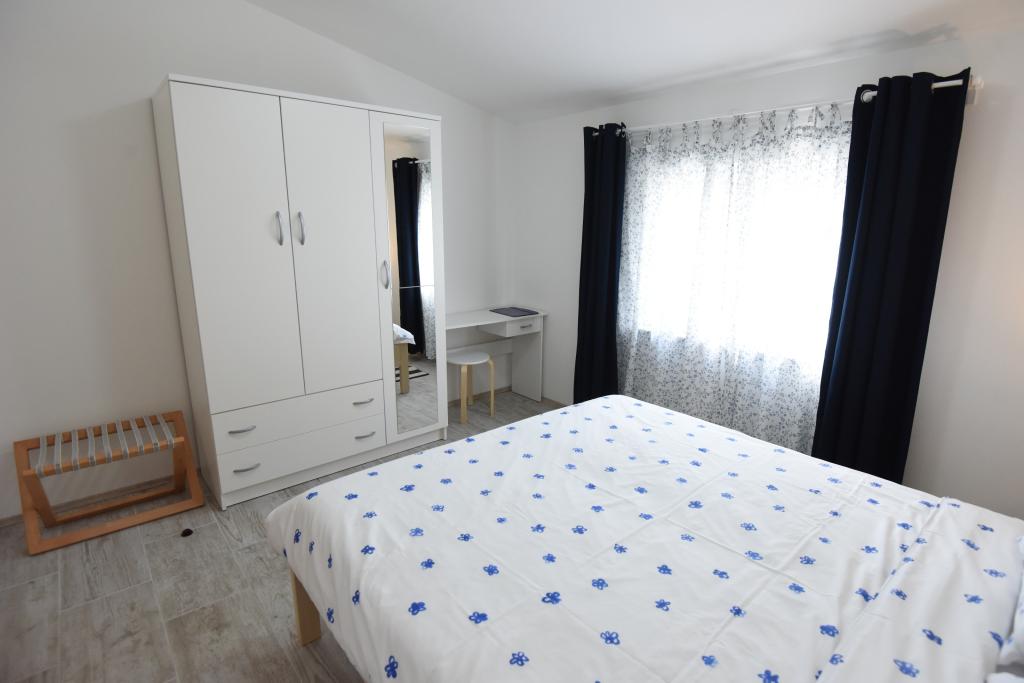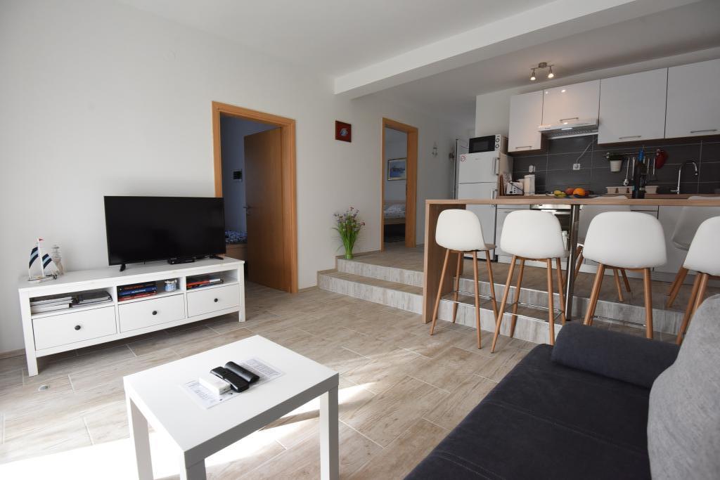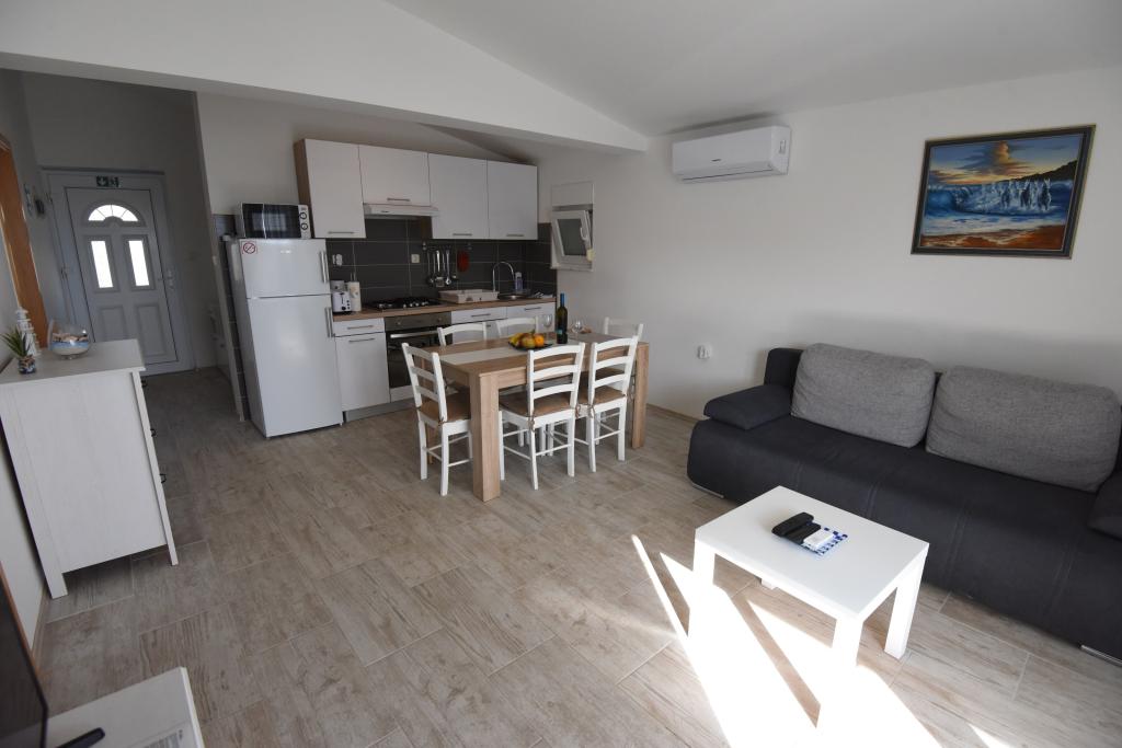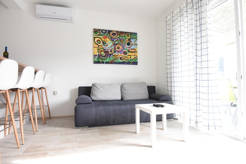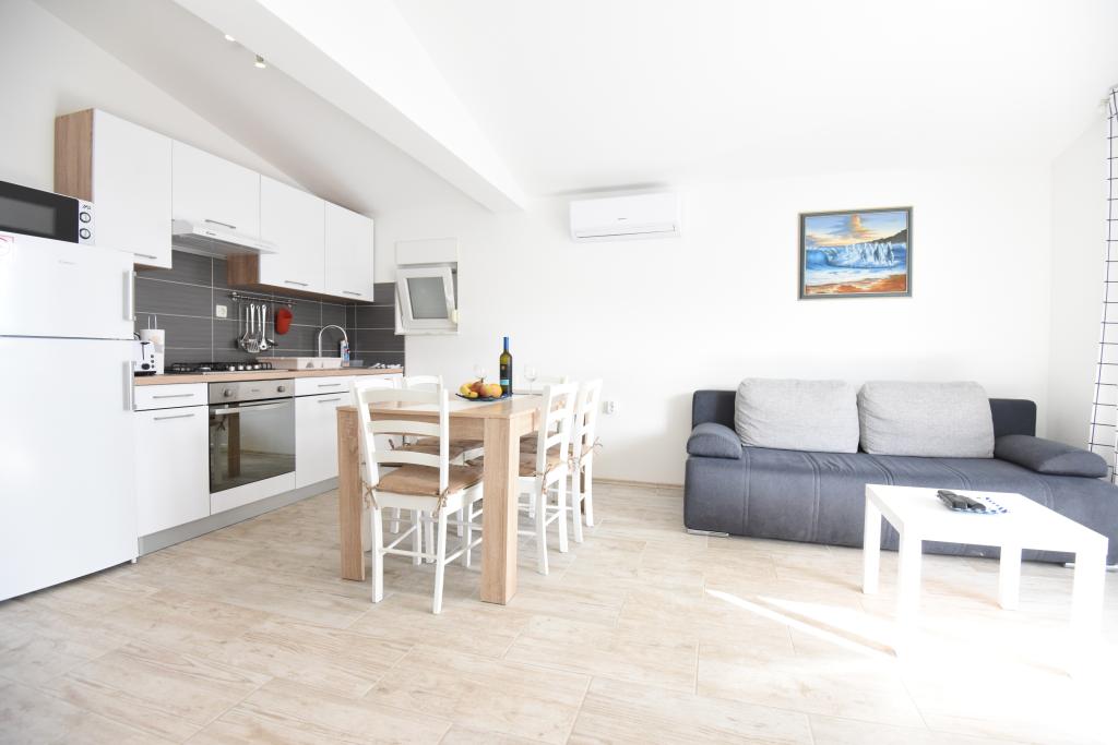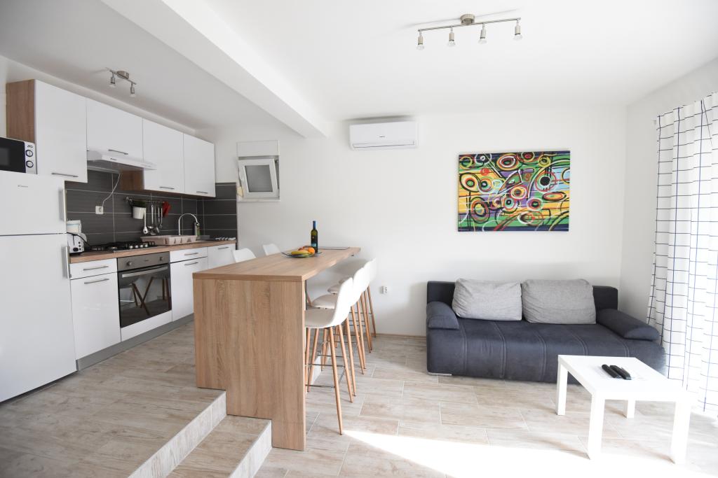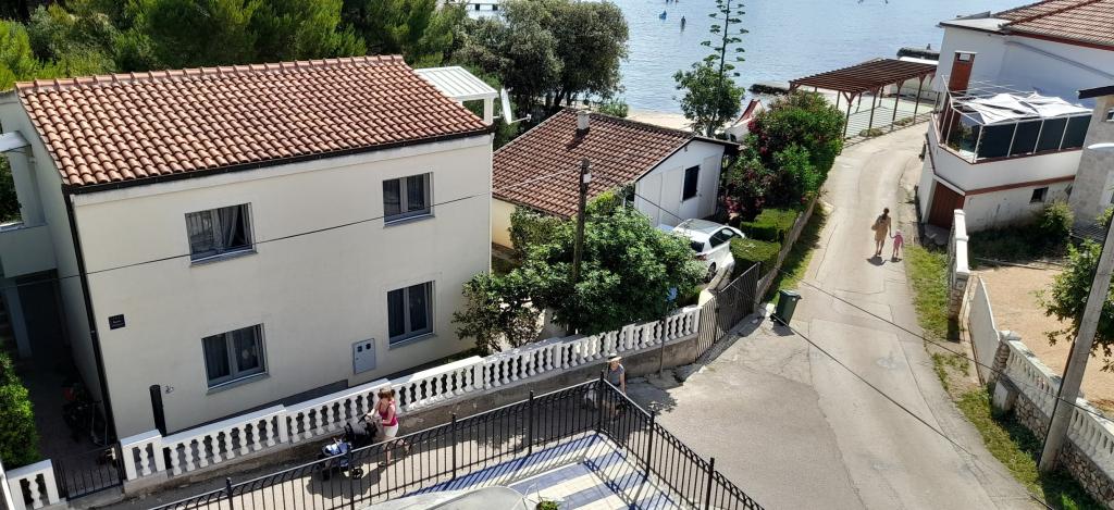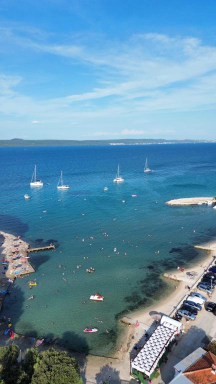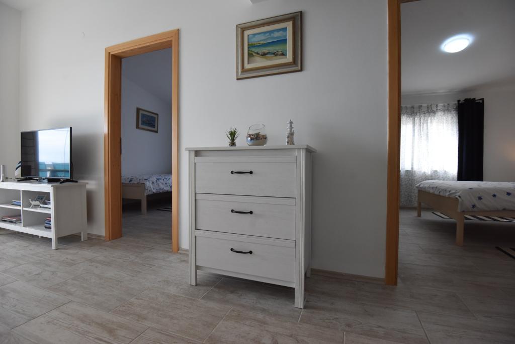 Apartamentele spațioase, mobilate modern, cu vedere la mare, chiar lângă plaja Matlovac, sunt un loc de cazare ideal pentru familiile cu copii. Clădirea cu alee proprie este formată din două unități, două apartamente de 75 m2 fiecare (parter și etaj) cu terase acoperite. Apartamentele sunt dotate cu toate facilitățile necesare pentru o vacanță plăcută, fiind disponibile pătuțuri și scaune înalte pentru copii. Parcarea este asigurată în curte, precum și utilizarea unui grătar și a unui duș exterior. Plaja este pavată/cu pietriș, cu fund nisipos, iar protecția solară este ușor de găsit în pădurea de pini. Există două cafenele cu fast-food lângă plajă, cu facilități suplimentare: o trambulină pentru copii și un teren de volei pe plajă.