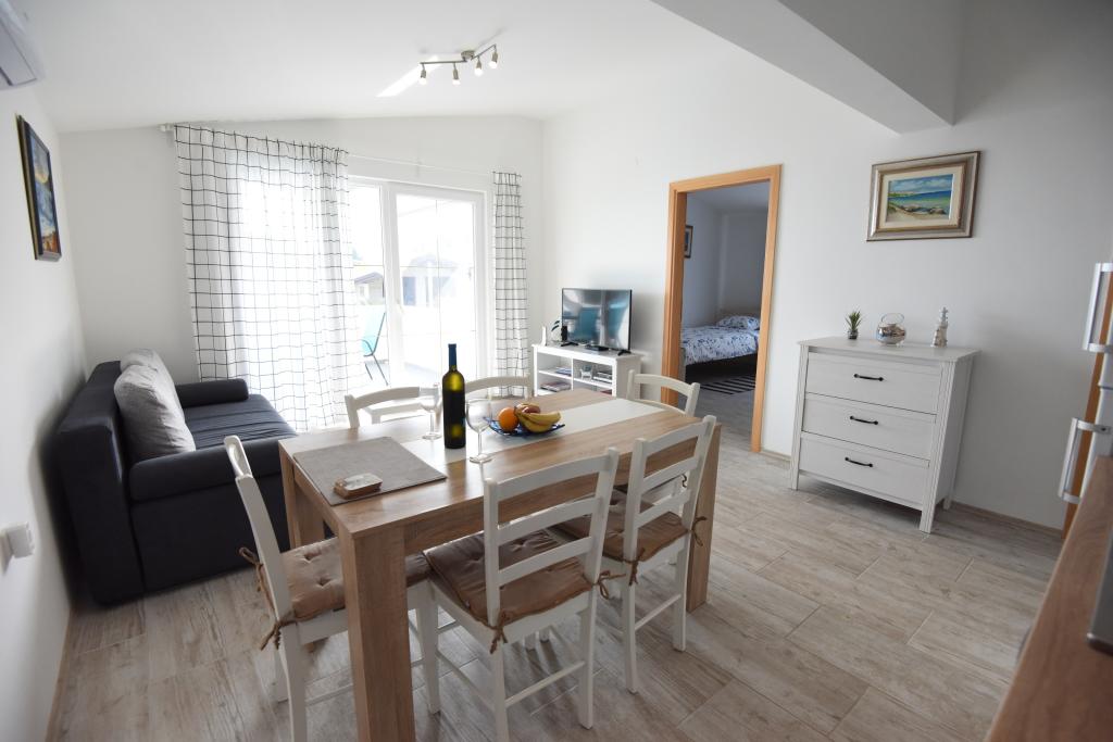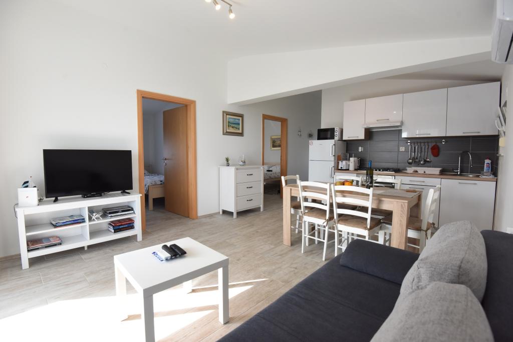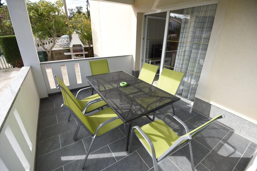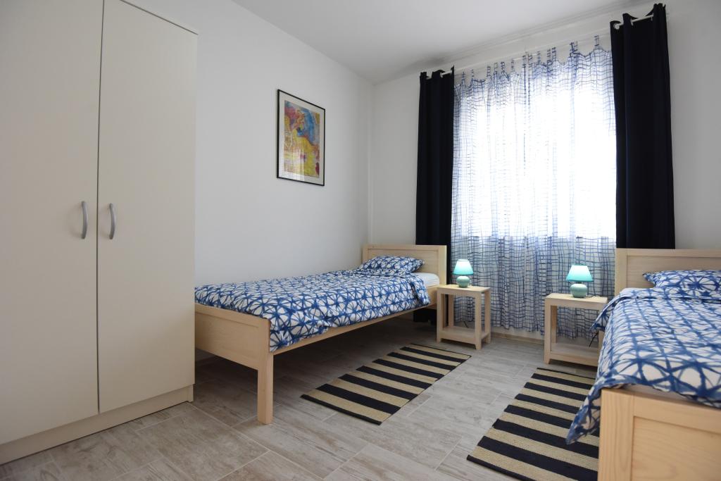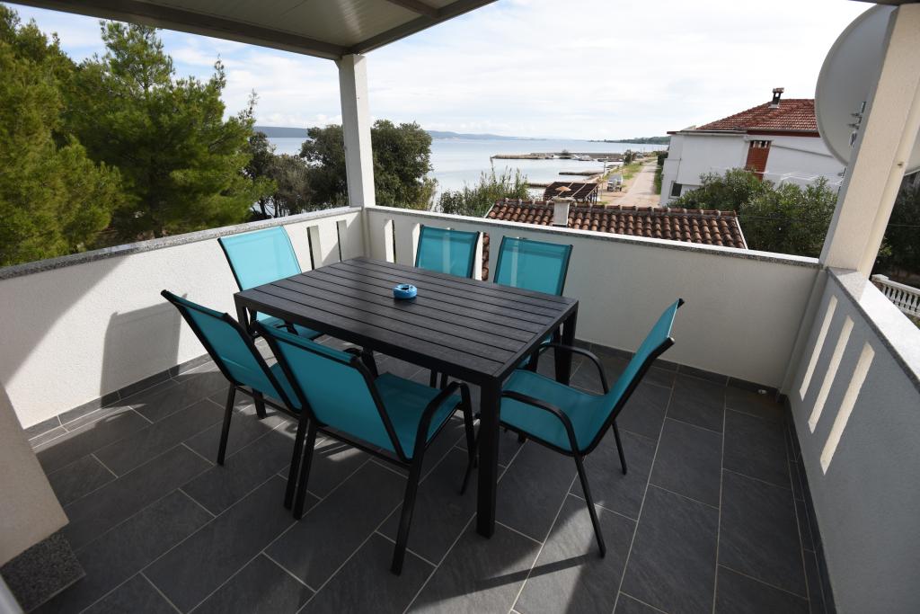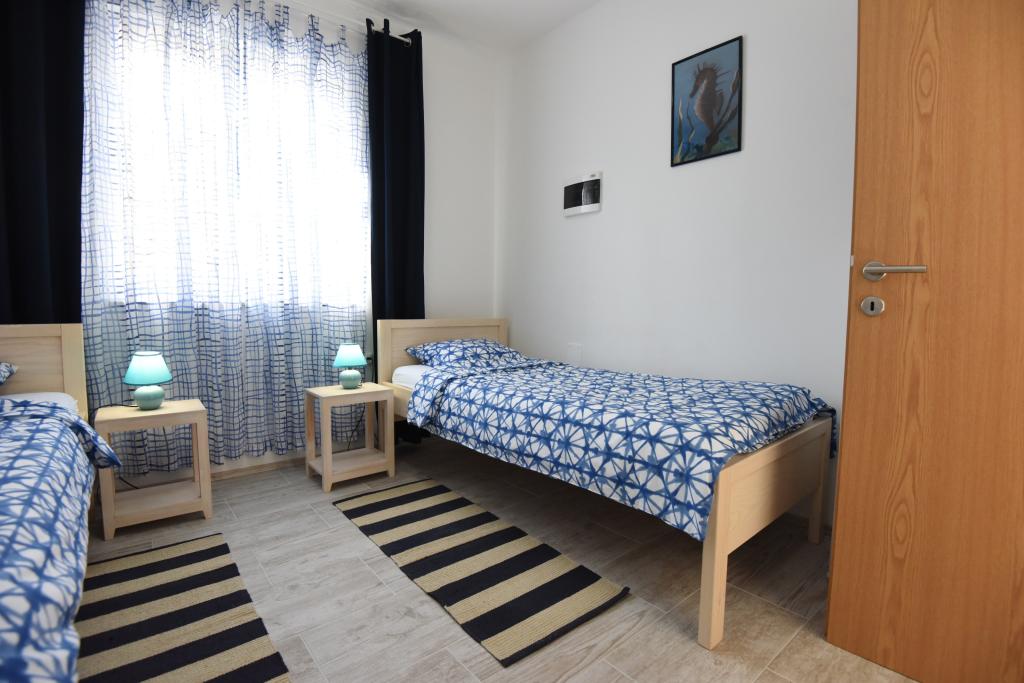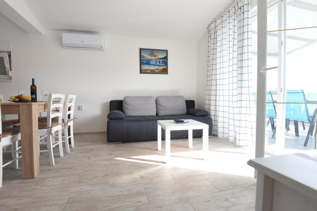 Apartamentele spațioase, mobilate modern, cu vedere la mare, chiar lângă plaja Matlovac, sunt un loc de cazare ideal pentru familiile cu copii. Clădirea cu alee proprie este formată din două unități, două apartamente de 75 m2 fiecare (parter și etaj) cu terase acoperite. Apartamentele sunt dotate cu toate facilitățile necesare pentru o vacanță plăcută, fiind disponibile pătuțuri și scaune înalte pentru copii. Parcarea este asigurată în curte, precum și utilizarea unui grătar și a unui duș exterior. Plaja este pavată/cu pietriș, cu fund nisipos, iar protecția solară este ușor de găsit în pădurea de pini. Există două cafenele cu fast-food lângă plajă, cu facilități suplimentare: o trambulină pentru copii și un teren de volei pe plajă.