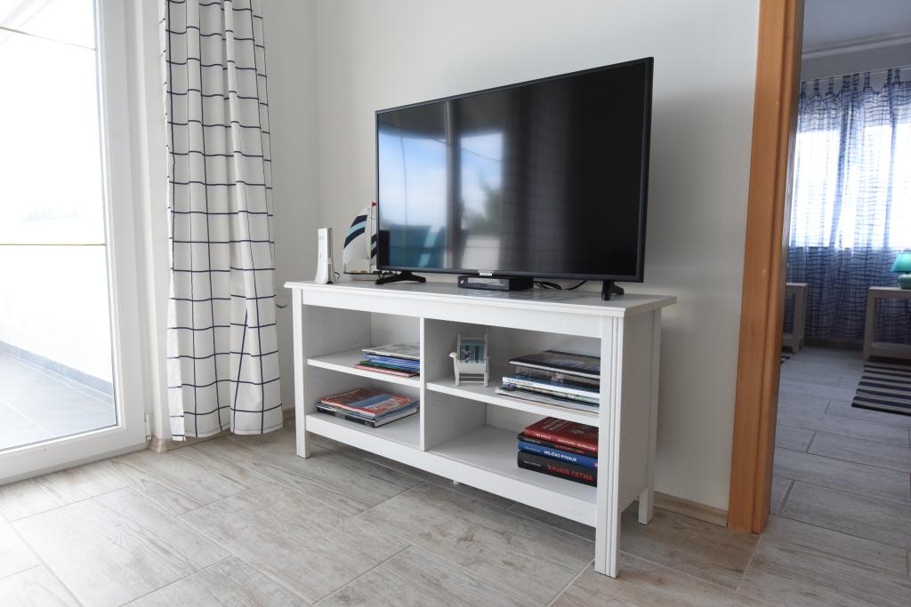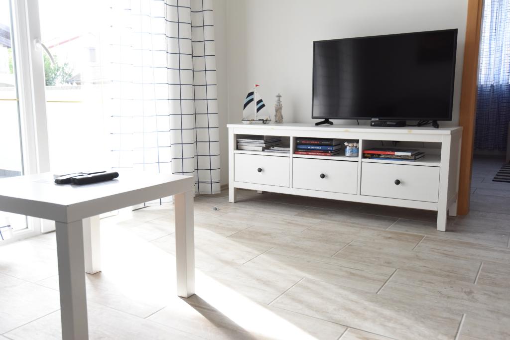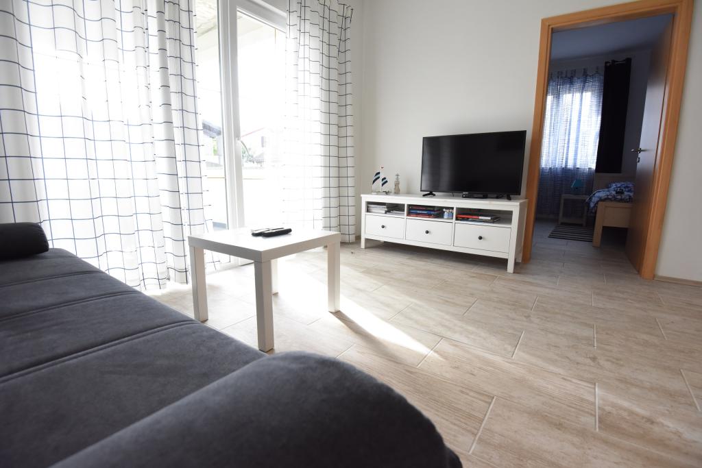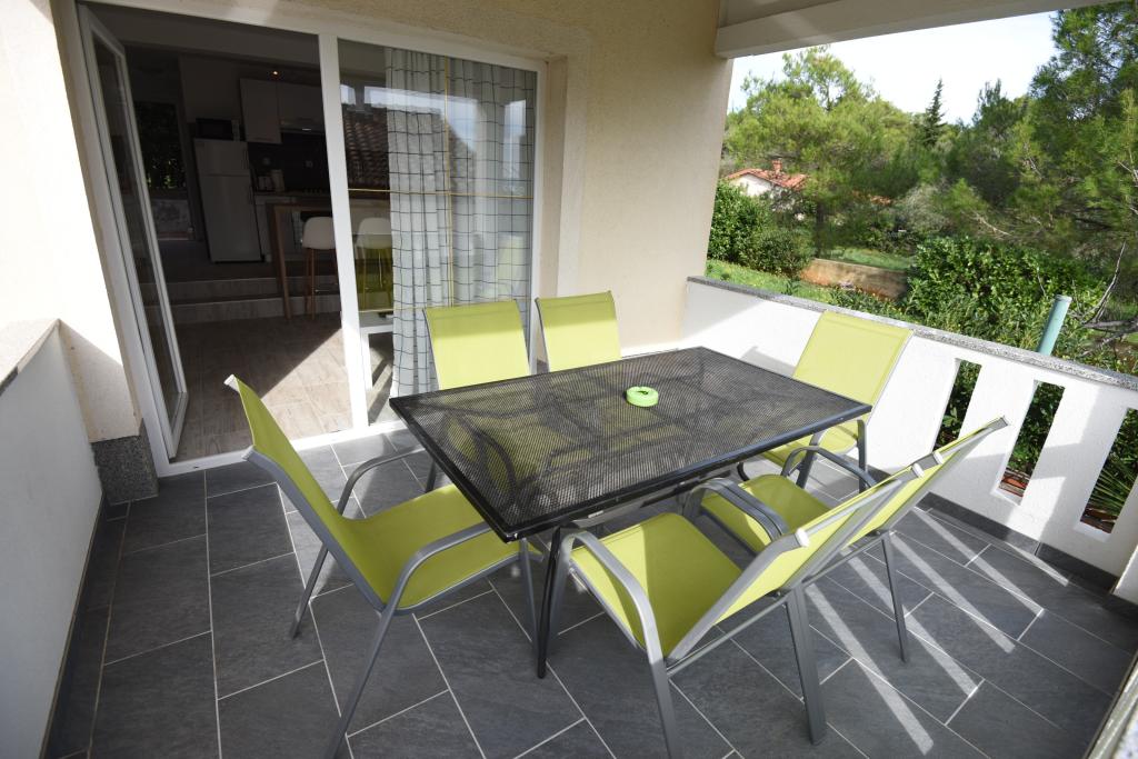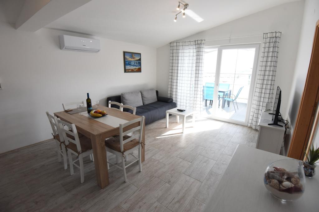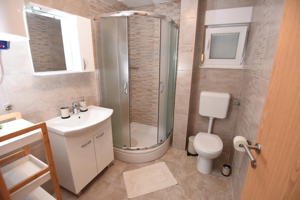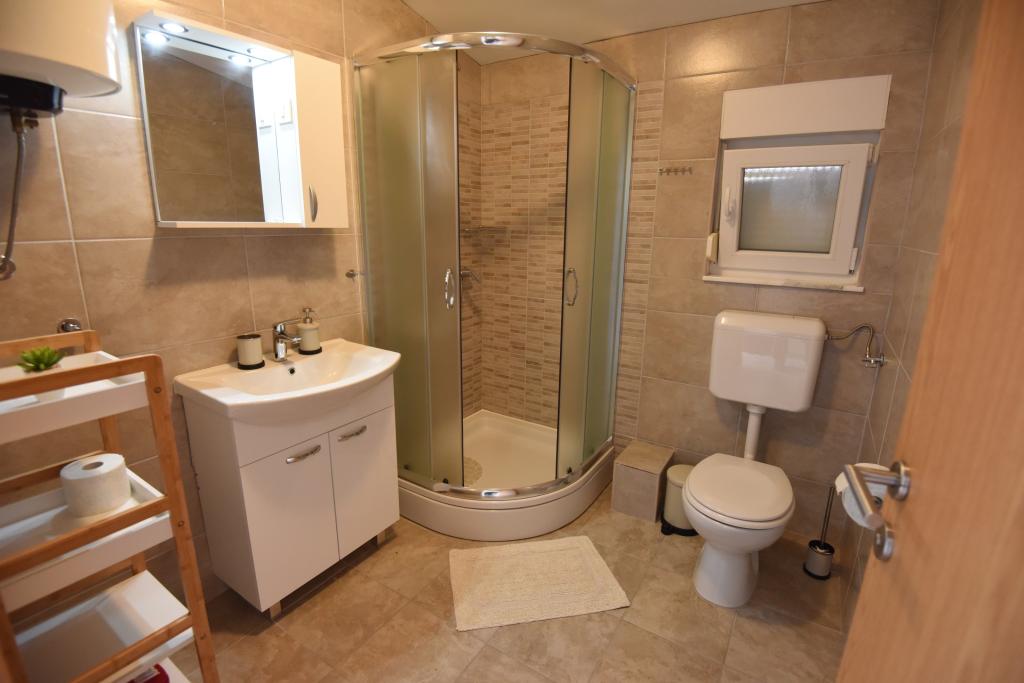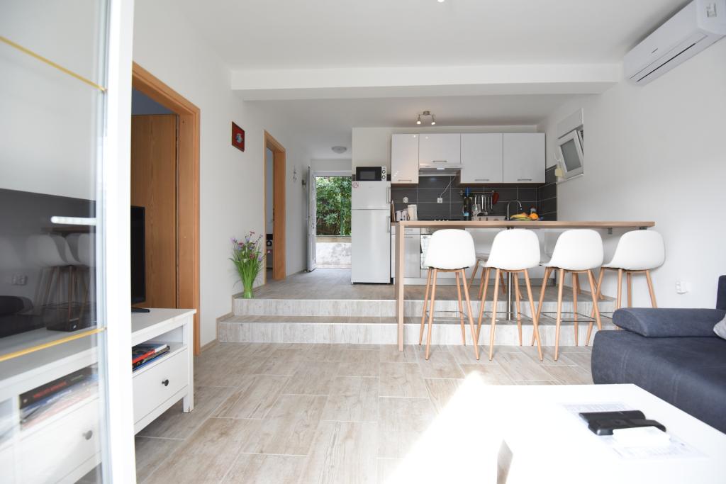 Apartamentele spațioase, mobilate modern, cu vedere la mare, chiar lângă plaja Matlovac, sunt un loc de cazare ideal pentru familiile cu copii. Clădirea cu alee proprie este formată din două unități, două apartamente de 75 m2 fiecare (parter și etaj) cu terase acoperite. Apartamentele sunt dotate cu toate facilitățile necesare pentru o vacanță plăcută, fiind disponibile pătuțuri și scaune înalte pentru copii. Parcarea este asigurată în curte, precum și utilizarea unui grătar și a unui duș exterior. Plaja este pavată/cu pietriș, cu fund nisipos, iar protecția solară este ușor de găsit în pădurea de pini. Există două cafenele cu fast-food lângă plajă, cu facilități suplimentare: o trambulină pentru copii și un teren de volei pe plajă.