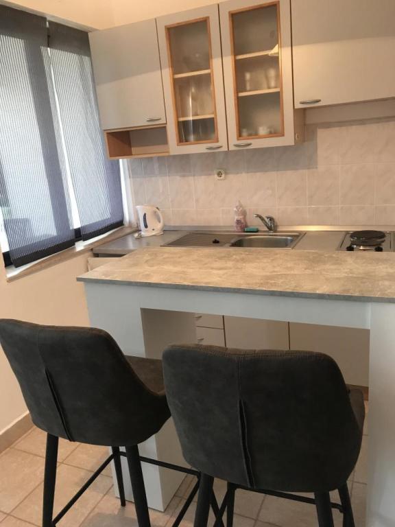 Apartamentul de studio este situat la primul etaj al casei, care este situat primul rând la mare. În fața casei se află un țărm în care cumpărăm numai noi înșine și oaspeții noștri. Există o plimbare de 10 minute pe mare până în centrul orașului. Apartamentul are o bucătărie, hol, baie și balcon.