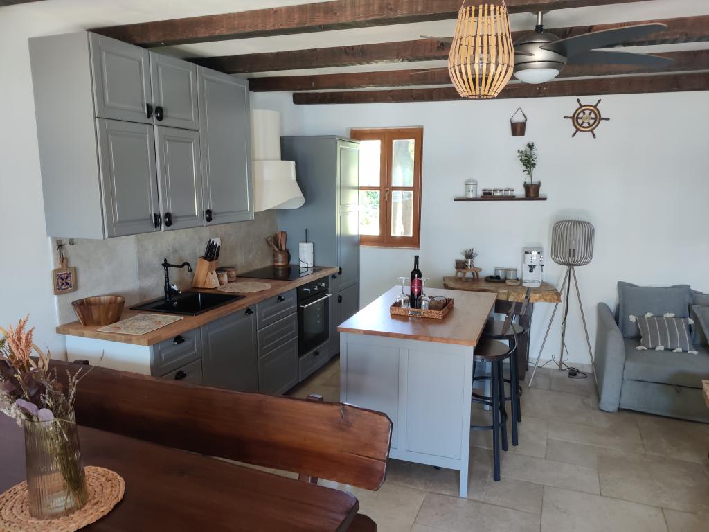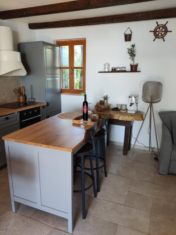 Parterul casei este format dintr-un spațiu în care se află o bucătărie modernă nouă, cu plită cu inducție, cuptor, mașină de spălat vase și frigider. Electrocasnicele din bucătărie includ un fierbător și un aparat de cafea. Livingul este format dintr-o canapea extensibilă care devine un pat suplimentar, o măsuță de cafea mică, un raft vechi din lemn masiv și un televizor. Televizorul este dotat cu canale prin satelit, iar WiFi privat este disponibil și el. Chiar lângă fereastră se află o masă solidă și bănci unde puteți mânca și vă puteți bucura de priveliștea frumoasă a orașului Biograd na Moru. La primul etaj al casei (la mansardă) se află două dormitoare și o toaletă. Unul are un pat dublu, iar celălalt are două paturi de o persoană. Aerul condiționat este situat la primul etaj pentru a