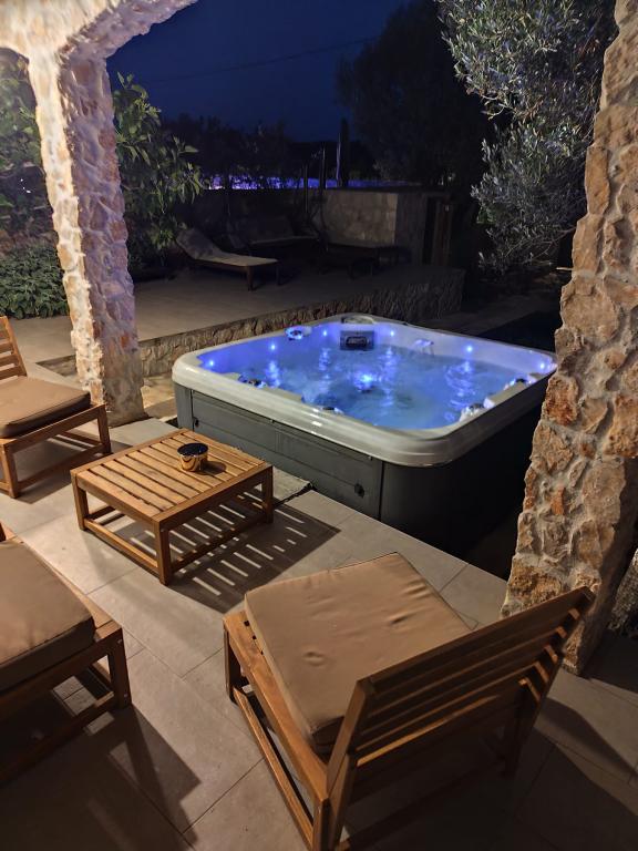 Loc frumos, natural și liniștit. Casă cu jacuzzi de închiriat pe Drvenik Mali, la aproximativ 150 de metri de mare. Casa este formată din două dormitoare, un living cu bucătărie și sufragerie și o baie. Cea mai frumoasă parte a casei este terasa cu șemineu deschis - grătar din piatră. Drvenik Mali este înconjurată de apele limpezi ale Mării Adriatice, o insulă din apropierea orașului Trogir și a orașului Split. Este conectată printr-un mic feribot care navighează de patru ori pe zi în timpul sezonului. Drvenik Mali este o insulă foarte liniștită, atât de multă pace, frumusețe naturală unică și mare excepțional de limpede. Aceasta este destinația perfectă de vacanță „departe de aglomerația orașului” și este o adevărată provocare pentru toți Robinsonii moderni. Dacă sunteți în căutarea unei vegetații mediteraneene luxuriante, a unei atmosfere originale și a unei atmosfere insulare autentice, Drvenik Mali este alegerea potrivită pentru dumneavoastră.