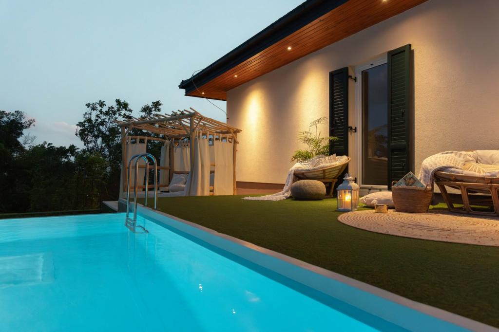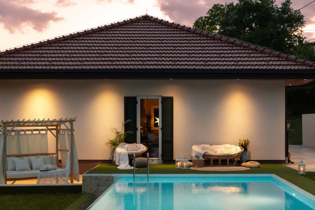 Vederea Villa Plešivica este o combinație de stil tradițional, local și modern, industrial, care este înconjurat de natură neatinsă. O atenție deosebită se acordă detaliilor care conferă vilei eleganță, aerisire și căldură. Deși este o clădire nouă, a fost complet renovată în 2022. Este compus dintr-un hol unic de intrare, un living spațios, două dormitoare, o bucătărie separată, două băi magnifice și o terasă târzie. Specialitatea acestei vile sunt panourile de sticlă care oferă o vedere deschisă asupra cerului și a versanților de poveste a podgoriilor și livezilor. Terenul vilei în sine este format dintr-o piscină cu debordare, patru terase diferite și un foișor fermecător. Toate cele de mai sus sunt încadrate de peste 3.000 m2 de suprafețe înierbate mărginite de pomi fructiferi autohtoni și vegetație bogată. Vila oferă și o oază de spa și wellness. Decorul vilei în sine este eclectic și reprezintă o combinație de mobilier de designer contemporan combinat cu piese art deco restaurate și art nouveau care fac parte din moștenirea familiei.