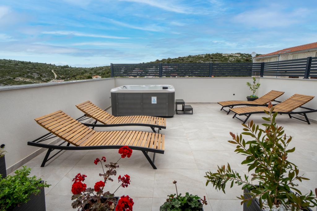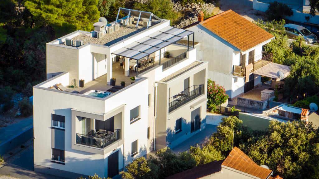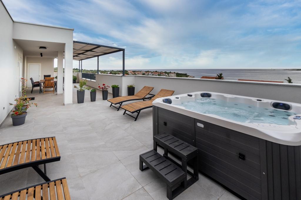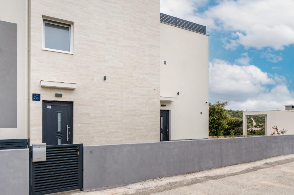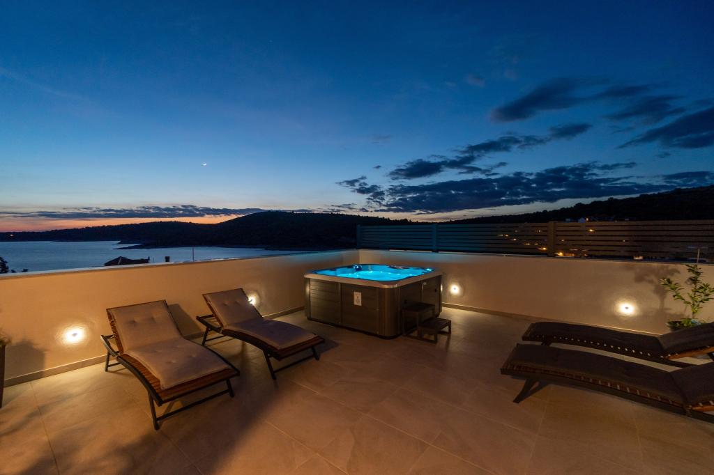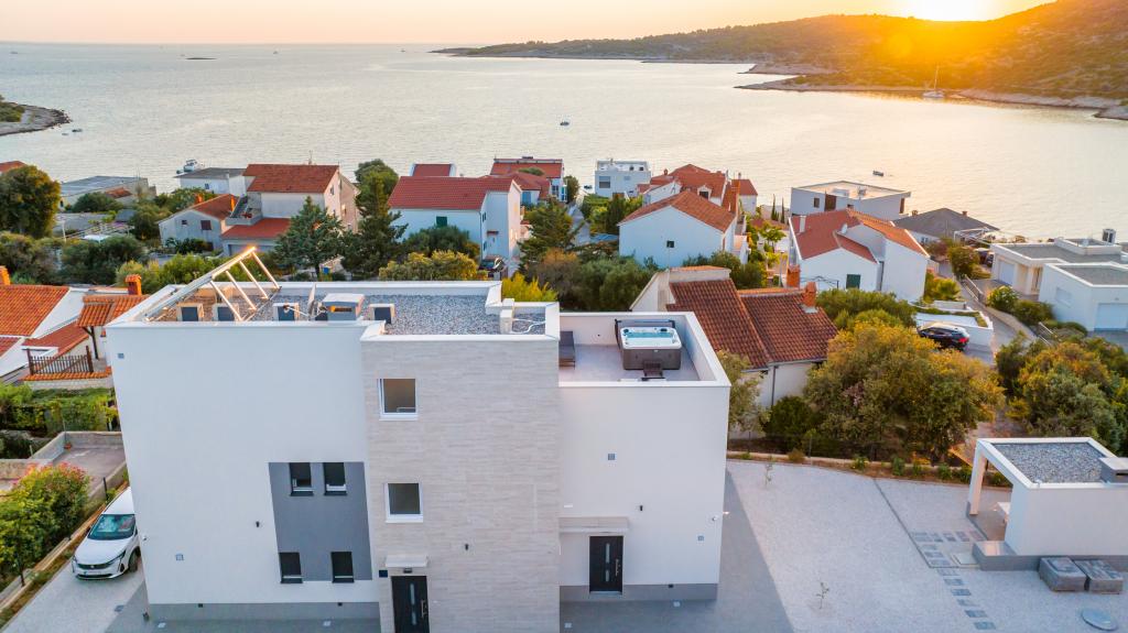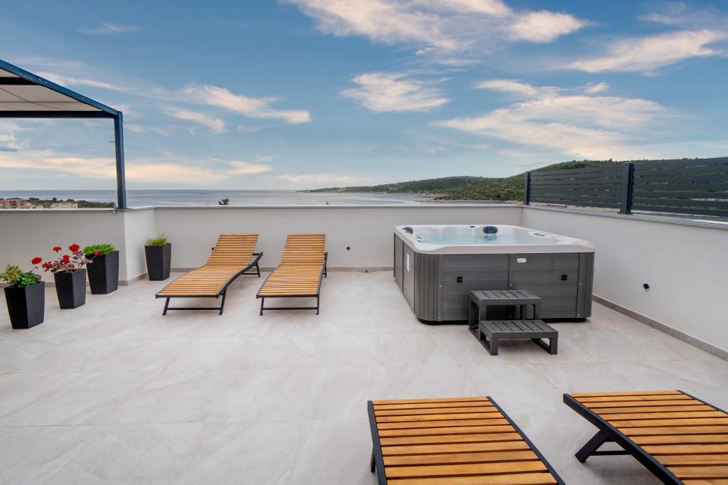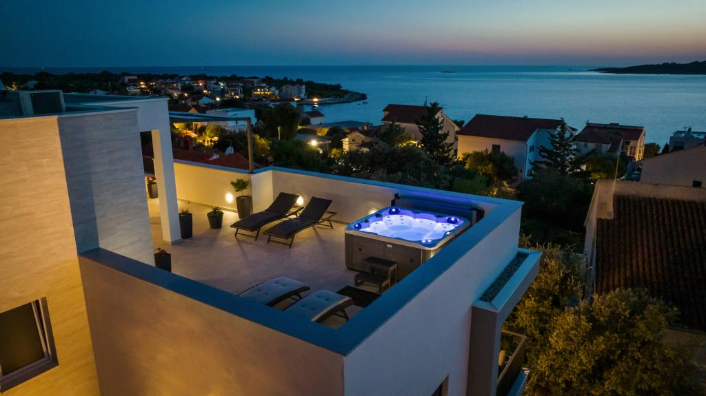 Noua facilitate. Bucurați-vă cu familia în această cazare modernă, cu apusuri frumoase și vedere la mare. Cartier linistit. Două apartamente care se închiriază în întregime. La parter se afla o garsoniera formata dintr-o bucatarie, o baie si o camera cu pat dublu, exista si un pat suplimentar in living. La primul etaj se afla un apartament mare format dintr-o bucatarie, un living, un balcon cu mobilier de gradina ideal pentru cafeaua de dimineata, doua camere cu pat matrimonial si o camera cu doua paturi separate care pot fi conectate la nevoie. Acest apartament are două băi, dintre care una face parte din cameră și o toaletă. La etajul doi al blocului se afla o terasa mare cu vedere la intreg si o cada cu hidromasaj pentru 5 persoane, sezlonguri pentru plaja, gratar, bucatarie de vara si masa si scaune. Există, de asemenea, o zonă acoperită mai mică în exterior, cu un grătar și o masă și bănci.