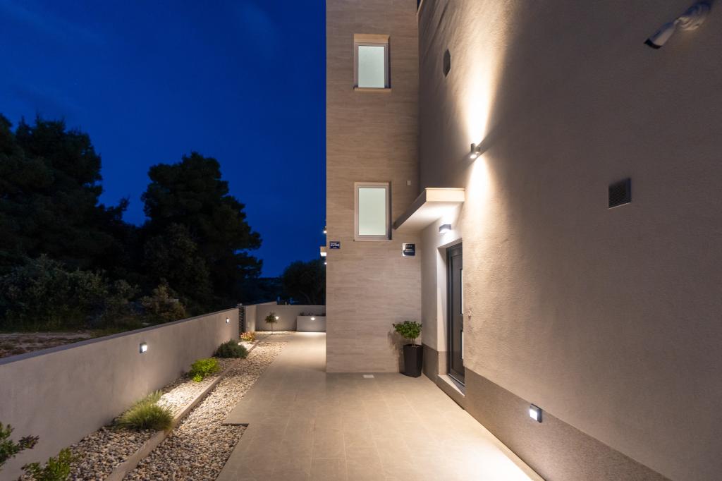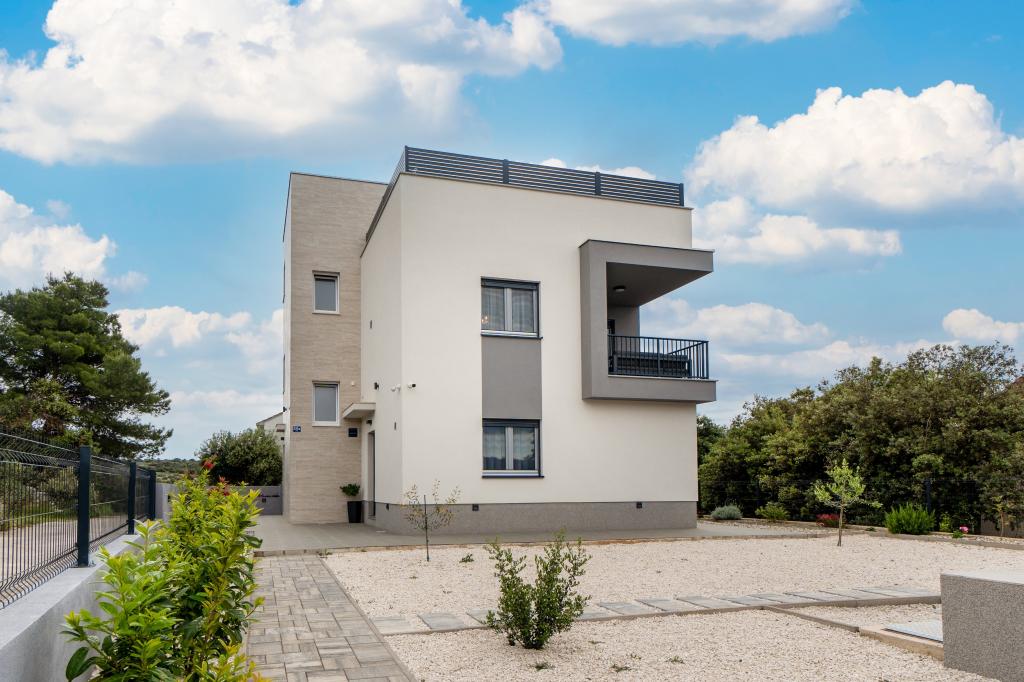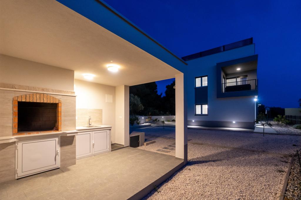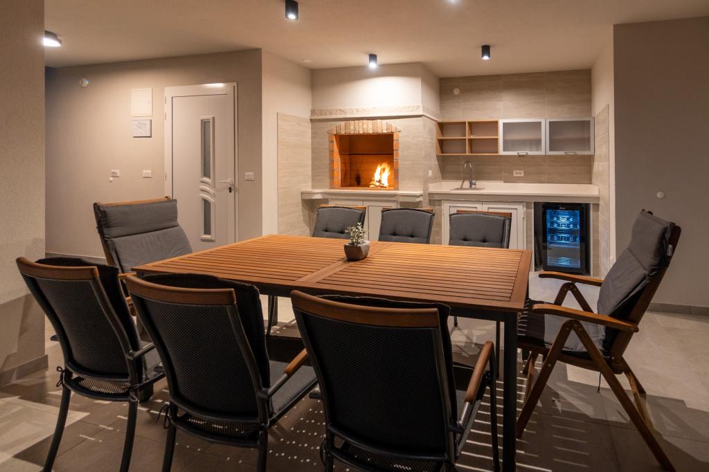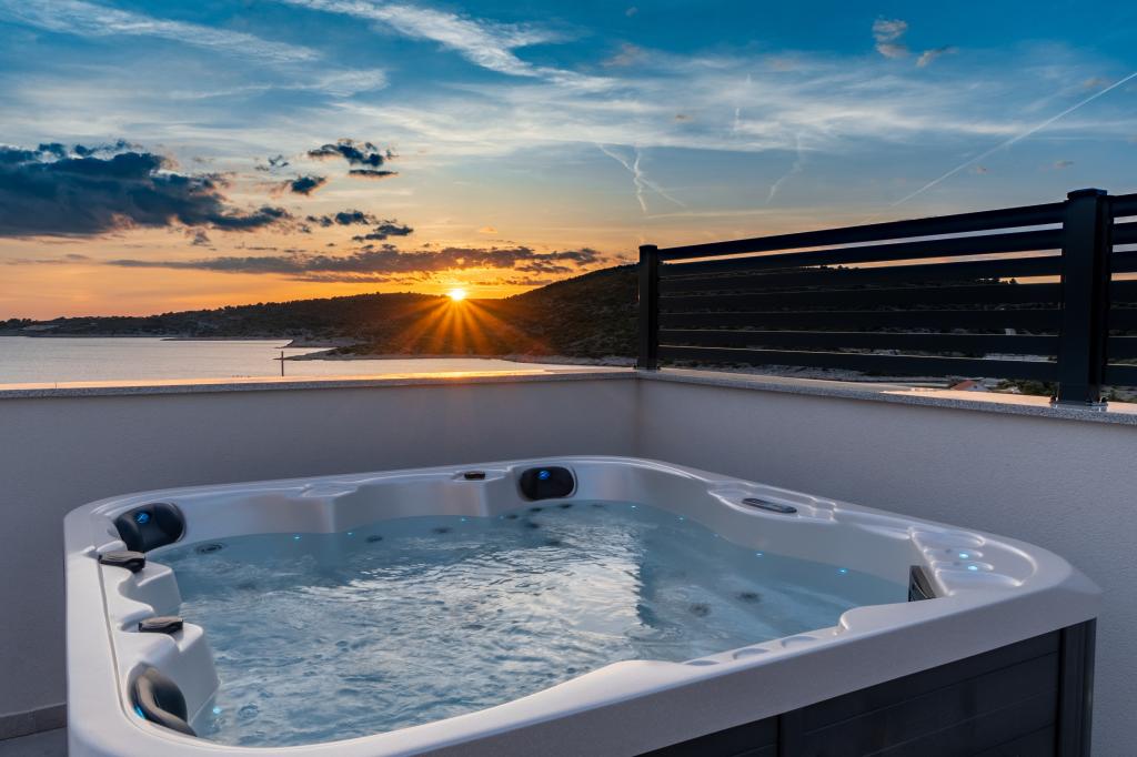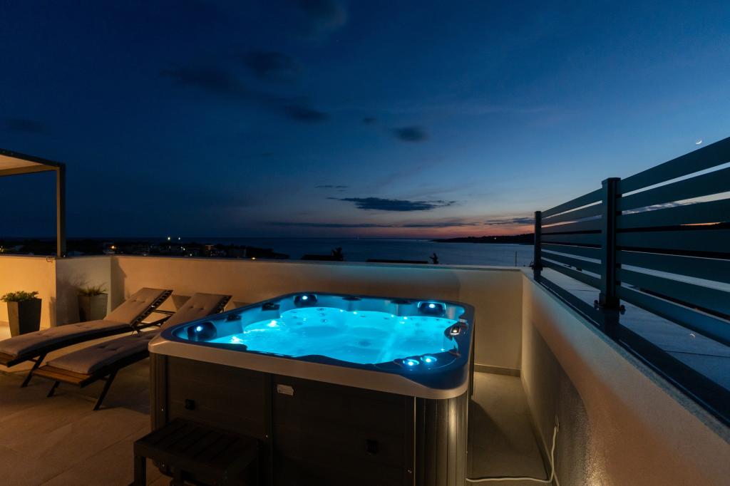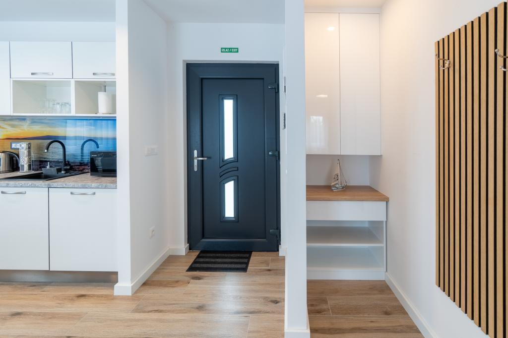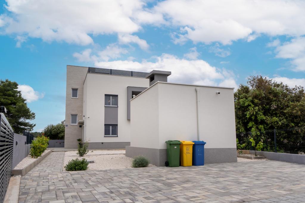 Noua facilitate. Bucurați-vă cu familia în această cazare modernă, cu apusuri frumoase și vedere la mare. Cartier linistit. Două apartamente care se închiriază în întregime. La parter se afla o garsoniera formata dintr-o bucatarie, o baie si o camera cu pat dublu, exista si un pat suplimentar in living. La primul etaj se afla un apartament mare format dintr-o bucatarie, un living, un balcon cu mobilier de gradina ideal pentru cafeaua de dimineata, doua camere cu pat matrimonial si o camera cu doua paturi separate care pot fi conectate la nevoie. Acest apartament are două băi, dintre care una face parte din cameră și o toaletă. La etajul doi al blocului se afla o terasa mare cu vedere la intreg si o cada cu hidromasaj pentru 5 persoane, sezlonguri pentru plaja, gratar, bucatarie de vara si masa si scaune. Există, de asemenea, o zonă acoperită mai mică în exterior, cu un grătar și o masă și bănci.