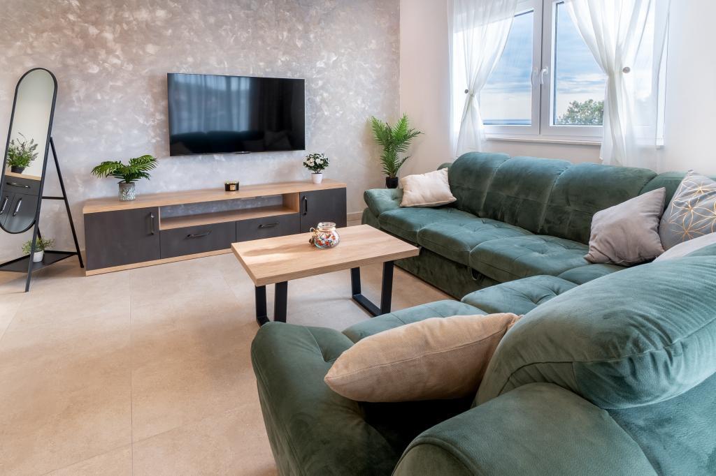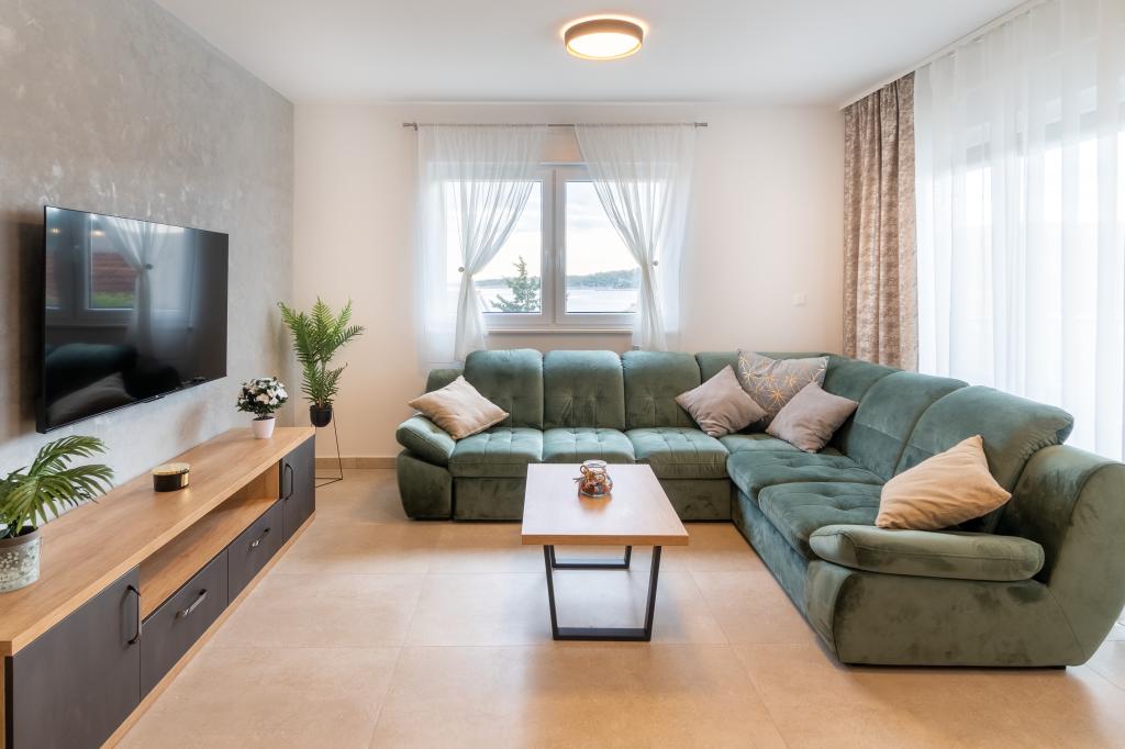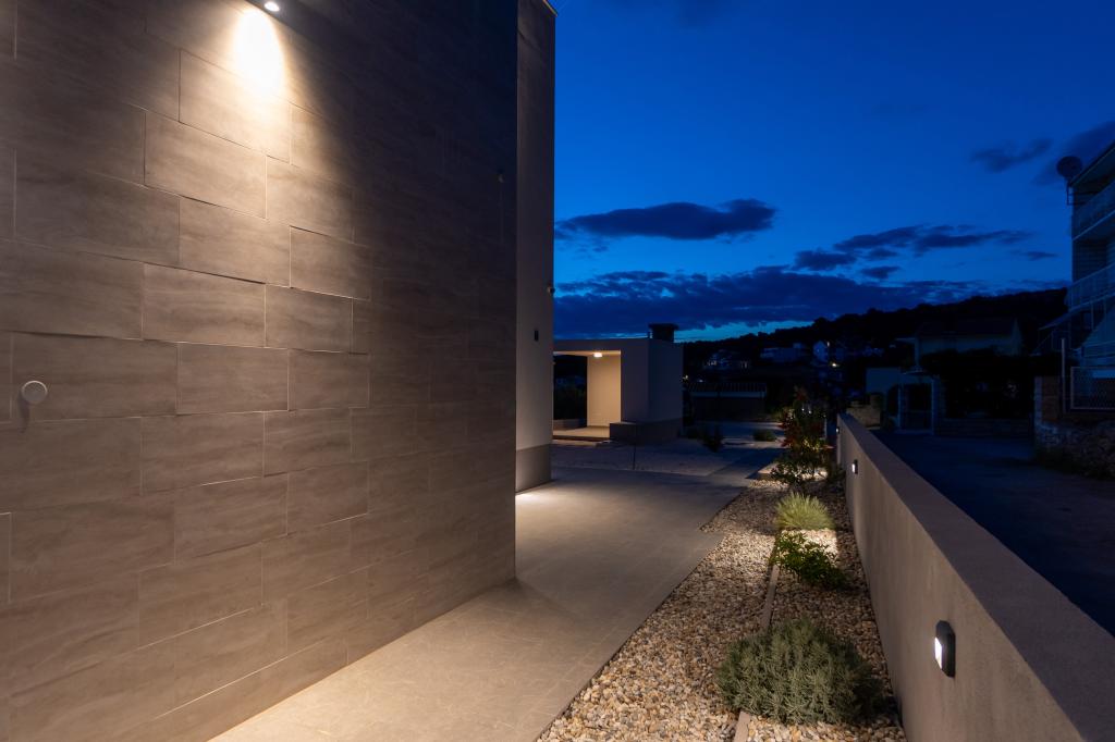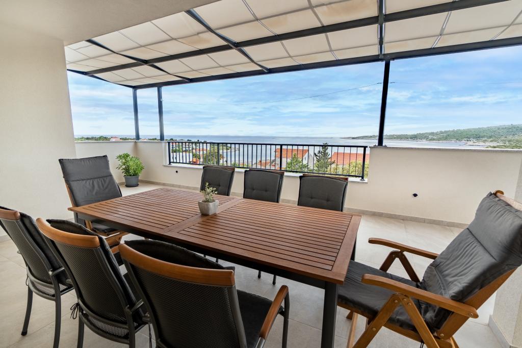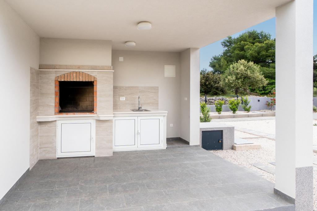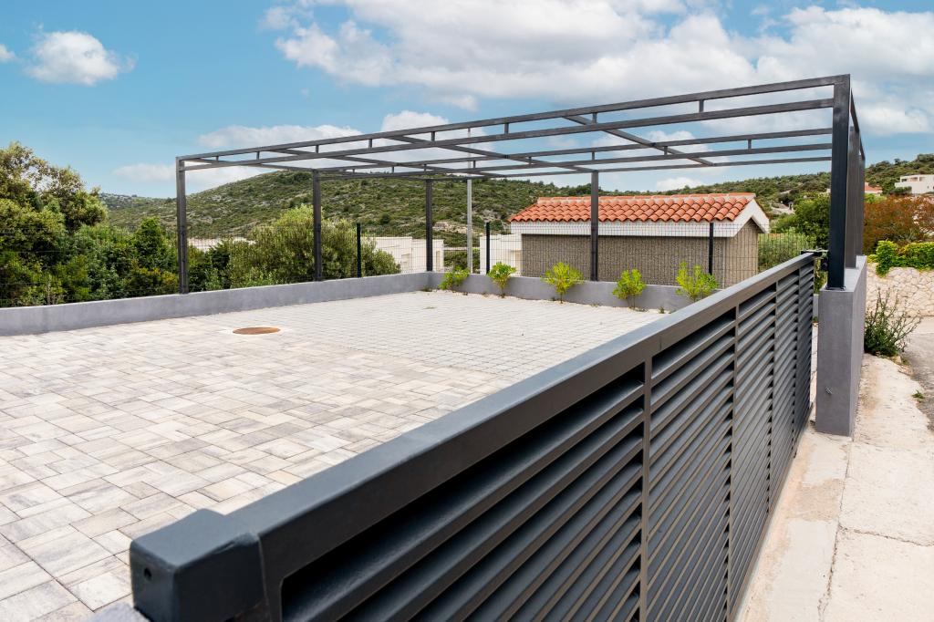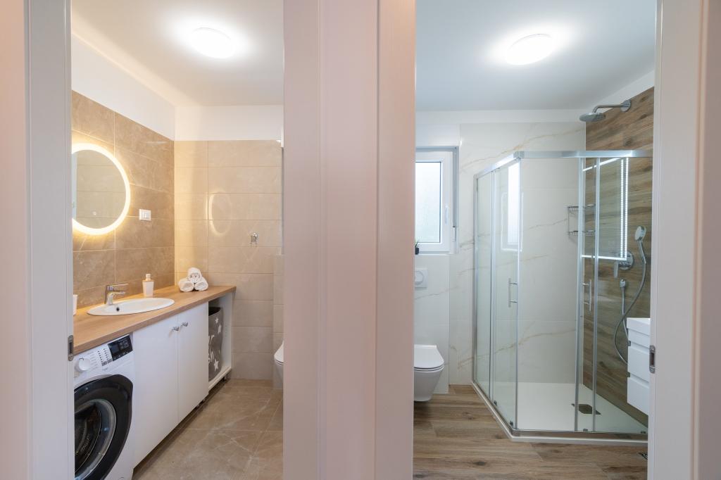 Noua facilitate. Bucurați-vă cu familia în această cazare modernă, cu apusuri frumoase și vedere la mare. Cartier linistit. Două apartamente care se închiriază în întregime. La parter se afla o garsoniera formata dintr-o bucatarie, o baie si o camera cu pat dublu, exista si un pat suplimentar in living. La primul etaj se afla un apartament mare format dintr-o bucatarie, un living, un balcon cu mobilier de gradina ideal pentru cafeaua de dimineata, doua camere cu pat matrimonial si o camera cu doua paturi separate care pot fi conectate la nevoie. Acest apartament are două băi, dintre care una face parte din cameră și o toaletă. La etajul doi al blocului se afla o terasa mare cu vedere la intreg si o cada cu hidromasaj pentru 5 persoane, sezlonguri pentru plaja, gratar, bucatarie de vara si masa si scaune. Există, de asemenea, o zonă acoperită mai mică în exterior, cu un grătar și o masă și bănci.