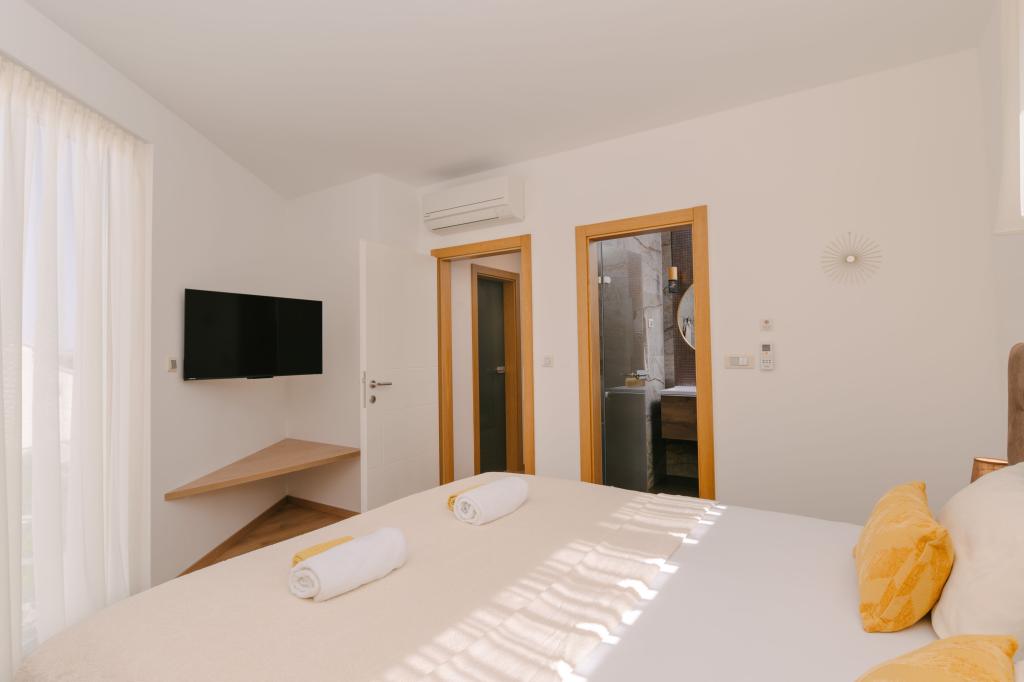 Trei dormitoare matrimoniale moderne sunt situate la etaj, în timp ce o cameră de oaspeți este situată la subsol. Toate băile sunt dotate cu accesorii Grohe și Laufen de ultimă generație, gresie ceramică de design prestigios și uși elegante din sticlă. Casa este clasificată oficial de Ministerul Turismului din Republica Croația, ceea ce permite cazare confortabilă pentru 9, chiar 10 oaspeți. Livingul și sufrageria open space, precum și fiecare dormitor, sunt dotate cu aparate de aer condiționat individuale cu mod silențios, perfecte pentru un somn liniștit. Bucătăria modernă, de la celebrul brand austriac DanKüchen, este complet utilată cu electrocasnice de ultimă generație, inclusiv un frigider cu aparat de gheață și un dozator de apă rece.