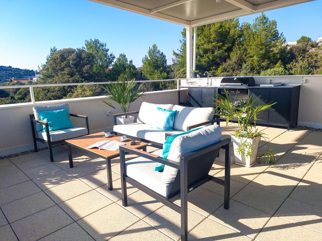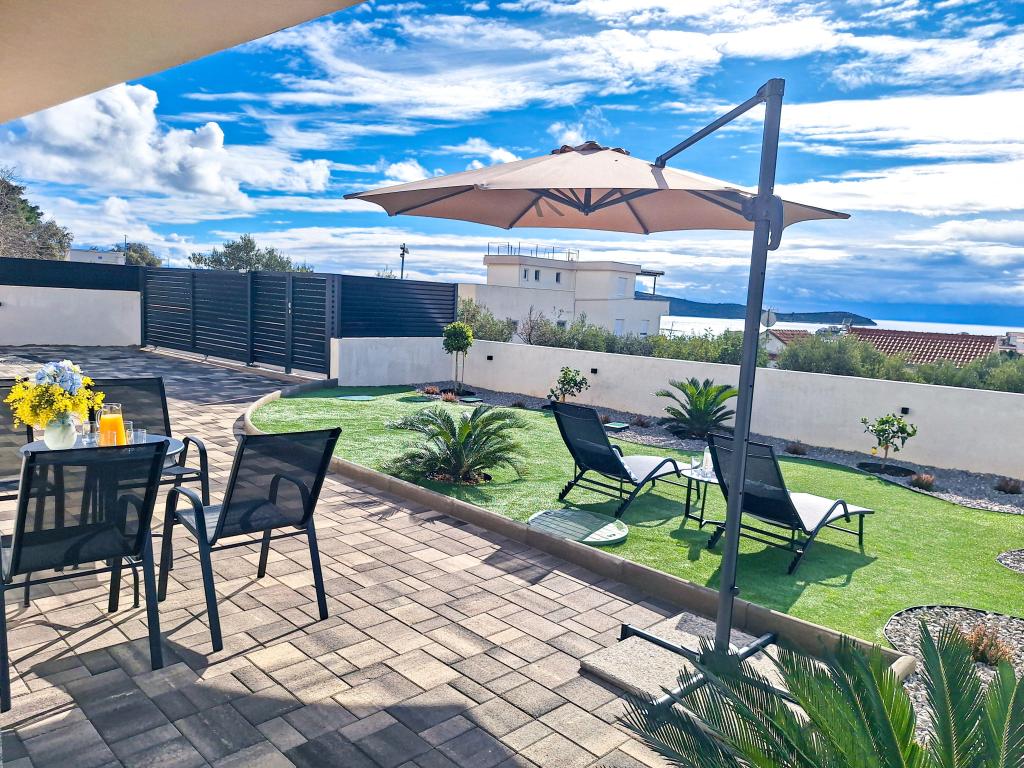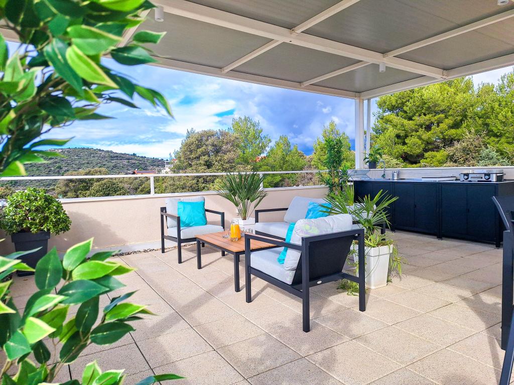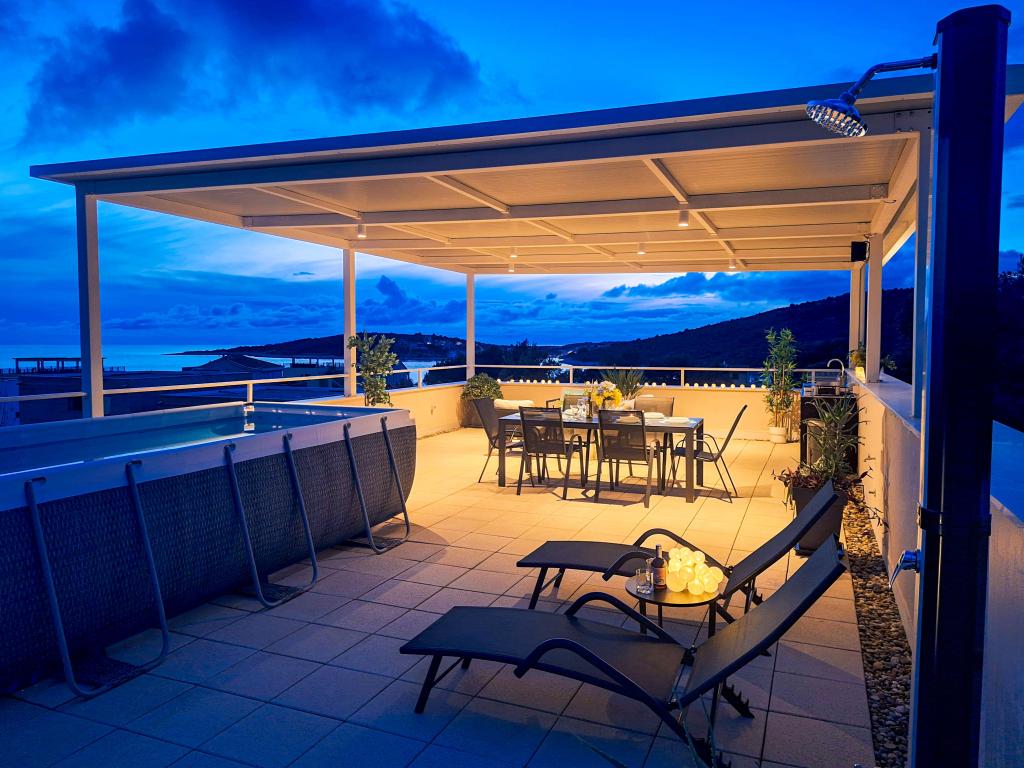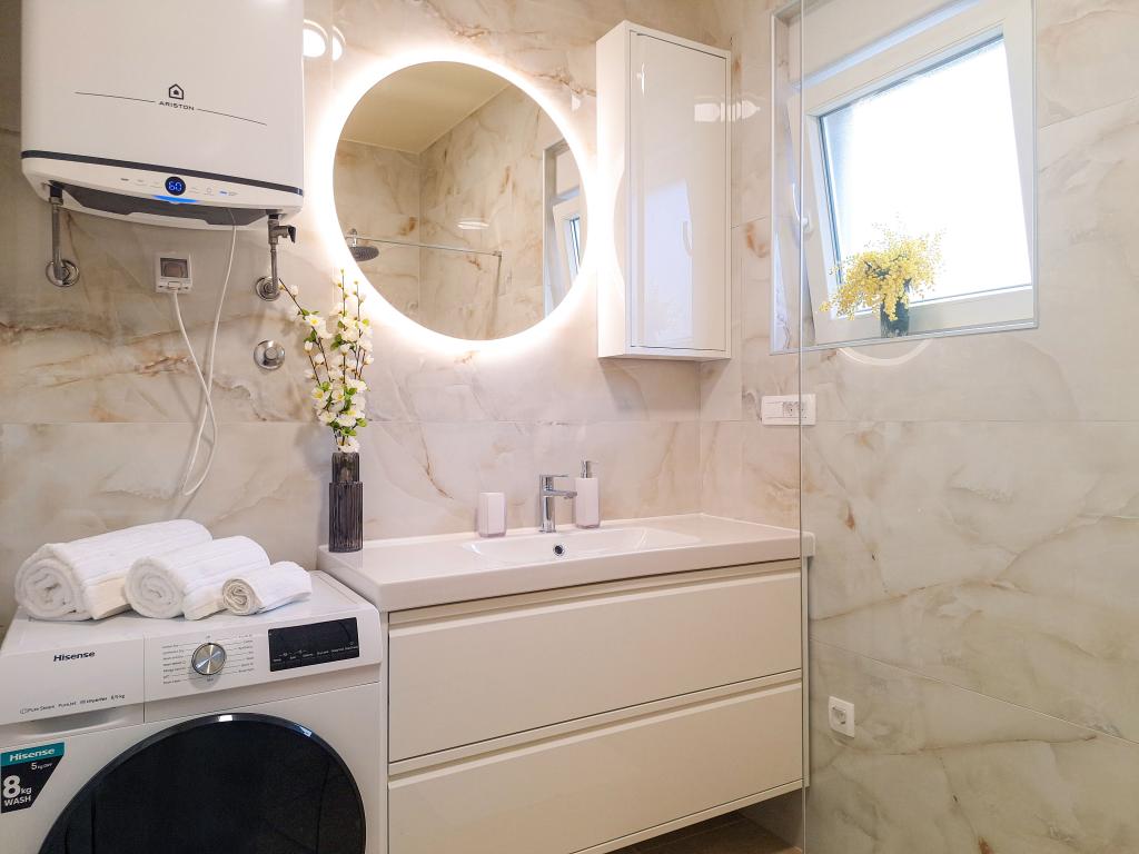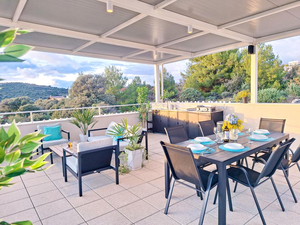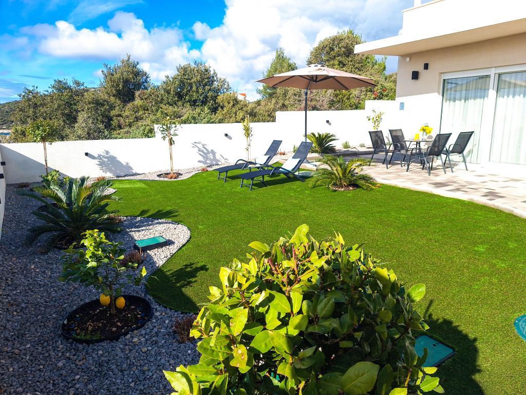 Bine ați venit la Tesa, o vilă modernă nouă, unde vă puteți bucura pe deplin alături de familie sau prieteni. Această vilă elegantă pentru până la 6 oaspeți oferă o bucătărie complet utilată, o baie modernă cu duș walk-in și mașină de spălat/uscător, precum și aer condiționat și televizor în fiecare cameră. Terasa de pe acoperiș, cu vedere la mare și insule, are o piscină încălzită, un duș exterior și șezlonguri pentru relaxare în timpul zilei cu cartea preferată sau muzică de la boxe exterioare și pentru a vă bucura de băutura preferată seara sub stele. Terasa cu bucătărie complet utilată (grătar, aragaz, frigider), masă și zonă de relaxare vă oferă oportunitatea de a petrece întreaga zi în aer liber. Gătitul cu o briză plăcută de la mare va face această experiență extrem de plăcută. Locația centrală perfectă, cu toate facilitățile esențiale și plaje frumoase la doar 200 de metri distanță, fiind înconjurată de verdeață și o grădină frumos amenajată, creată pentru relaxare, vă va oferi o vacanță de neuitat.