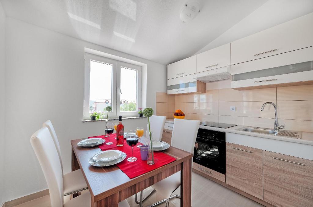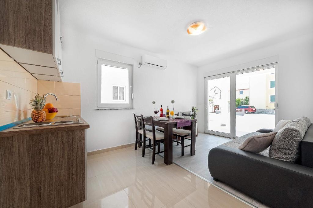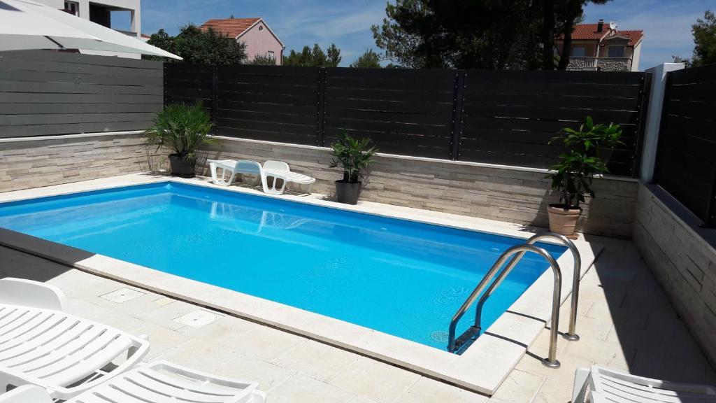Vilă complet echipată modern, formată din trei apartamente separate cu un total de cinci camere (două apartamente cu două camere și unul cu o cameră), trei băi și trei bucătării. Toate apartamentele au propria bucătărie, baie și terase acoperite cu masă și scaune. Proprietatea are o piscină în curte, șezlonguri, o masă în aer liber cu scaune și un grătar. Facilitatea este ideală pentru trei familii sau pentru un grup mai mare de prieteni. Aproape de mare și vedere la mare, piscină, grătar în aer liber, mediul liniștit al vilelor frumos decorate oferă o vacanță relaxantă ideală. Facilitatea este situată în apropierea orașului Sibenik, a parcurilor naționale Krka și Kornati.