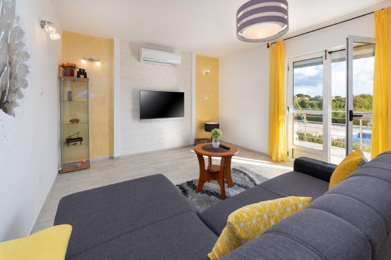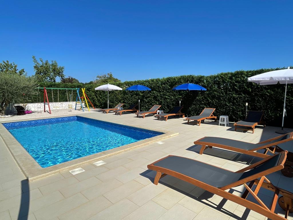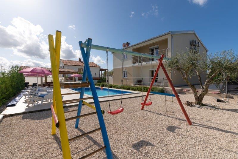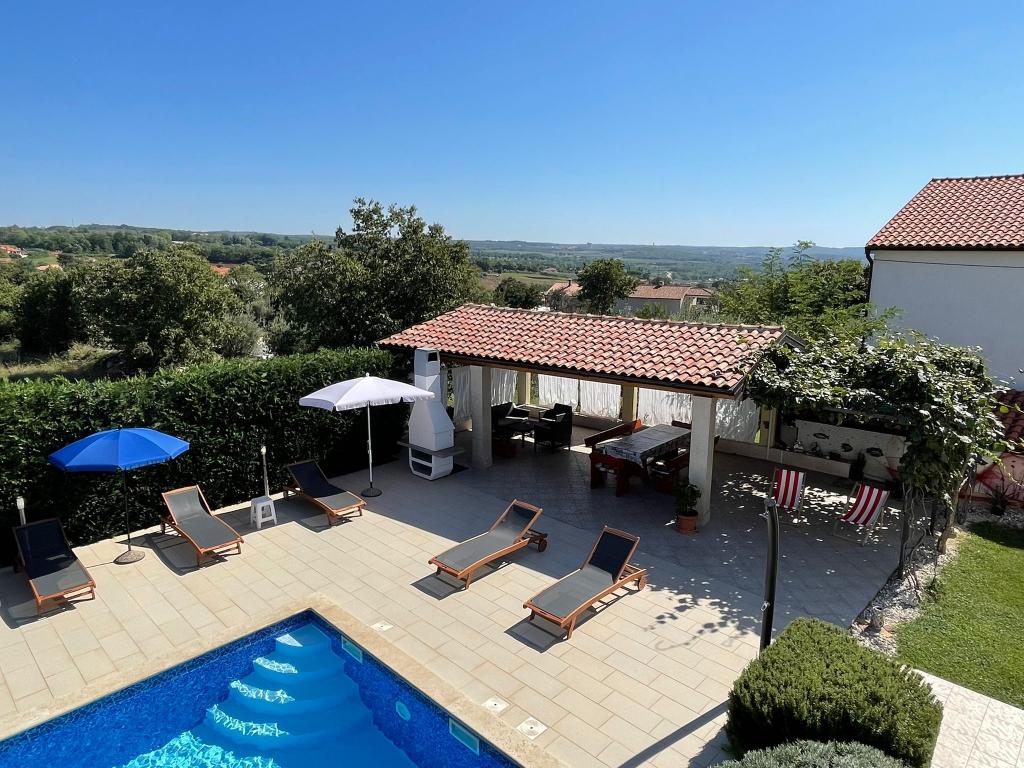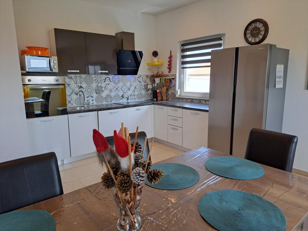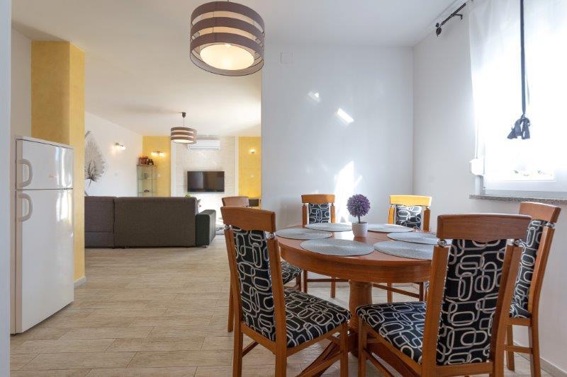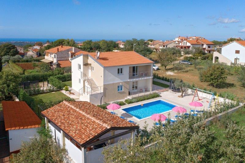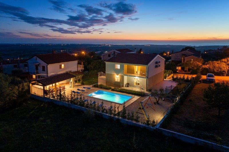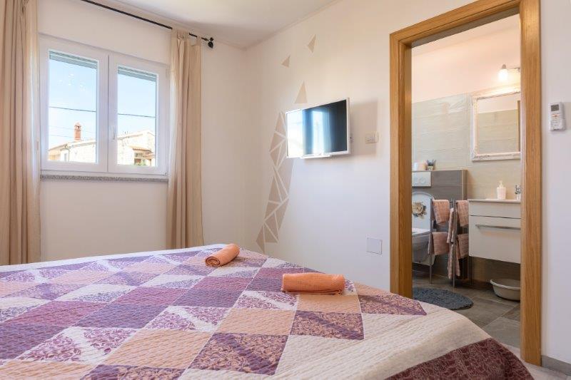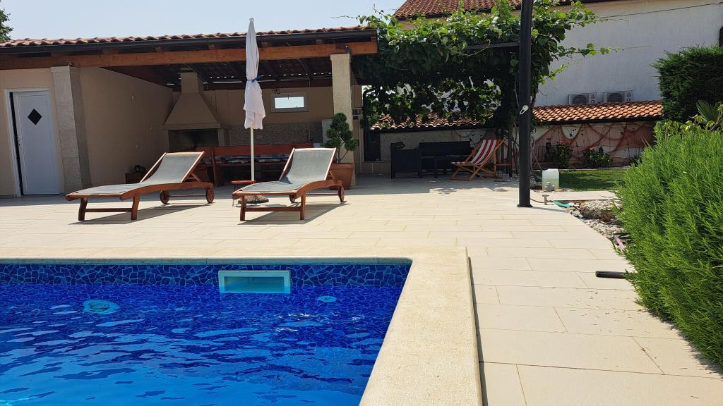 Ne aflăm în micul oraș Kaštelir, la 10 km de Poreč. Casa este formată din două apartamente separate, unul la parter, celălalt la primul etaj, casa este închiriată în întregime. Fiecare apartament este compus din living, bucatarie, doua dormitoare, fiecare cu baie proprie. Fiecare apartament are 3 aparate de aer conditionat, unul in living si unul in fiecare camera. Apartamentul este dotat cu tot ce este necesar pentru un sejur placut. În exterior există un loc de joacă pentru copii cu leagăne, o trambulină și o masă de tenis de masă. Curtea este complet împrejmuită, astfel încât să vă puteți aduce câinele, percepem o taxă de 12 euro pe zi pentru câini. In exterior mai avem o piscina de 8*4m, sezlonguri, umbrele de soare si o bucatarie de vara cu gratar. In fata apartamentului avem 6 locuri de parcare, dintre care 2 sunt acoperite Din cauza altor obligatii cu noi in lunile iulie si august se poate face rezervare doar de duminica pana duminica, iar in celelalte luni minimul este de 5 zile iar ora de sosire poate fi in orice zi a saptamanii. Casa este ideala pentru 8 persoane, dar poate gazdui si 10 persoane. Pentru o persoana suplimentara, avem o taxa de 25€ de persoana.