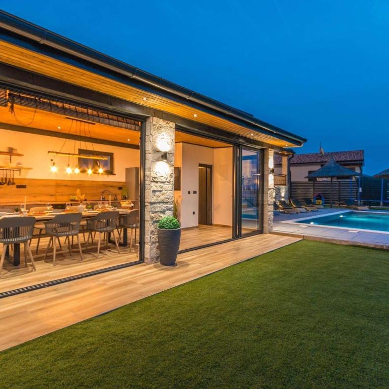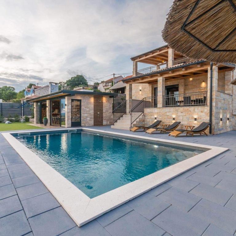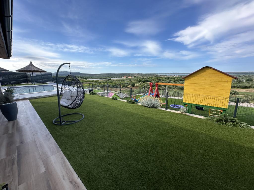 Într-un loc frumos, lângă Parcul Natural Lacul Vrana, se află Vila La Vrana. Locația unică a acestei proprietăți vă va lăsa fără suflare cu priveliștea sa pitorească asupra lacului și a mării. Cu o suprafață de 130 m2, poate găzdui 8 persoane în 3 dormitoare decorate modern. La primul etaj al vilei se află 2 dormitoare și o baie cu cadă. La parter se află un living decorat luxos, cu o priveliște frumoasă asupra împrejurimilor, o bucătărie decorată și utilată modern, cu o sală de mese. În living se află o canapea care poate servi drept pat suplimentar pentru 2 persoane. La parter se află, de asemenea, un dormitor cu pat dublu și o baie cu duș. În curtea vilei se află o piscină de 8x4 m, încălzită în pre-sezon și post-sezon, sunt disponibile șezlonguri și prosoape de piscină. Parcare gratuită, o stație de încărcare electrică pentru mașini, precum și un loc de joacă mare pentru copii în interiorul vilei. Lângă vilă vă puteți relaxa și pregăti mese delicioase în bucătăria de vară cu grătar complet utilat.